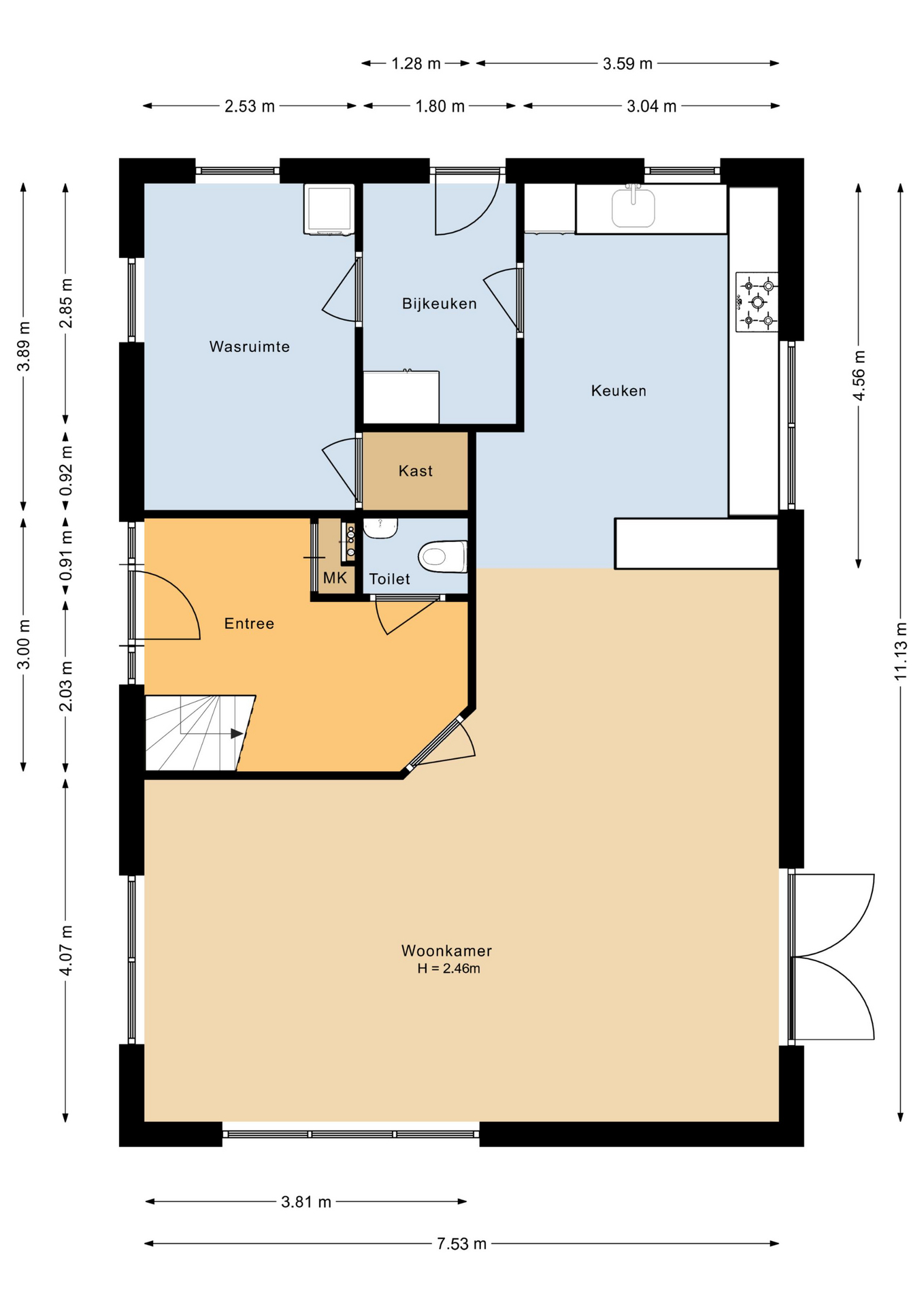 Entree/hal met de garderobe, meterkast, toiletruimte, trapopgang naar de verdieping en toegang naar de woonkamer. Een heerlijke ruime en open woonkamer met grote raampartijen (veel lichtinval), een sfeervolle houtkachel, een fraaie houten vloer en middels dubbele openslaande deuren toegang naar de fraai aangelegde tuin. Ruime opstelmogelijkheden voor een grote eettafel waar u heerlijk met uw familie kunt dineren. Aangrenzend de open inbouwkeuken in U-opstelling, welke voorzien is van de volgende apparatuur; een vaatwasser, combimagnetron, 5-pits gaskookplaat en een afzuigkap. Tussendeur naar de praktische bijkeuken met veel bergruimte en een deur naar één van de opritten. Aan de voorzijde is een wasruimte (ca. 10 m2) gerealiseerd met de aansluiting voor de wasmachine/droger en een ingebouwde kast. Deze ruimte kan ook eenvoudig worden aangepast naar een slaapkamer, waardoor gelijkvloers wonen tot de mogelijkheden behoort!