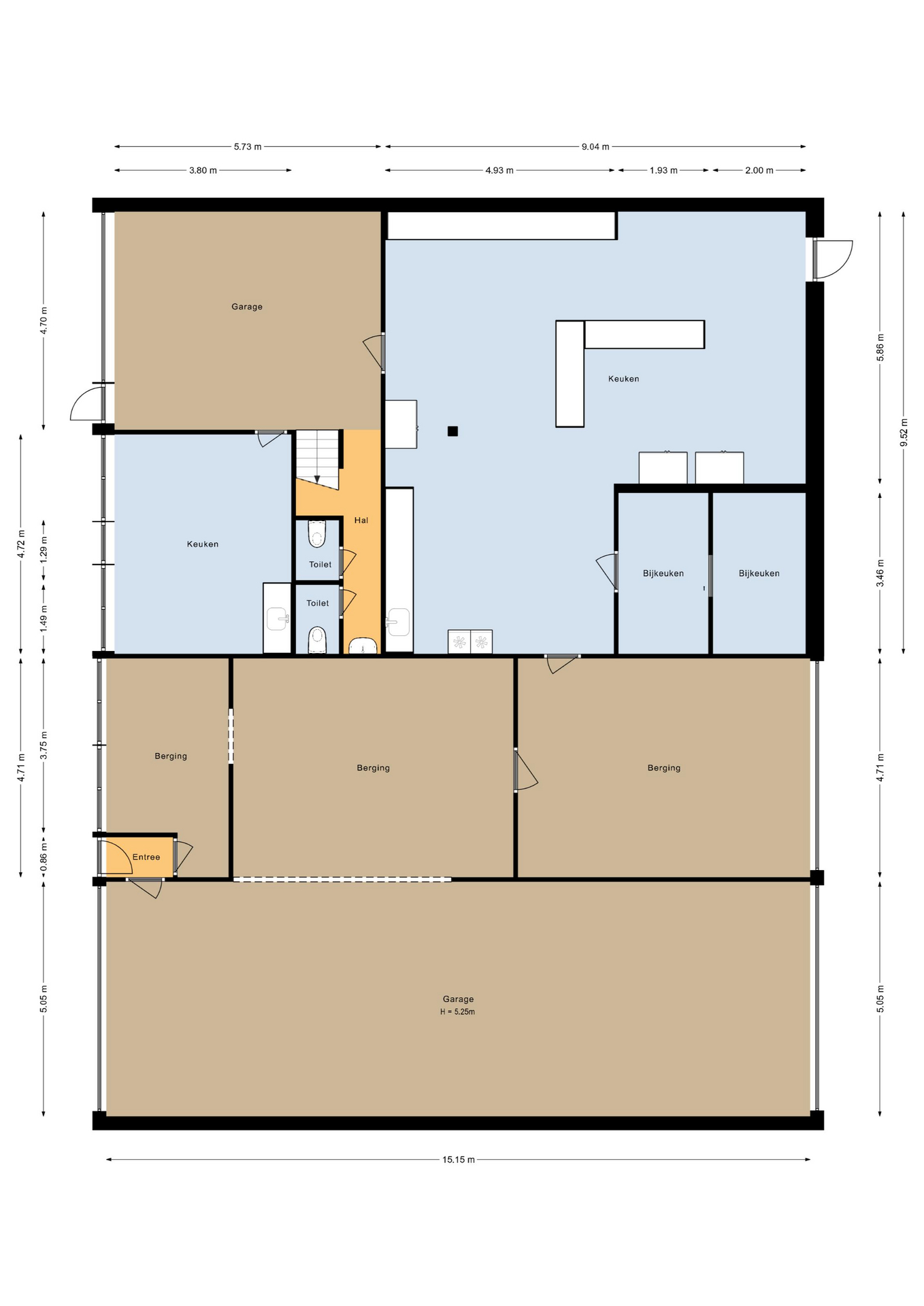 Entree met overheaddeur, garage/opslagruimte met aangrenzend 2 bergruimtes.