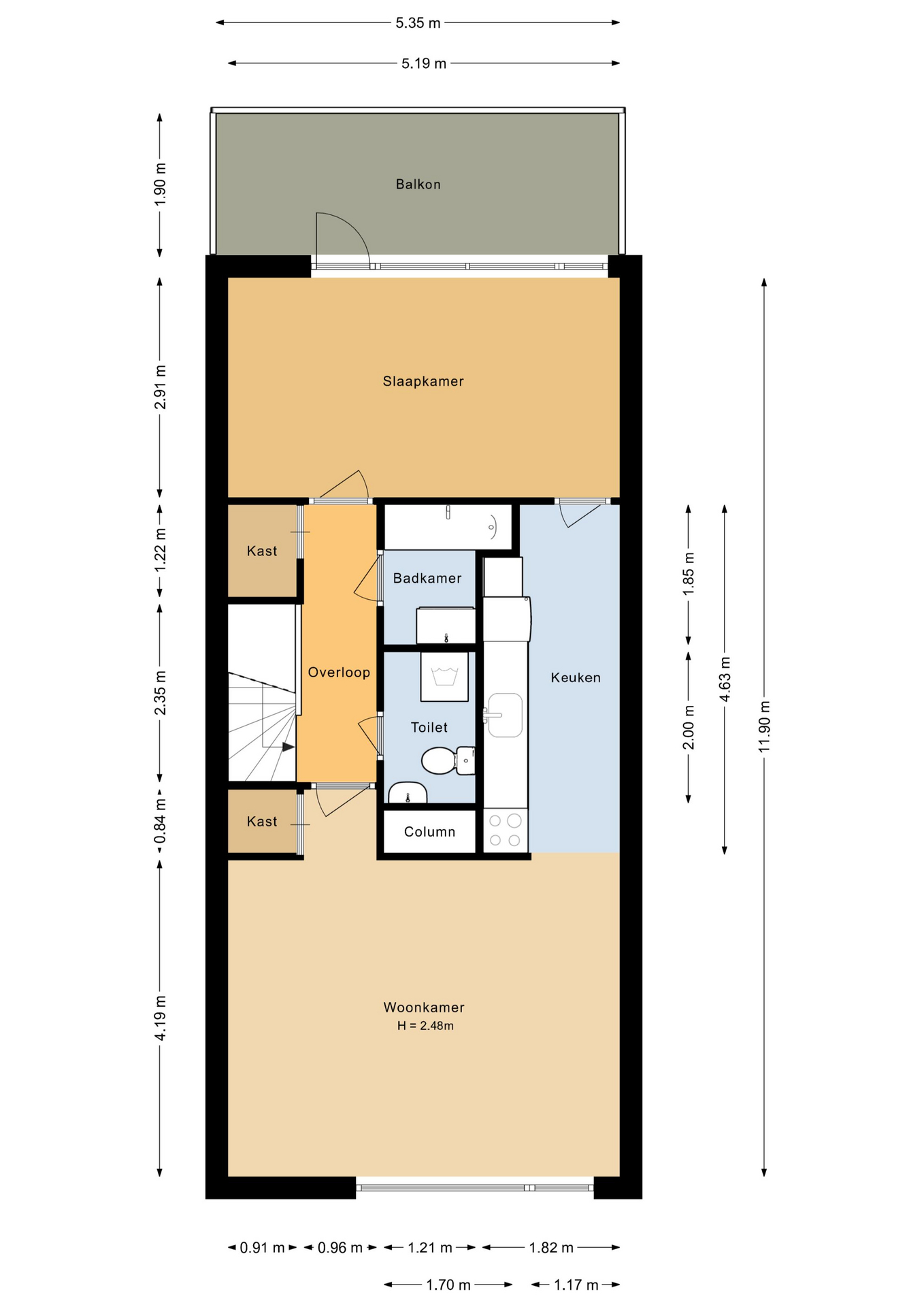 Bij binnenkomst in het appartement valt direct de prettige lichtinval en de ruimtelijke indeling op. De royale woonkamer biedt een heerlijk uitzicht over het marktplein. Dankzij de grote raampartijen profiteert u hier van veel natuurlijk licht, wat zorgt voor een open en aangename sfeer. De half open keuken grenst direct aan de woonkamer en biedt alle ruimte om naar eigen wens en smaak in te richten. Of u nu graag kookt of liever een snelle maaltijd bereidt: de indeling is praktisch en functioneel.