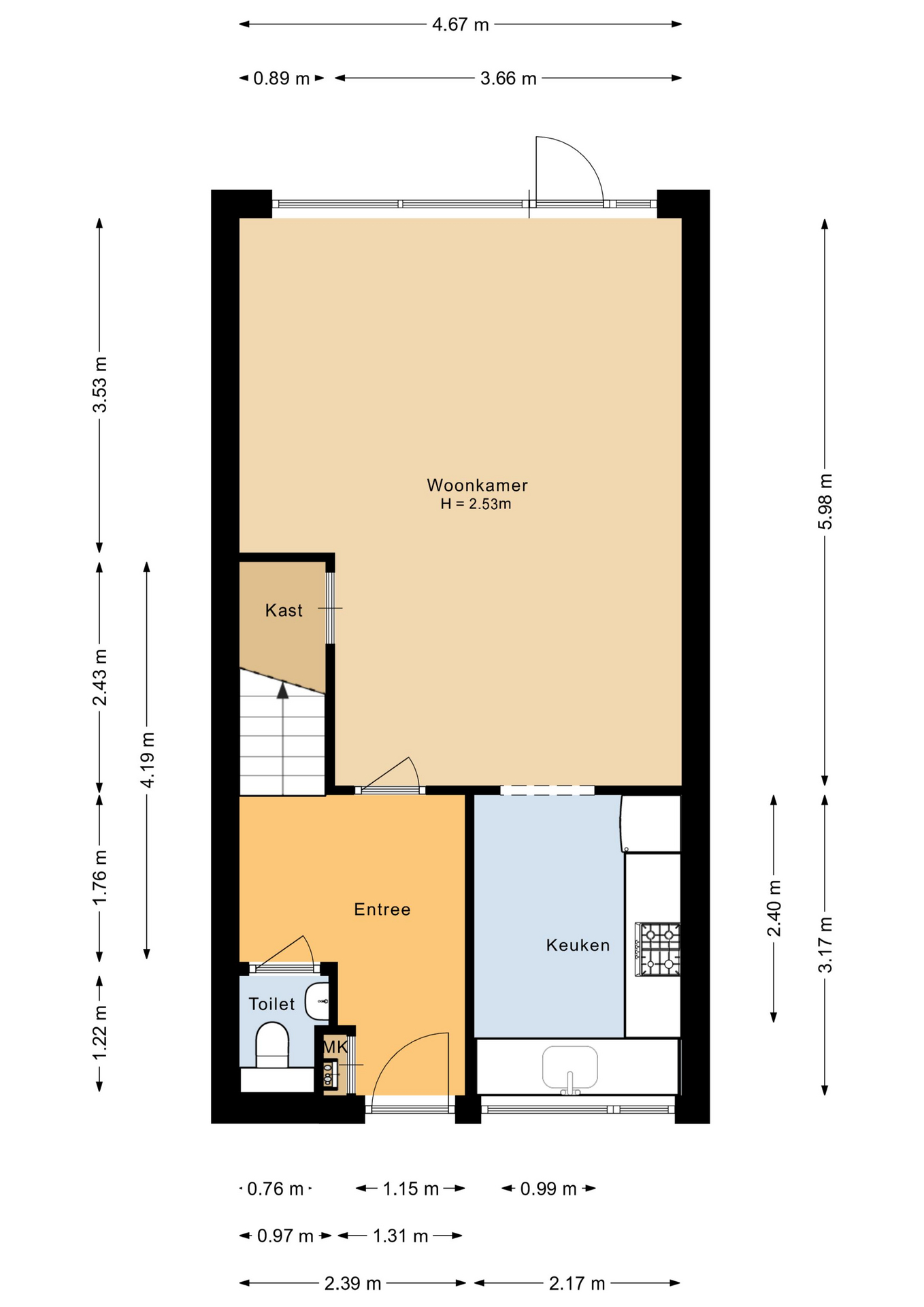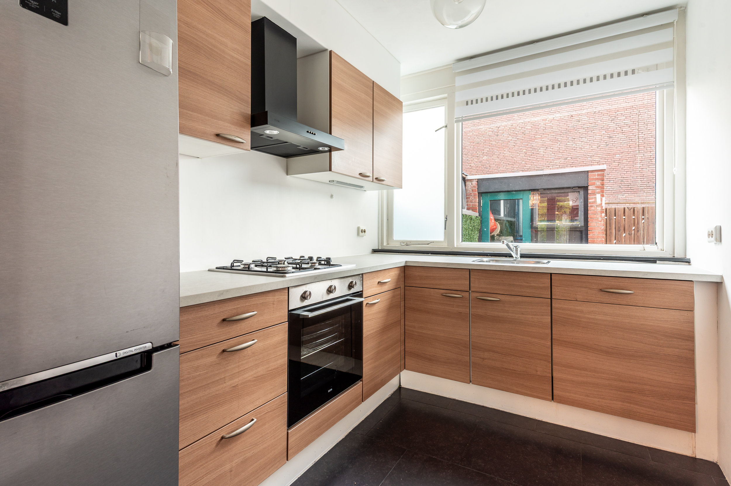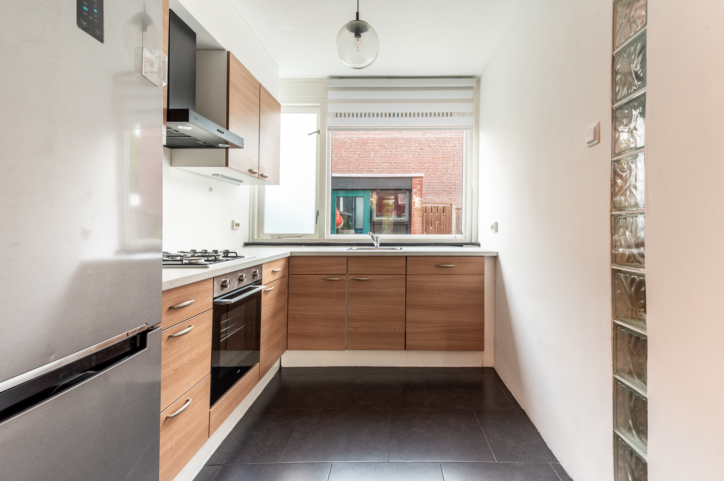 Entree, hal, toilet met fonteintje, ruime en lichte woonkamer (ca. 28 m²) met deur naar de tuin, trapkast, nette open keuken voorzien van diverse inbouwapparatuur.