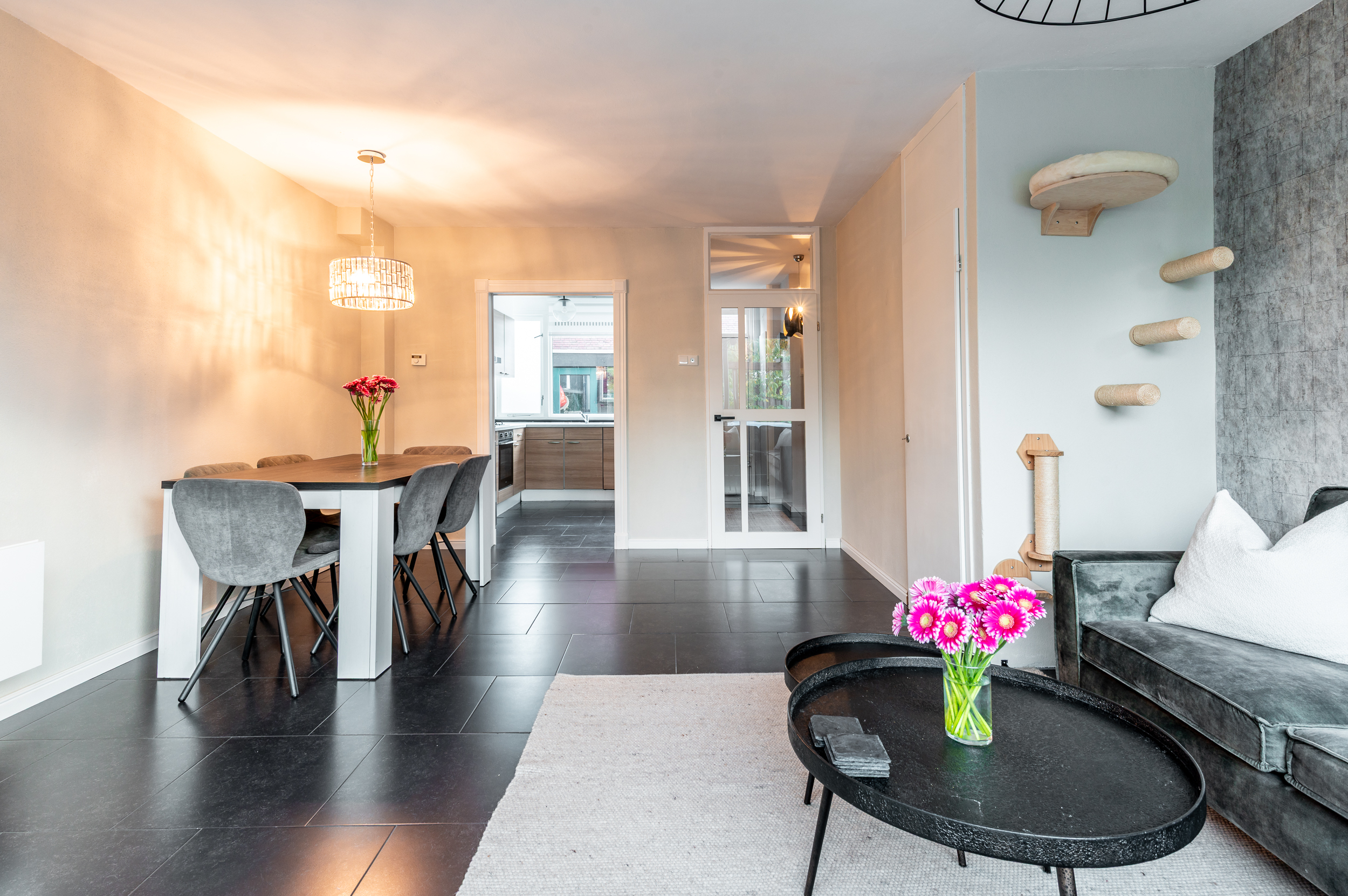 Bij binnenkomst wordt u verwelkomd in de lichte en ruime woonkamer. De nette open keuken sluit naadloos aan op de woonkamer en is voorzien van vloerverwarming, wat bijdraagt aan het wooncomfort.