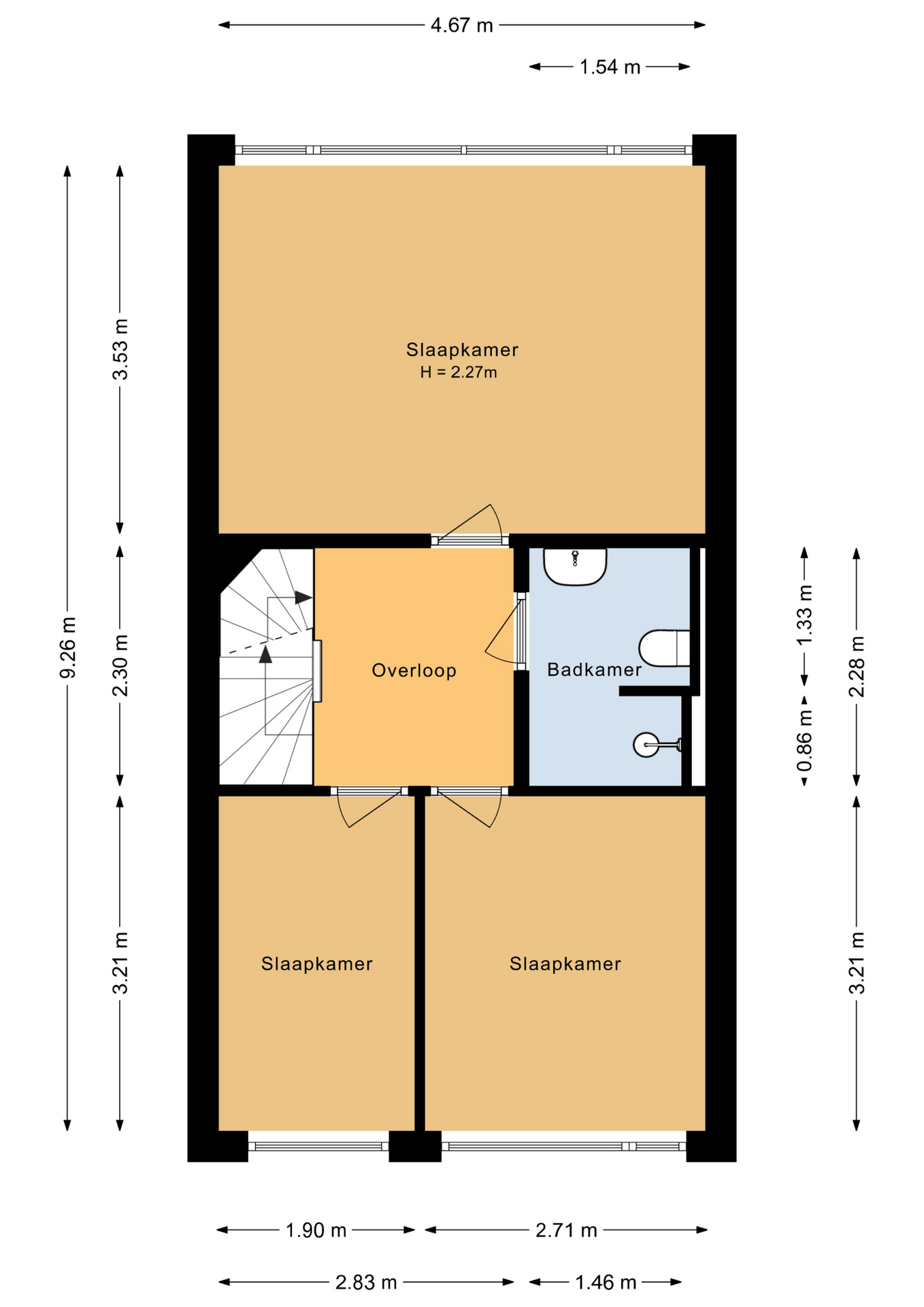 Overloop, slaapkamer 1 (ca. 16 m²), slaapkamer 2 (ca. 9 m²), slaapkamer 3 (ca. 6 m²), badkamer voorzien van wastafel met meubel, toilet en inloopdouche.