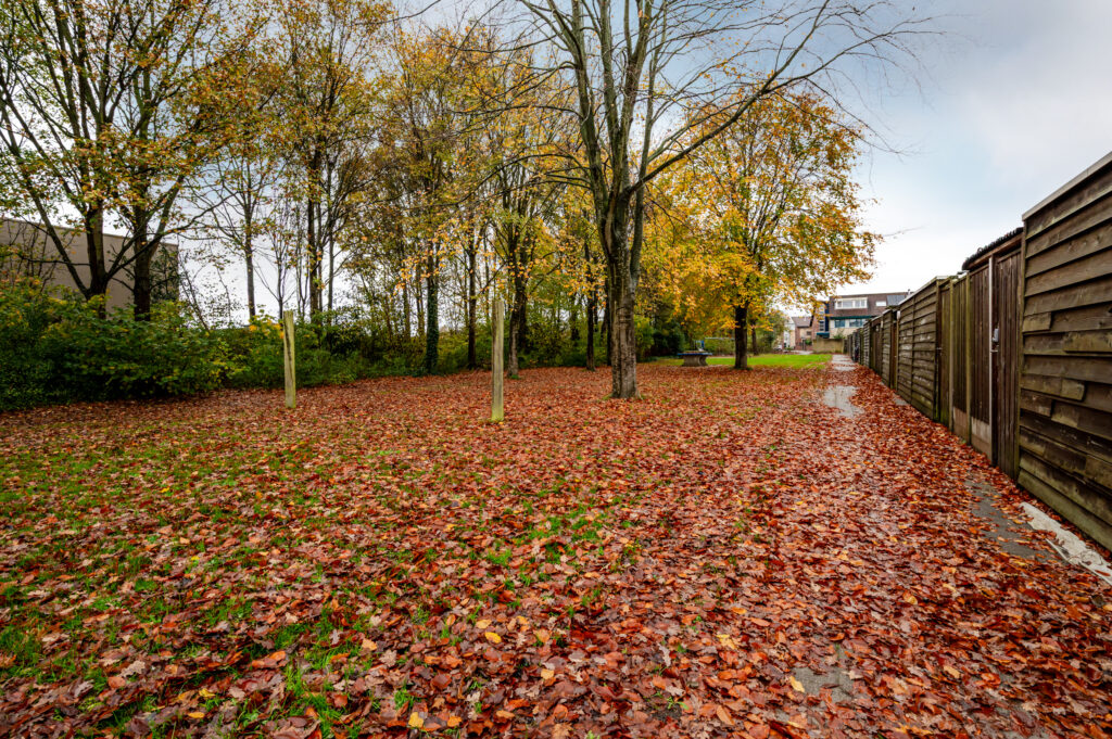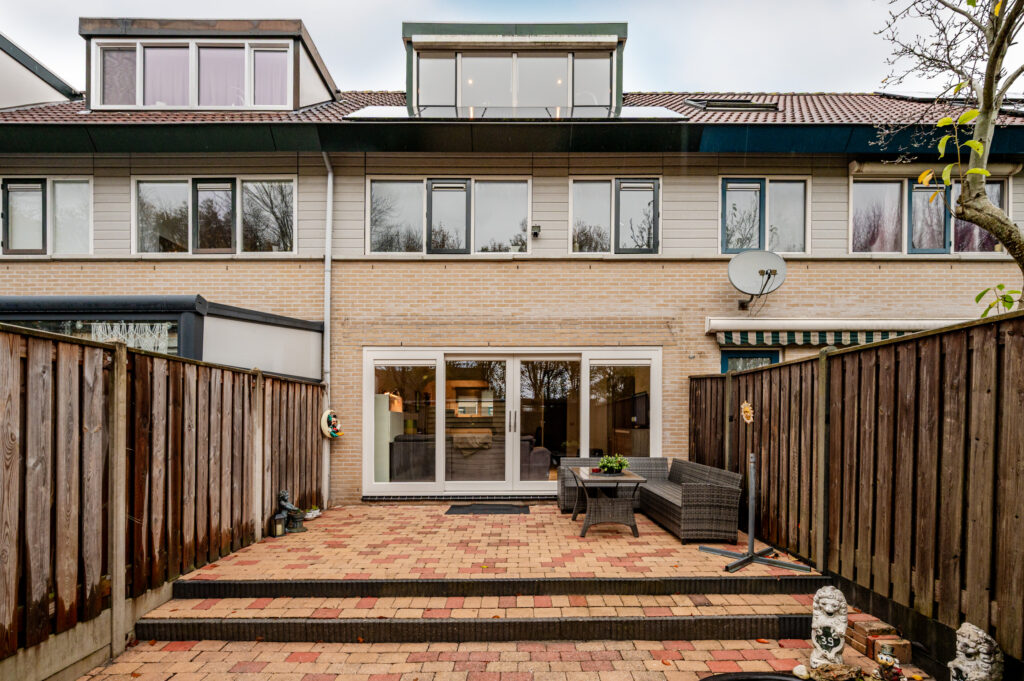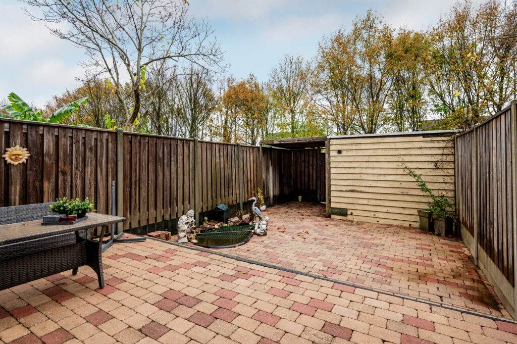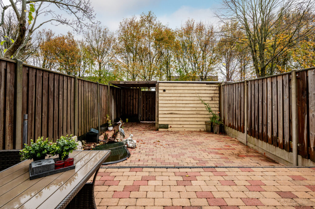 De achtertuin (11x6 meter) is gelegen op het zuidoosten en is volledig betegeld. U geniet hier van de volle privacy daar u geen achterburen heeft. Achterop het perceel staat nog een vrijstaande houten berging (ca. 8 m²).