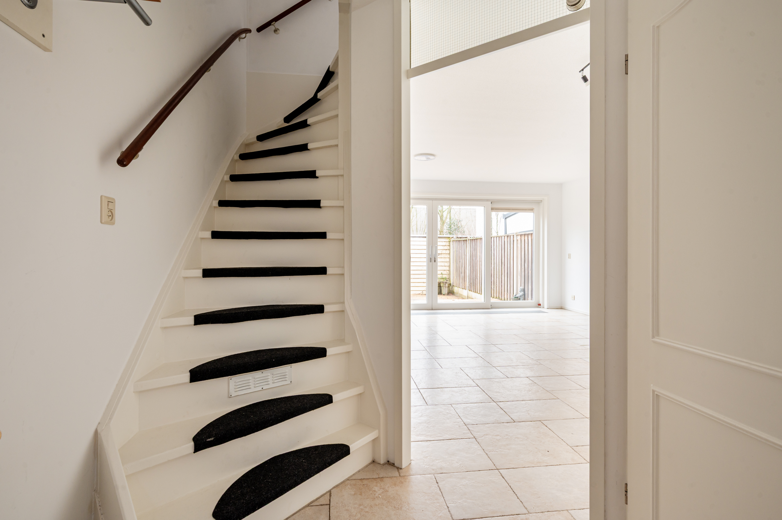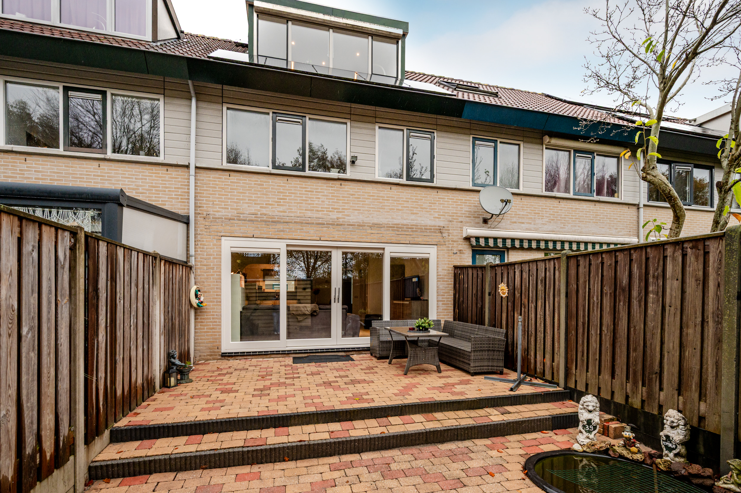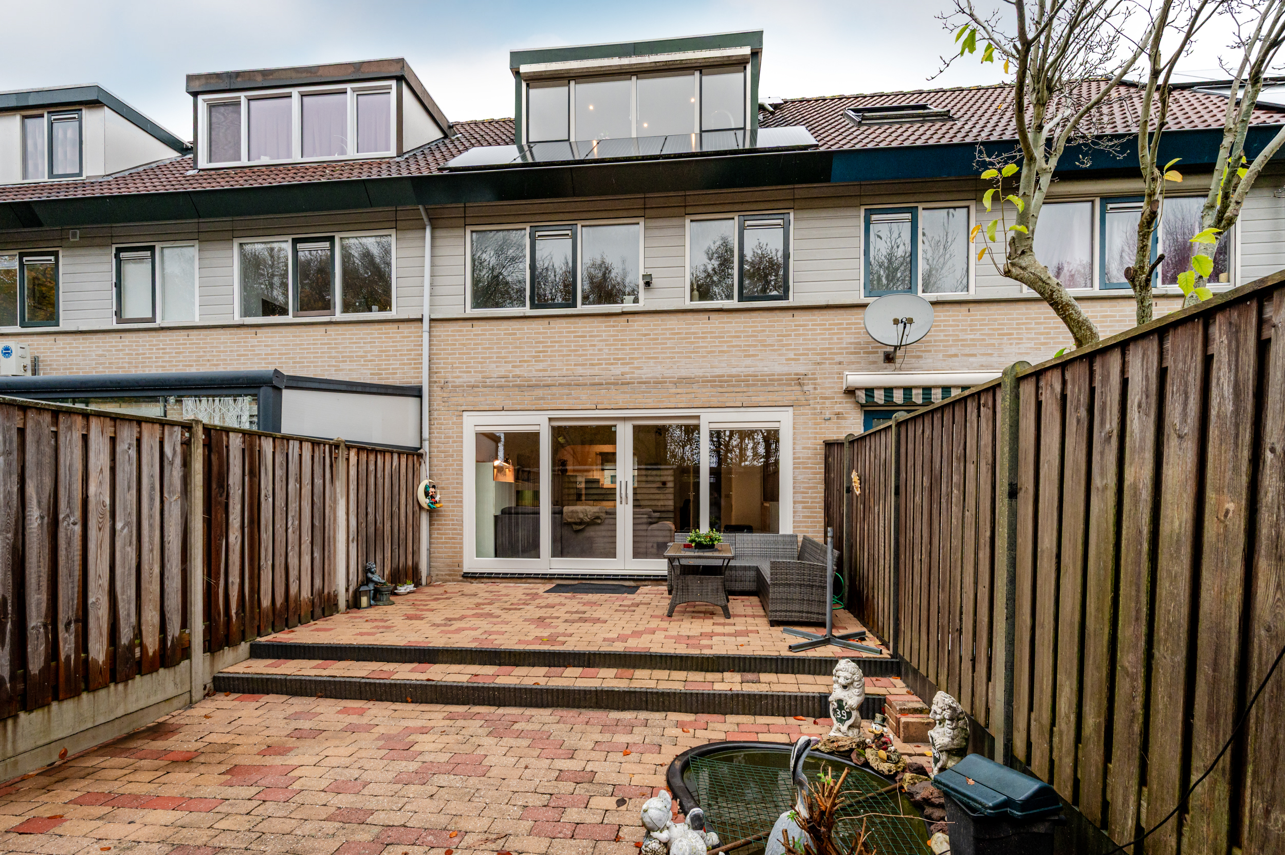 De achtertuin (11x6 meter) is gelegen op het zuidoosten en is volledig betegeld. U geniet hier van de volle privacy daar u geen achterburen heeft. Achterop het perceel staat nog een vrijstaande houten berging (ca. 8 m²).