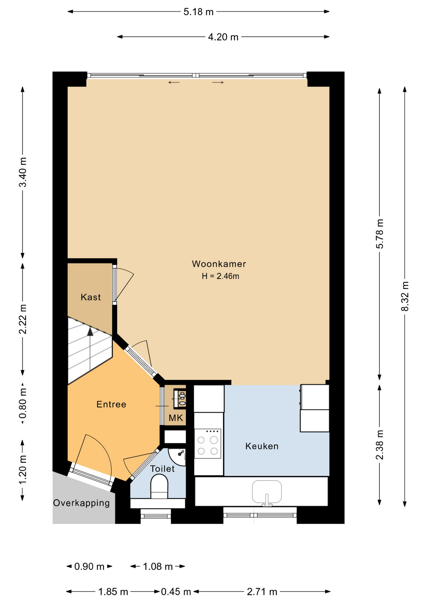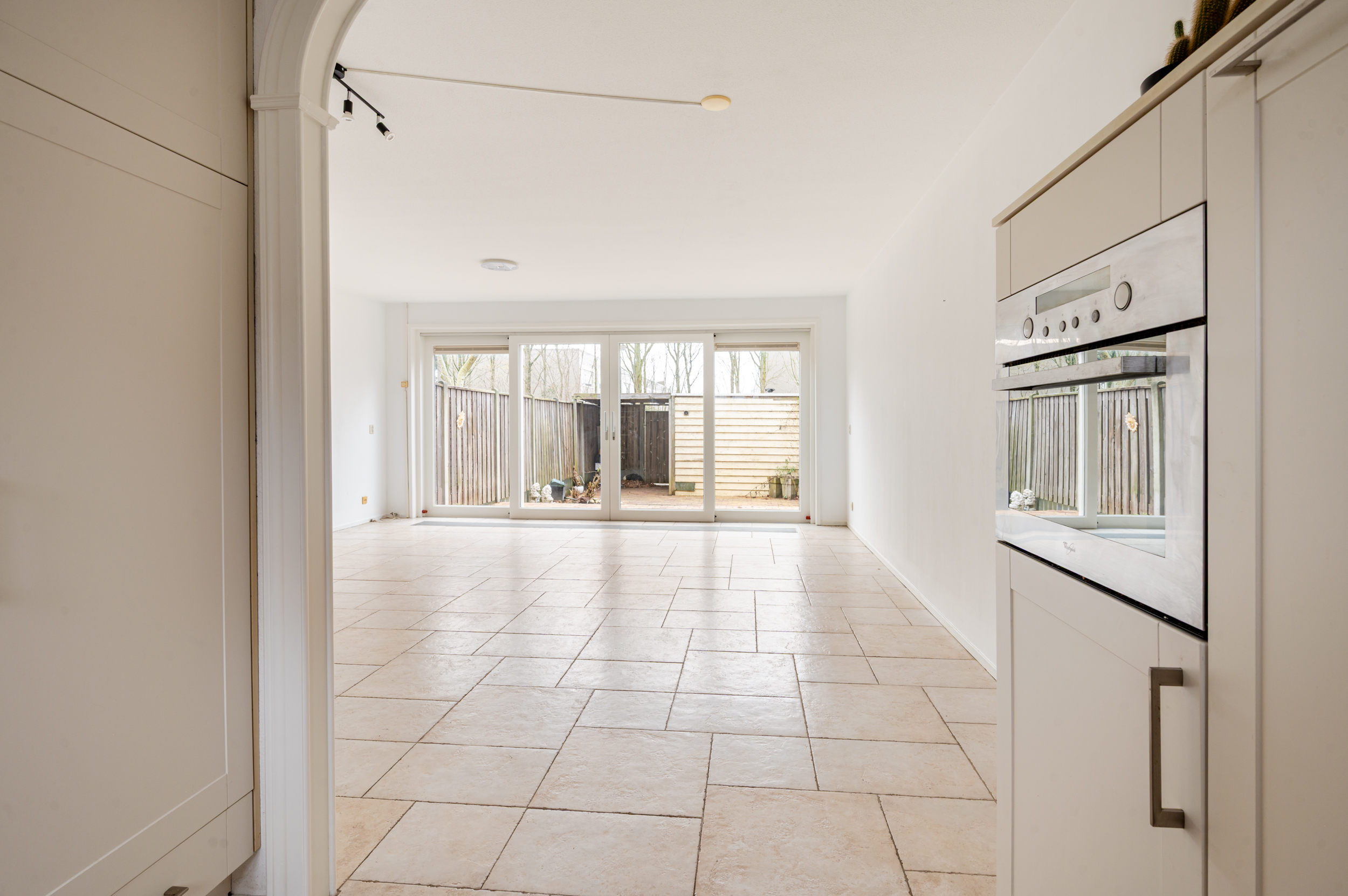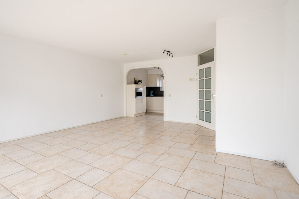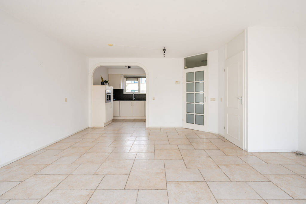 Overdekte entree, hal, toilet met fonteintje, ruime en licht woonkamer (ca. 28 m²) met trapkast, schuifpui naar de tuin, half open moderne keuken voorzien van granietblad.