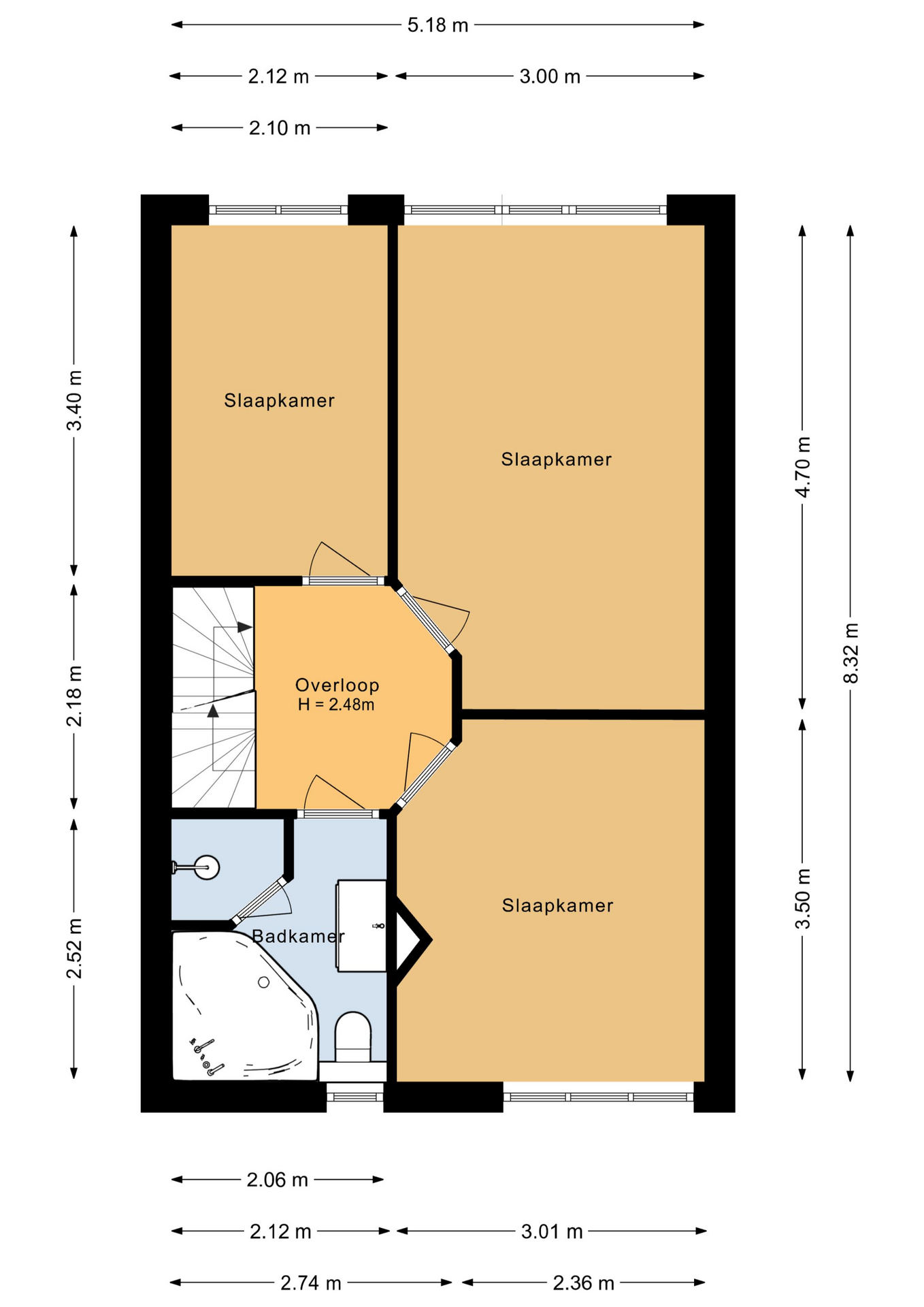 Overloop, slaapkamer 1 (ca. 14 m²), slaapkamer 2 (ca. 11 m²), slaapkamer 3 (ca. 7 m²), badkamer voorzien van wastafel met meubel, douche, toilet, ligbad en natuurlijke ventilatie.