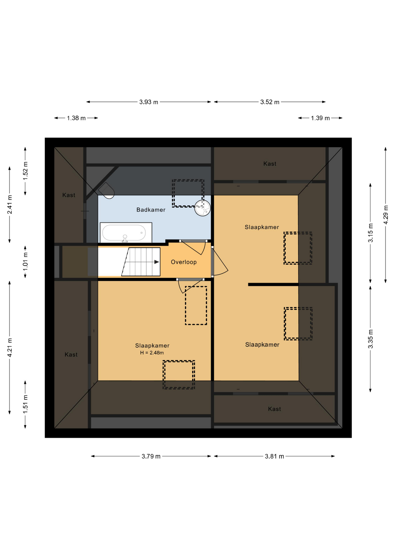 Overloop met toegang tot 2 ruime slaapkamers, allen voorzien van een dakraam en praktische bergruimte achter de knieschotten, waarbij de ouderslaapkamer over de volle lengte van de woning. De ouderslaapkamer is bijzonder ruim te noemen en kan eenvoudig worden opgedeeld in 2 slaapkamers. De moderne 2e badkamer (2023) is voorzien van een ligbad, wastafelmeubel, 3e toilet, een designradiator en een raam voor de natuurlijke ventilatie. De verdieping is voorzien van een fraaie laminaatvloer (2009).