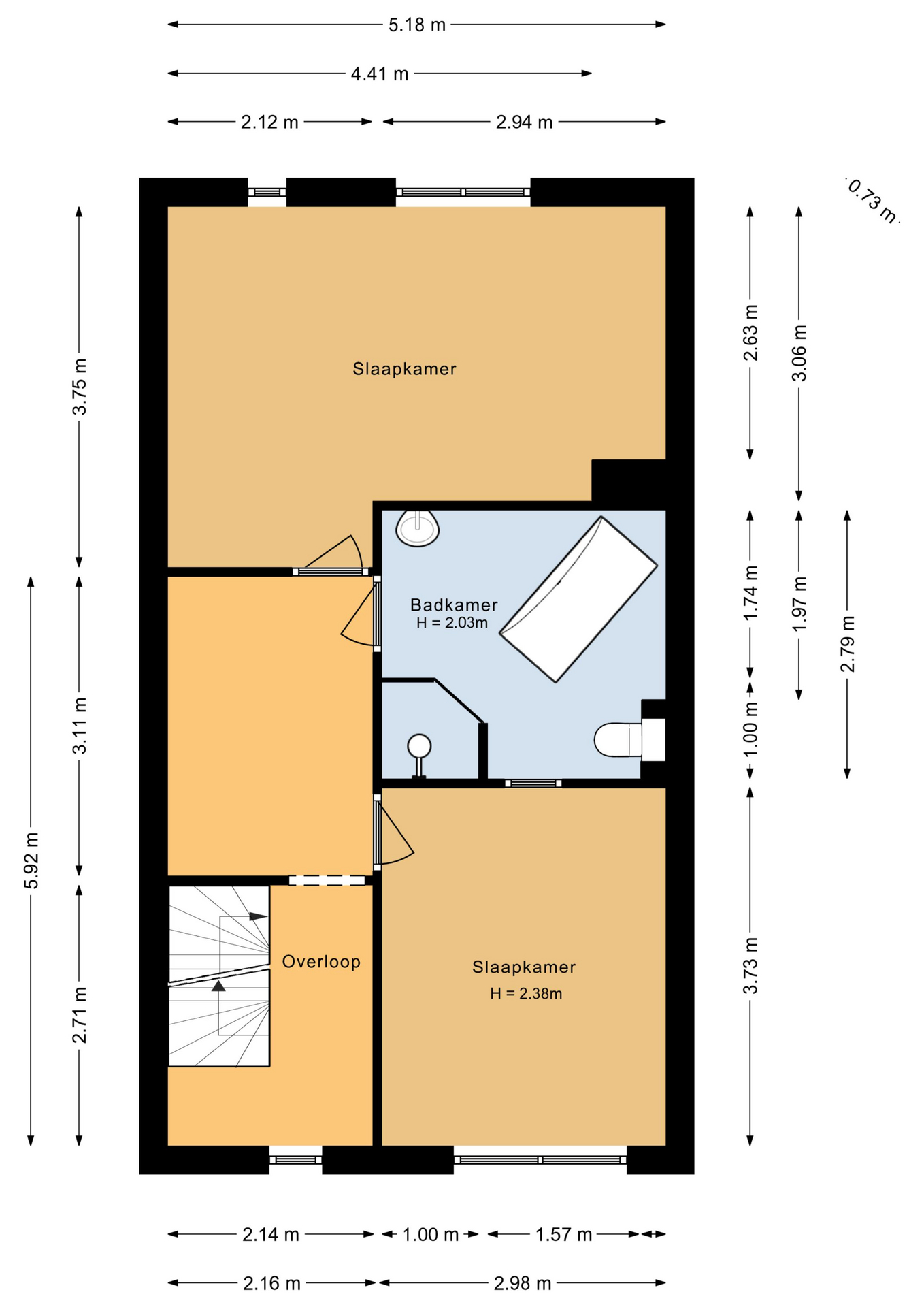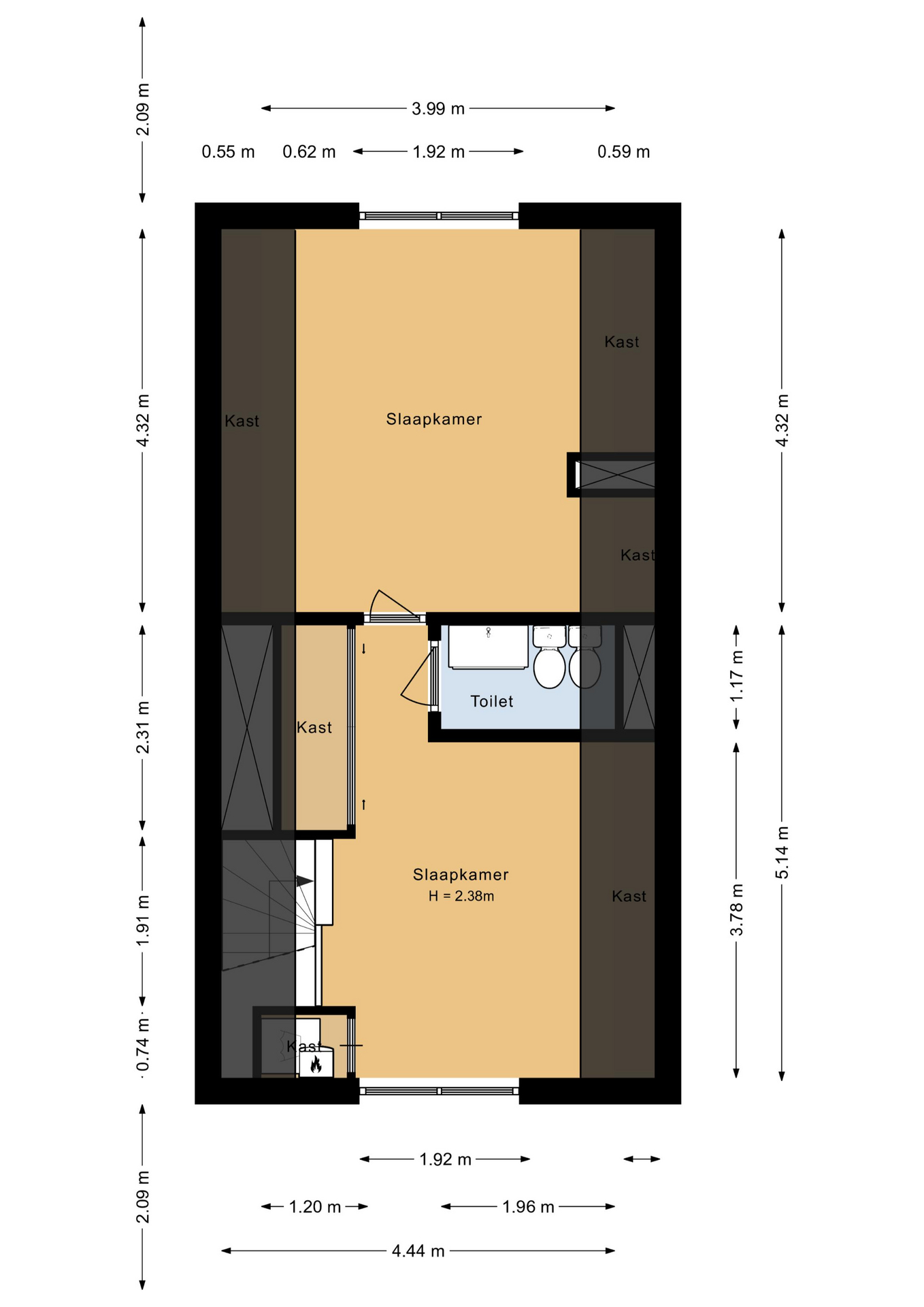 Overloop met een praktische werkruimte, kastenwand en toegang tot 2 ruime slaapkamers (ca. 17 en 11 m2), waarvan 1 over de volle breedte van de woning. Vergrootte badkamer met een ligbad, douche, 2e toilet, wastafelmeubel en een designradiator. De verdieping is voorzien van een laminaatvloer.