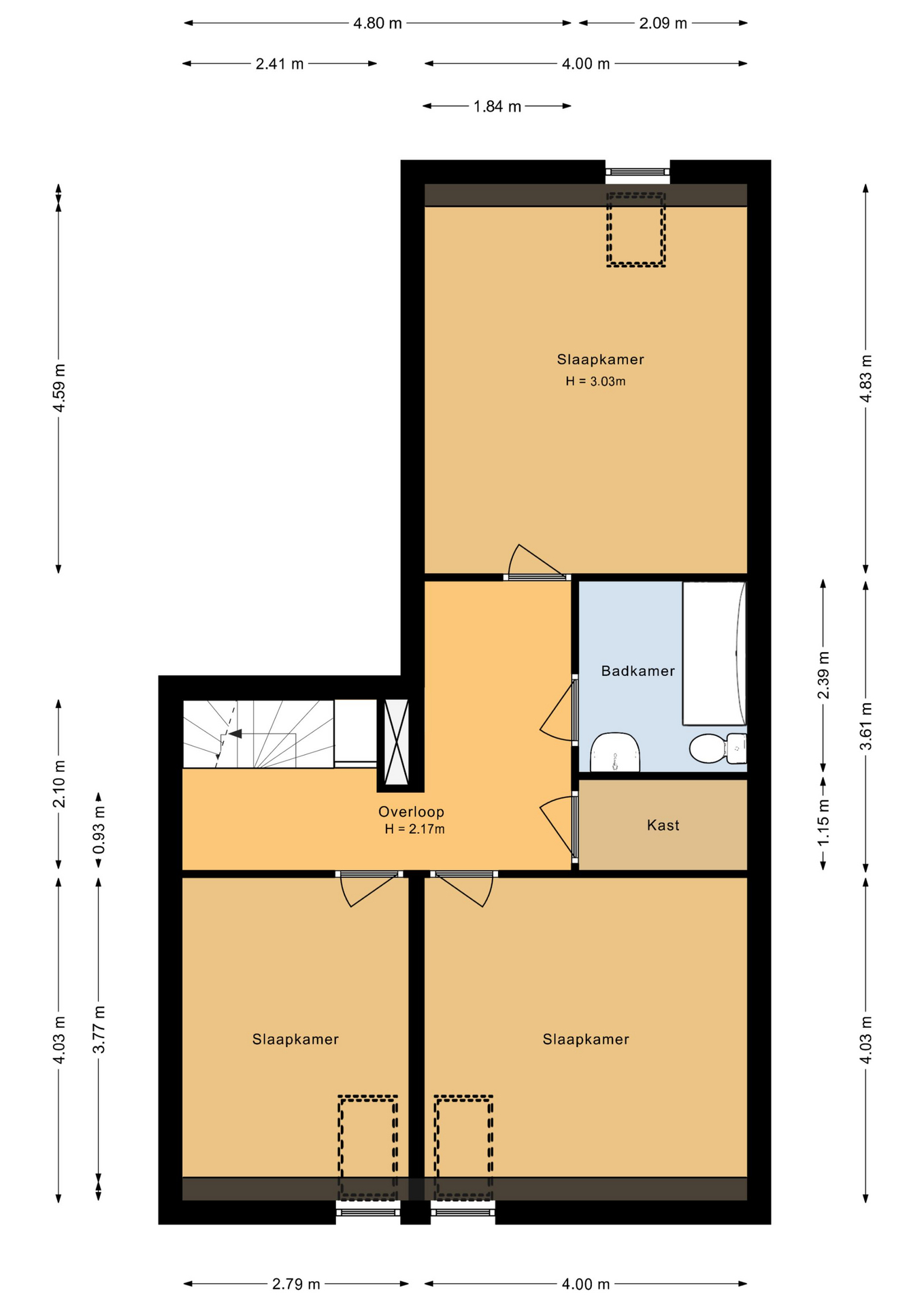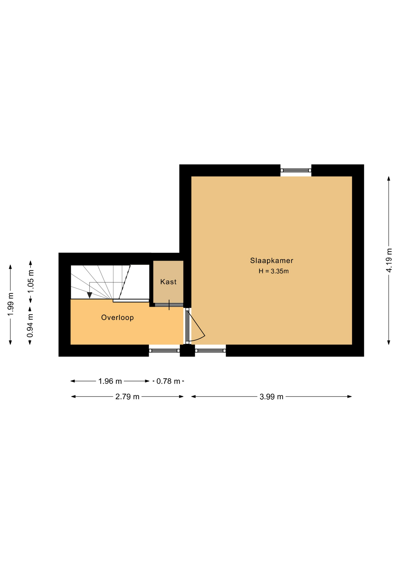 Overloop, aparte ruimte met CV-ketel, ruime vierde slaapkamer (ca. 17 m²).
