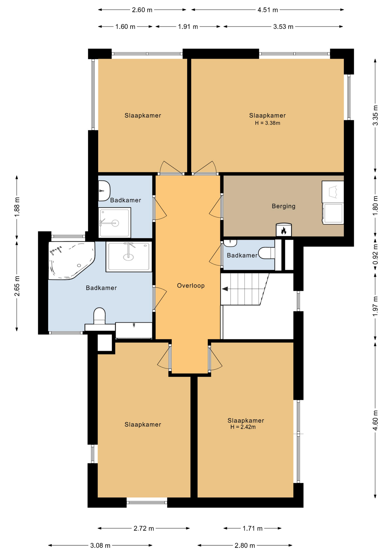 Ruime overloop, separaat toilet met fonteintje, slaapkamer 1 (ca. 15 m²), slaapkamer 2 (ca. 13 m²), slaapkamer 3 (ca. 12 m²), slaapkamer 4 (ca. 9 m²), de eerste badkamer is voorzien van een wastafel met meubel, ligbad, inloopdouche en toilet, de tweede badkamer is voorzien van een wastafel en inloopdouche, aparte ruimte met opstelling wassen/drogen en CV-ketel.