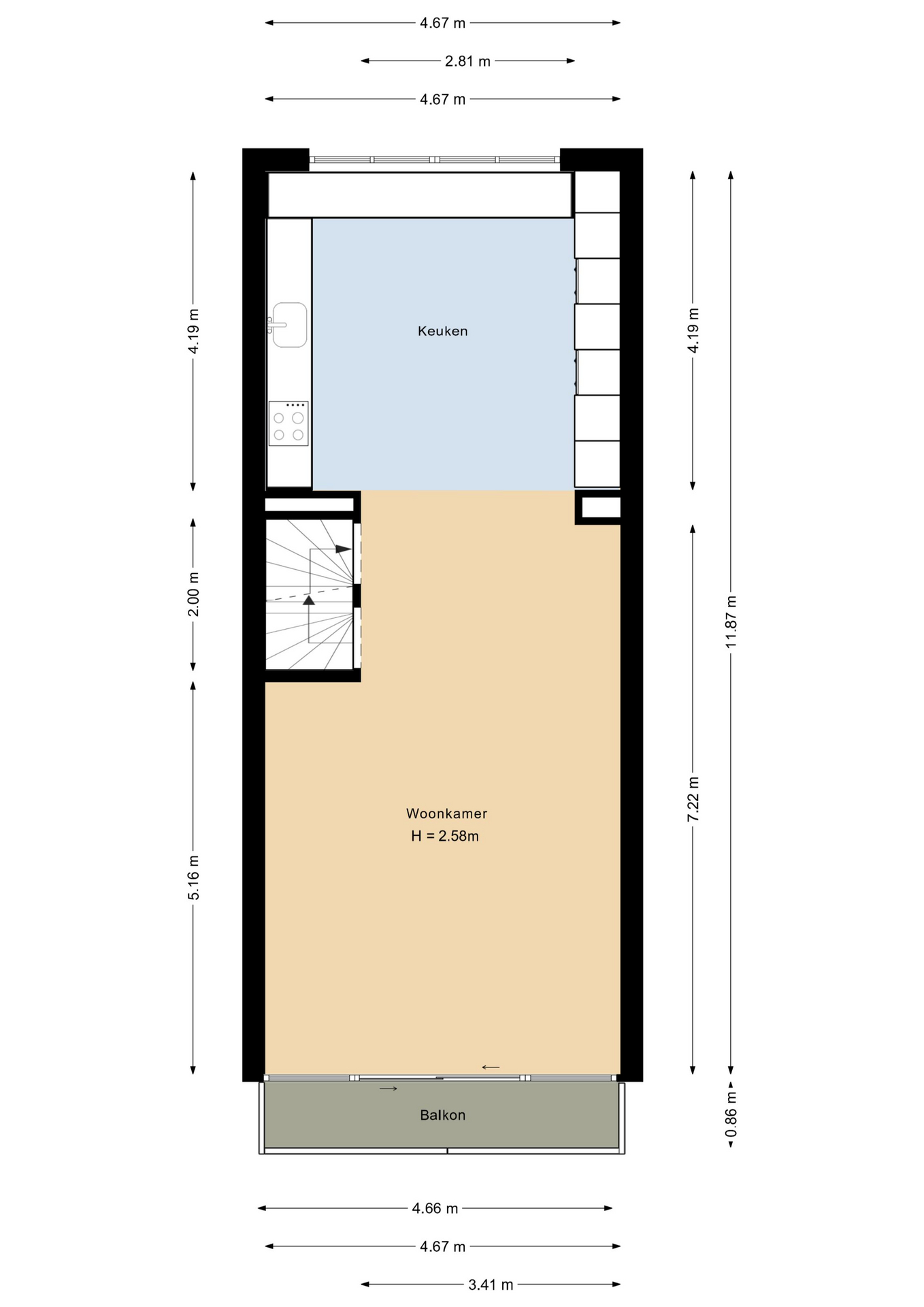 Ruime, uitgebouwde woonkamer (ca. 34 m²) met veel lichtinval en een open keuken met volop werk- en opbergruimte. De keuken (2014) is uitgerust met diverse inbouwapparatuur: koelkast, vriezer, oven, magnetron, vaatwasser en elektrische kookplaat met afzuigkap. Via een schuifpui is het balkon aan de voorzijde bereikbaar. Ook deze verdieping is voorzien van vloerverwarming en een nette tegelvloer.