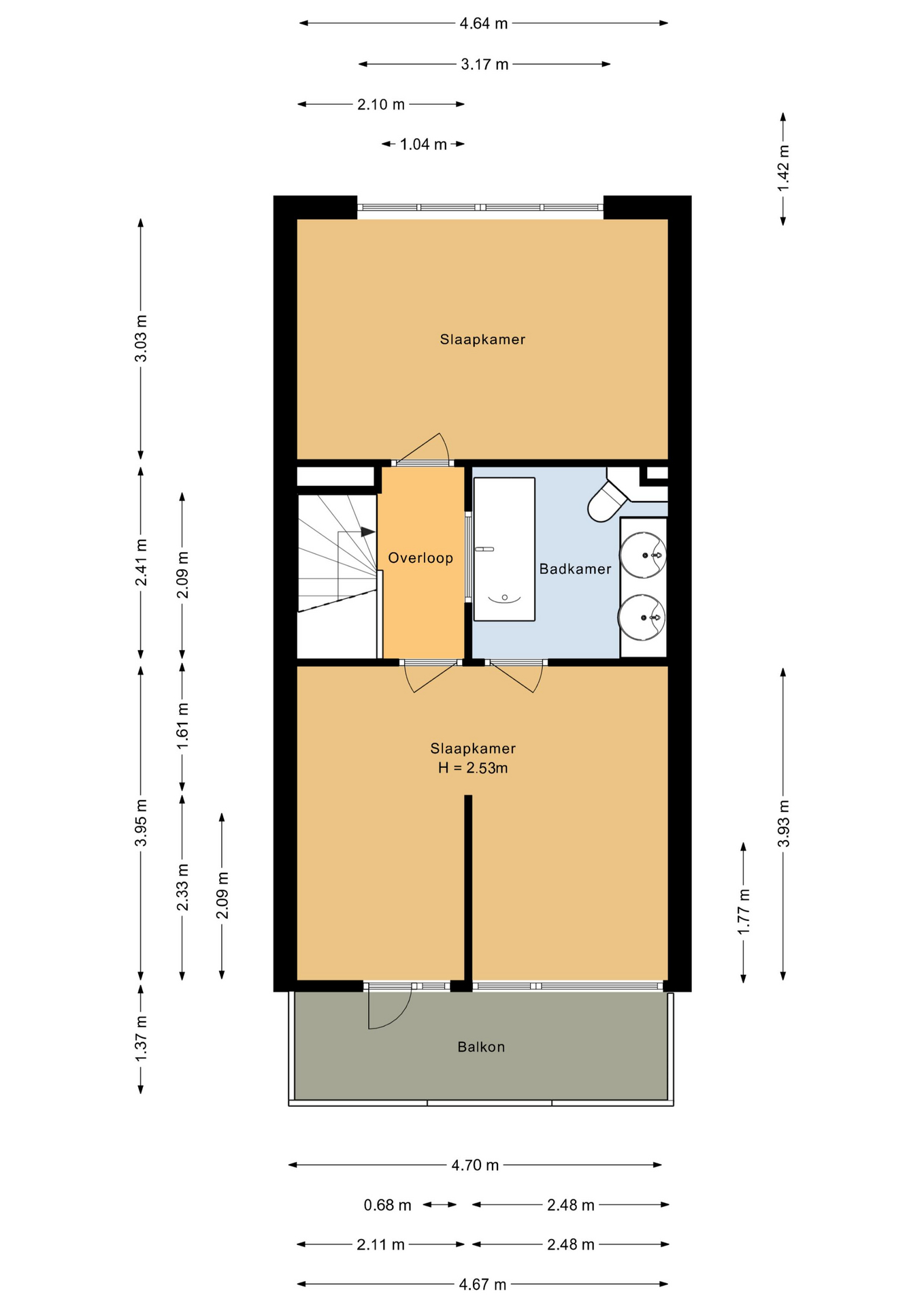 Overloop met toegang tot twee royale slaapkamers over de volledige breedte van de woning (ca. 18 m² en 14 m²). De slaapkamer aan de voorzijde – voorheen twee kamers – biedt toegang tot het balkon en de tweede badkamer. Deze moderne badkamer (2014) beschikt over een whirlpool met douchecabine, dubbele wastafel, toilet, radiator en een lichtkoepel die zorgt voor prettig natuurlijk licht. De verdieping is voorzien van vloerverwarming en afgewerkt met een nette tegelvoer.