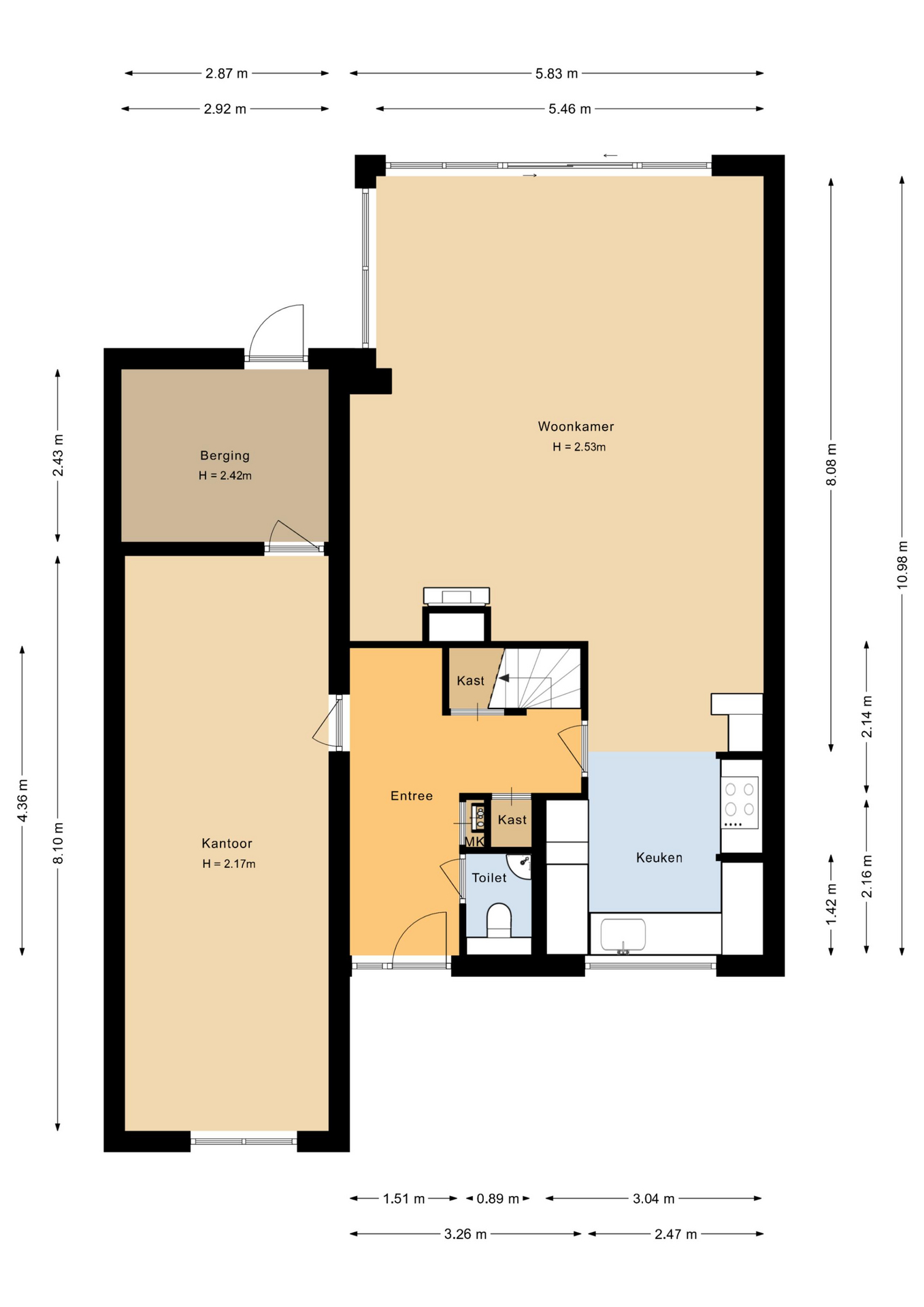 Entree/hal met meterkast, toilet (2014), vaste kast, trapkast, garderobe en trapopgang naar de eerste verdieping. Vanuit de hal is binnendoor toegang tot de voormalige garage, die is voorzien van een kunststof pui en is omgebouwd tot een geïsoleerde en verwarmde kantoorruimte. Vanuit het kantoor is tevens de berging bereikbaar.