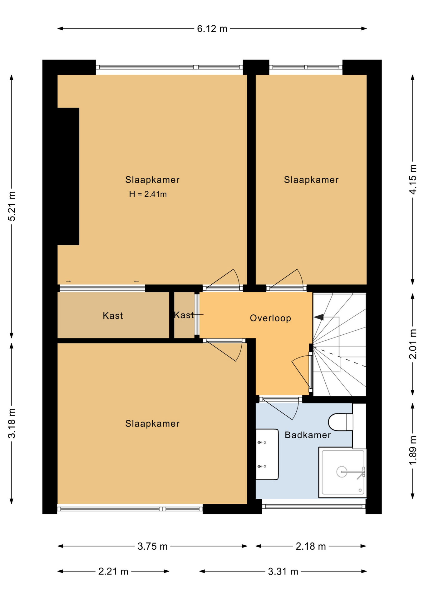 Op de eerste verdieping bevinden zich drie goed bemeten slaapkamers, die allemaal licht en comfortabel zijn. De master bedroom is bijzonder ruim en biedt volop mogelijkheden voor het inrichten van een persoonlijke, ontspannen ruimte. De overige slaapkamers zijn perfect voor kinderen, een thuiskantoor of een hobbyruimte. De badkamer op deze verdieping is functioneel met een wastafel met meubel, douche en toilet.