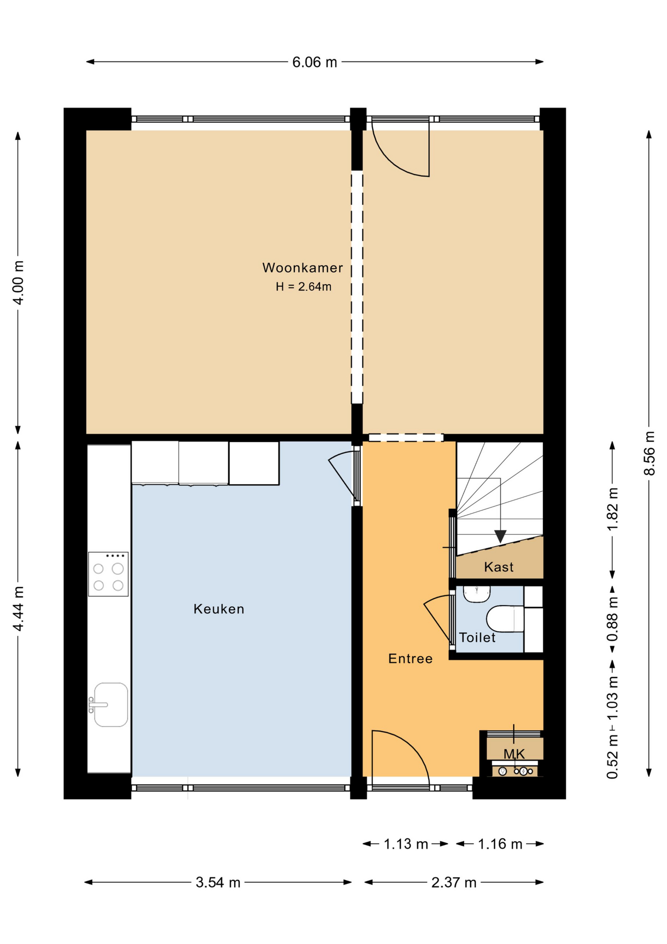 Entree/hal met de meterkast (2022), garderobe, toiletruimte (2018), bergkast, trapopgang naar de verdieping en toegang tot de keuken en woonkamer. Ruime tuingerichte woonkamer van 6.06 m. breed met grote raampartijen (veel lichtinval!) en een deur naar de tuin. Aan de voorzijde bevindt zich de fraaie inbouwkeuken (2022) in hoekopstelling, welke voorzien is van de volgende apparatuur; koelkast, vriezer, vaatwasser, oven, combimagnetron, 4-pits inductiekookplaat en een afzuigkap. Ruime opstelmogelijkheden voor een grote eettafel waar u heerlijk met uw familie kunt dineren. De begane grond is voorzien van glad gestuukte wanden en plafonds en een fraaie tegelvloer (2018) met vloerverwarming (2018).