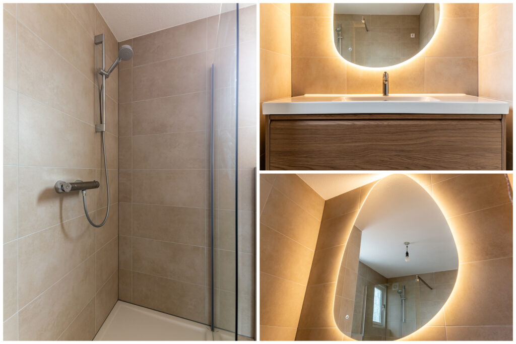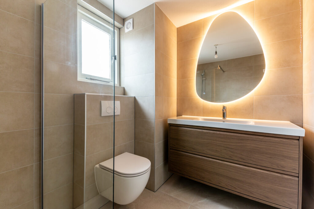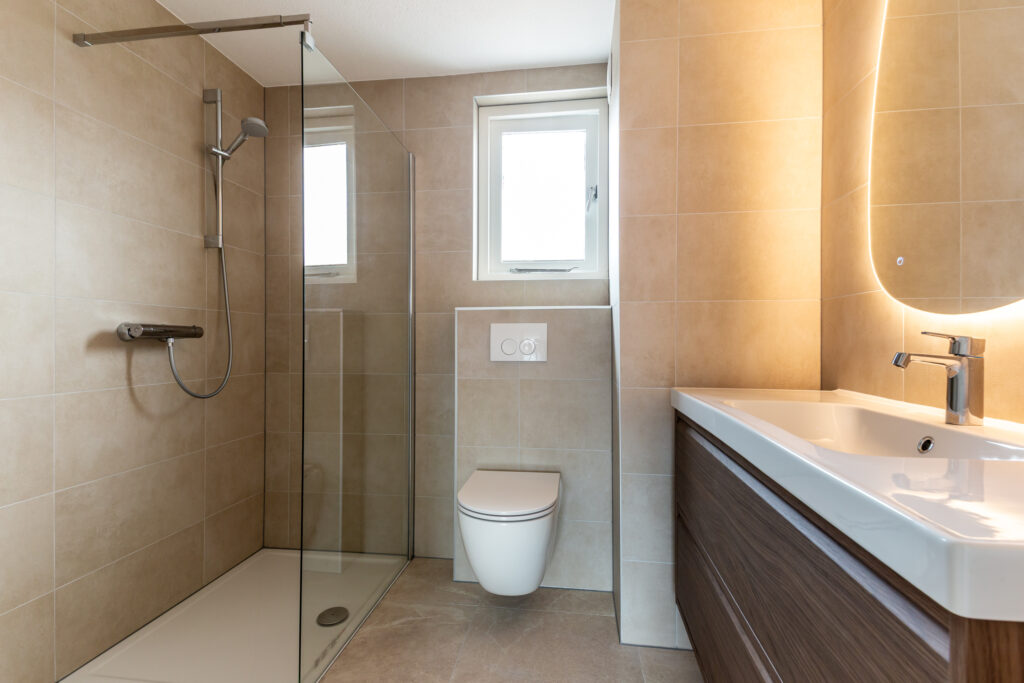 Overloop, slaapkamer 1 (ca. 14 m²), slaapkamer 2 (ca. 10 m²), slaapkamer 3 (ca. 9 m²), moderne badkamer voorzien van inloopdouche, toilet, wastafel met meubel en natuurlijke/mechanische ventilatie.