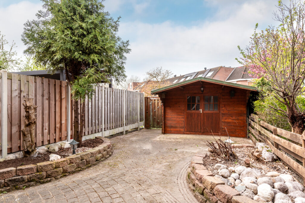 De voortuin ligt op het noordoosten en is volledig betegeld. Parkeren doet u eenvoudig op eigen terrein. Vanuit de voortuin heeft u tevens toegang tot de aangebouwde berging (ca. 8 m²).