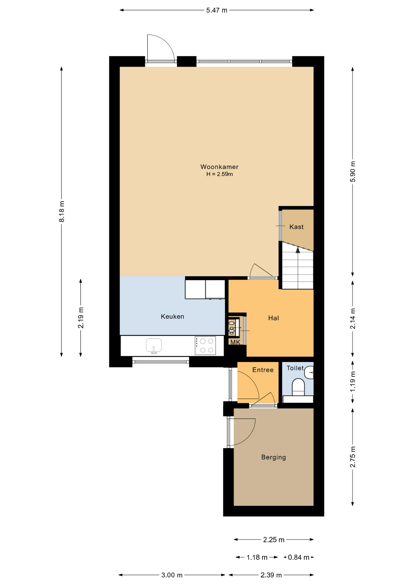 Entree, hal, toilet met fonteintje, ruime en lichte woonkamer (ca. 32 m²) met deur naar de tuin, trapkast, moderne halfopen keuken voorzien van diverse inbouwapparatuur,.