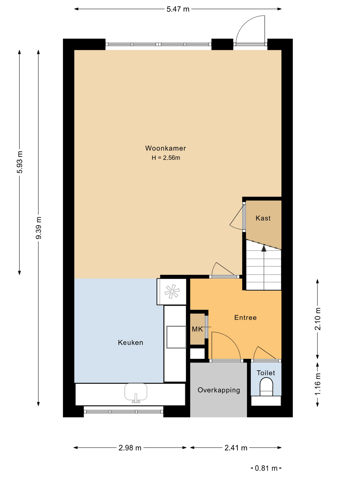 Entree/hal met de meterkast, toiletruimte, garderobe, trapopgang naar de verdieping en toegang tot de woonkamer. Een heerlijke tuingerichte woonkamer van 5.47 meter breed met grote raampartijen, een praktische trapkast en een deur naar de tuin. Aan de voorzijde bevindt zich de fraaie inbouwkeuken (2025) in L-opstelling, welke voorzien is van de volgende apparatuur; oven, vaatwasser, 4-pits inductiekookplaat, een afzuigkap en een losse koel/vries combinatie (de inductiekookplaat en de afzuigkap zijn nieuw, de overige apparatuur is ouder). Ruime opstelmogelijkheden voor een grote eettafel waar u heerlijk met uw familie kunt dineren. De begane grond is voorzien van een fraaie PVC-vloer (2025).