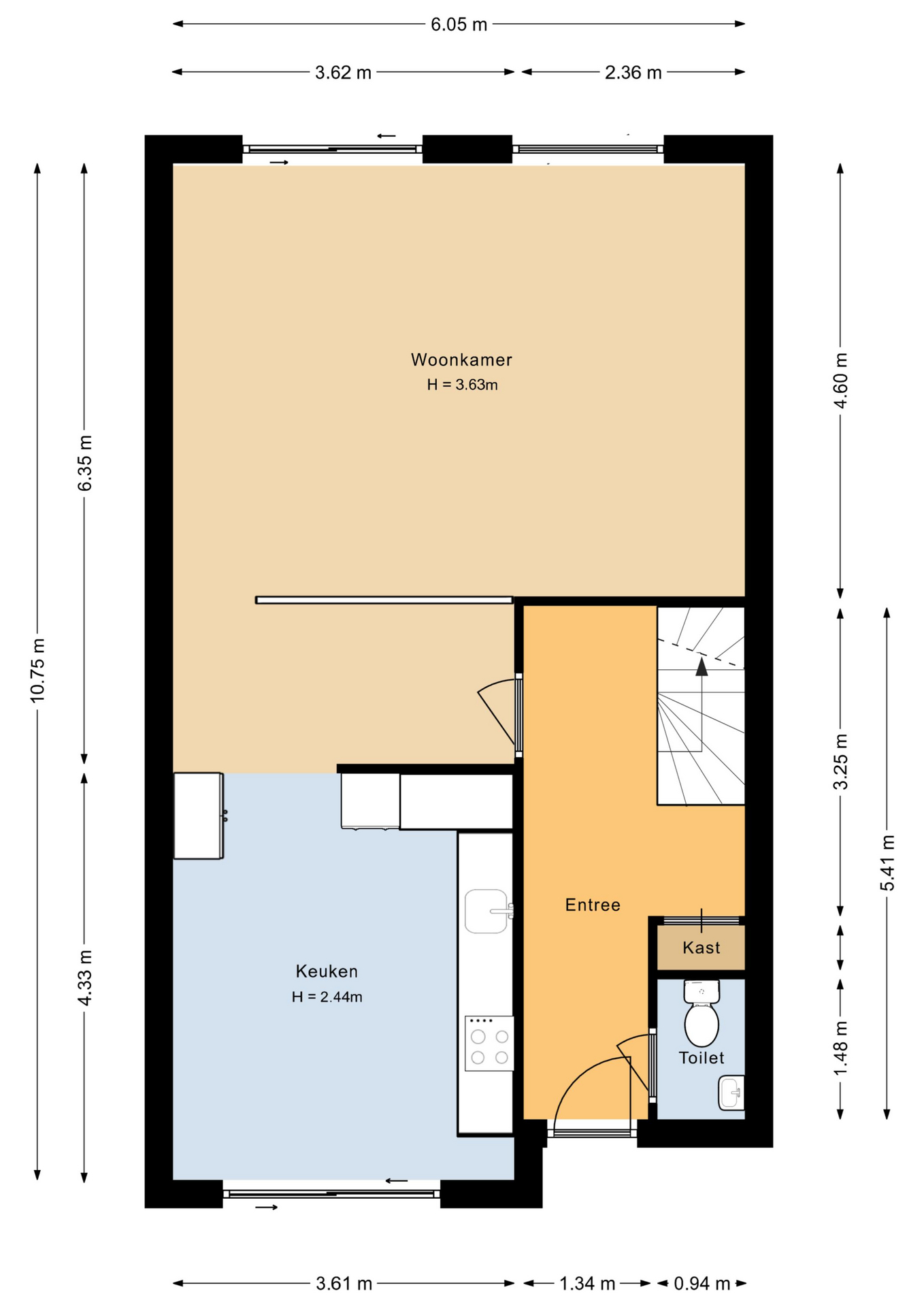 Entree, hal, toilet met fonteintje, ruime straatgerichte keuken (ca. 16 m²), trap naar de ruime en lichte woonkamer (ca. 38 m²), schuifpui naar de tuin.