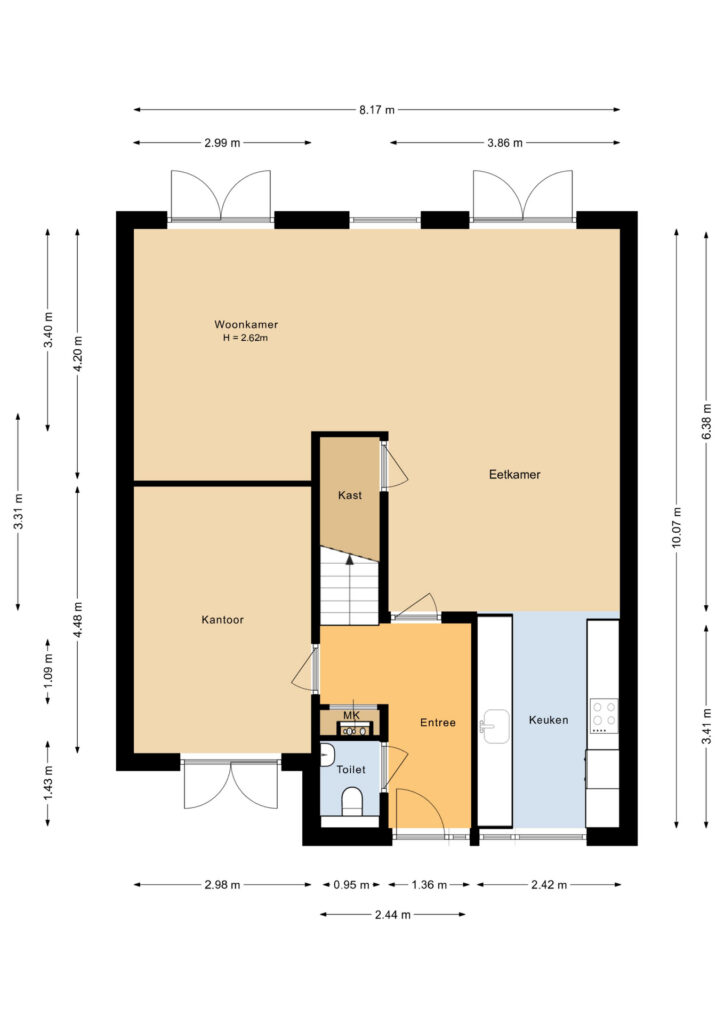 * Riante tuingerichte woonkamer van maar liefst 8,17 meter breed met 2 dubbele openslaande deuren (met schuifhorren) naar de tuin