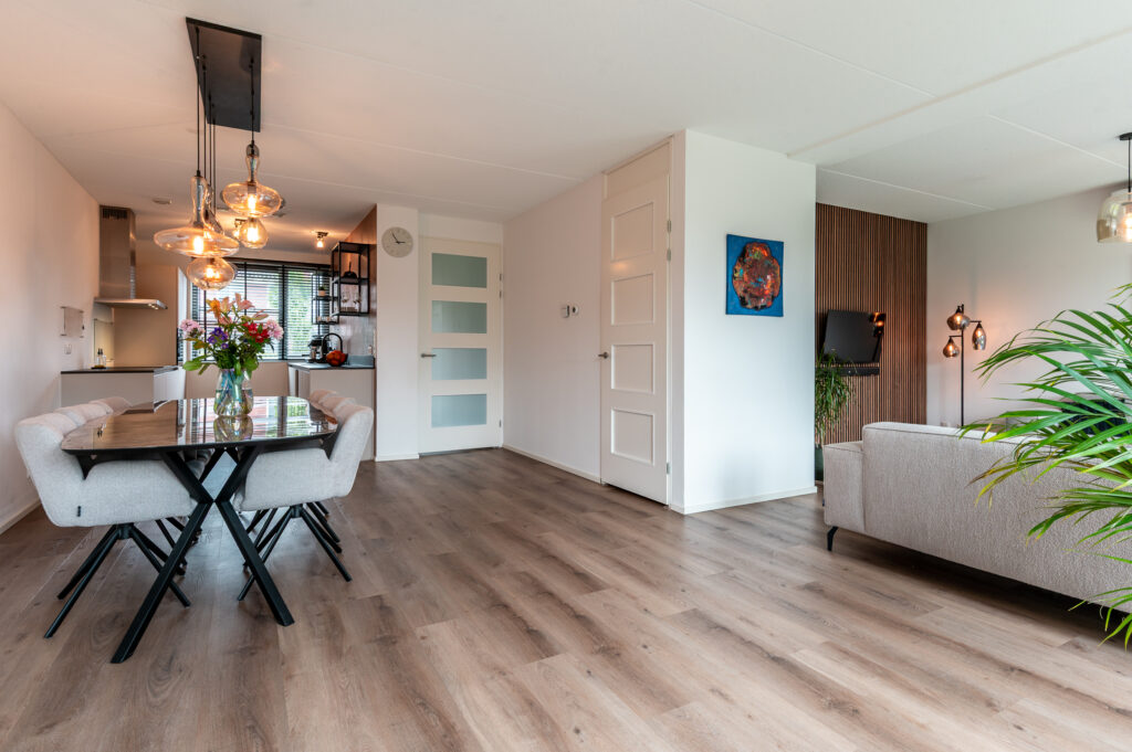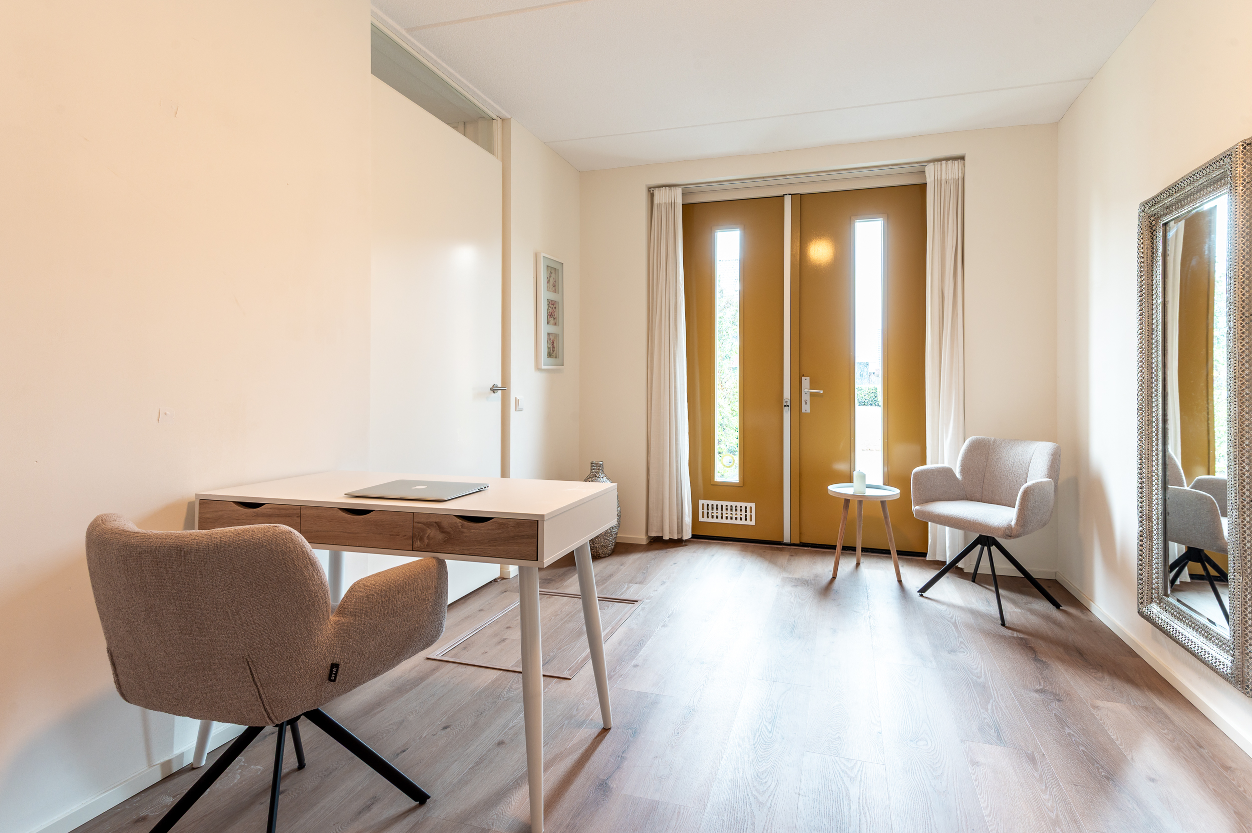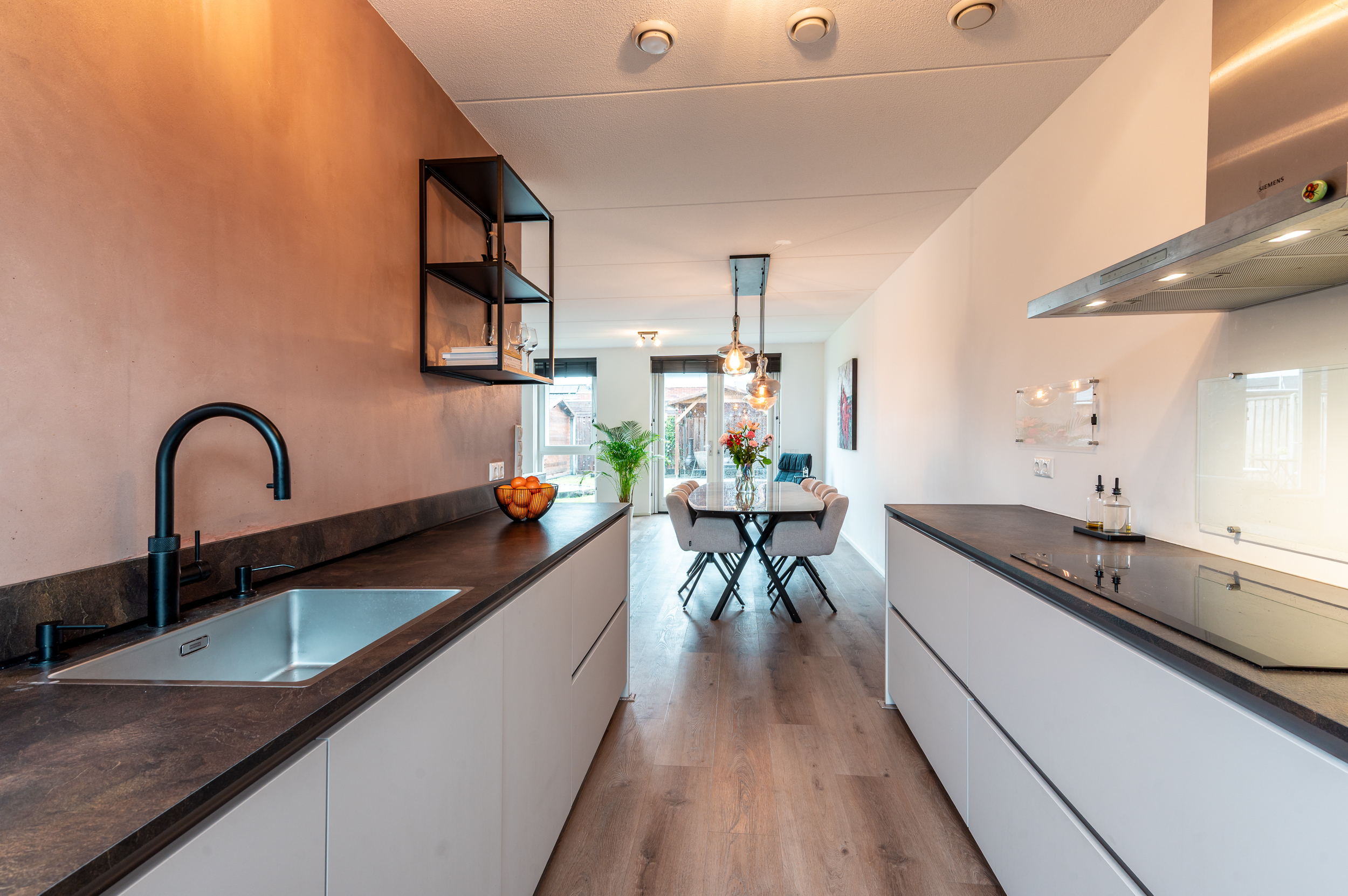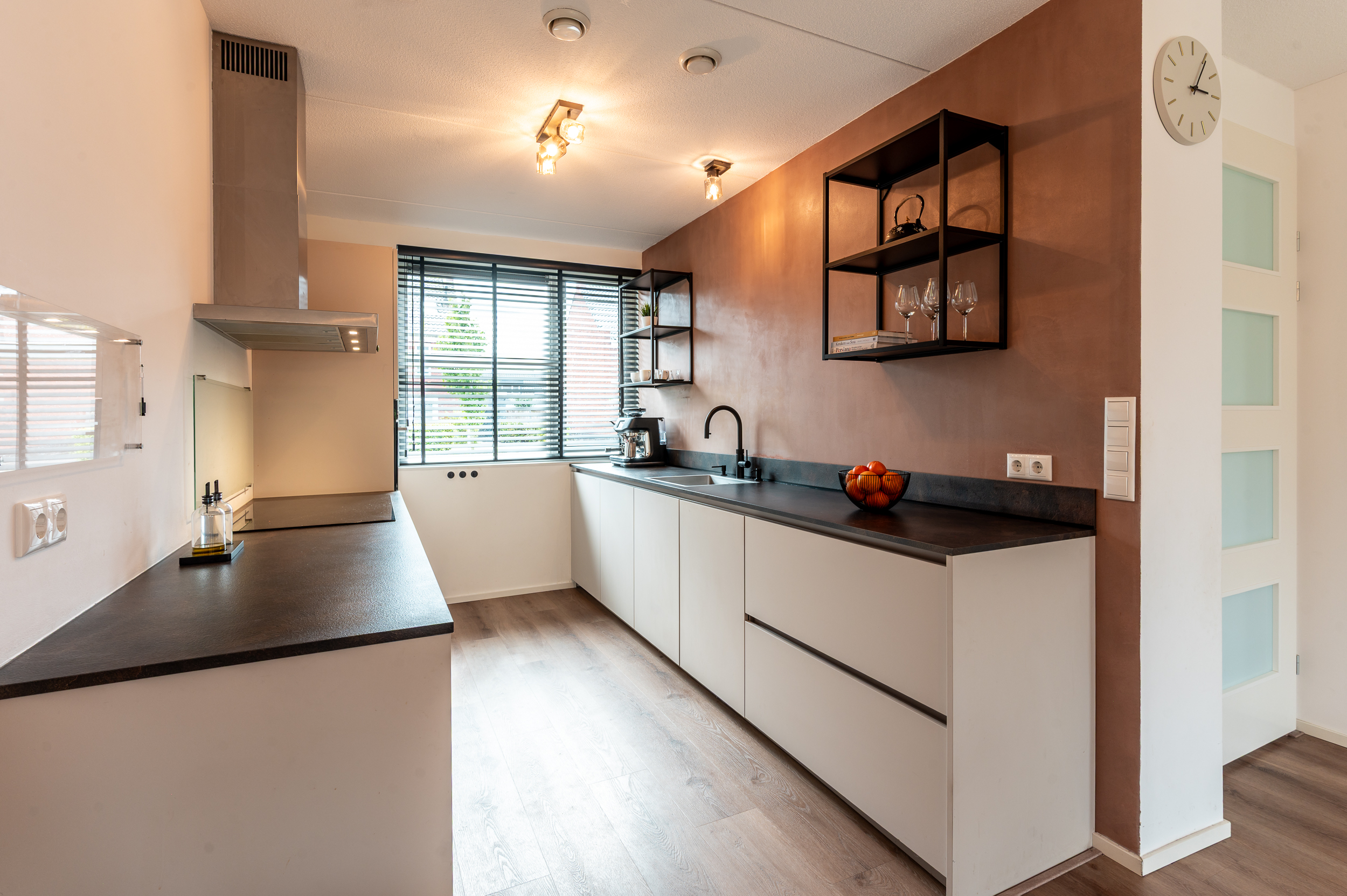 Entree/hal met de toiletruimte, meterkast, garderobe, trapopgang naar de verdieping en toegang tot de woonkamer en de multifunctionele ruimte (ca. 13 m2) met eigen entree. Deze extra kamer op de begane grond is erg handig en kan worden gebruikt als kantoorruimte, slaapkamer of een speelkamer voor de kinderen. Een riante tuingerichte woonkamer van maar liefst 8,17 meter breed met grote raampartijen (veel lichtinval), sfeervolle wandpanelen, een praktische bergkast, een airco (warmte/koelen) en middels 2 dubbele openslaande deuren (met schuifhorren) toegang naar de tuin. Aan de voorzijde bevindt zich de luxe Bruynzeel keuken, welke voorzien is van de volgende (Siemens) inbouwapparatuur; koelkast, vriezer, vaatwasser, combi-oven, Quooker, 5-pits inductiekookplaat en een afzuigkap. Ruime opstelmogelijkheden voor een grote eettafel, waar u heerlijk met vrienden en familie kunt dineren. De begane grond is voorzien van strakke wandafwerking en een fraaie PVC-vloer (2023) met vloerverwarming.