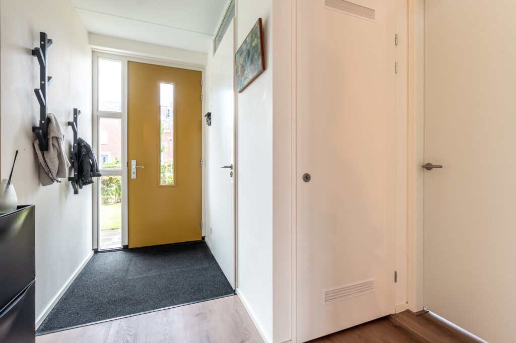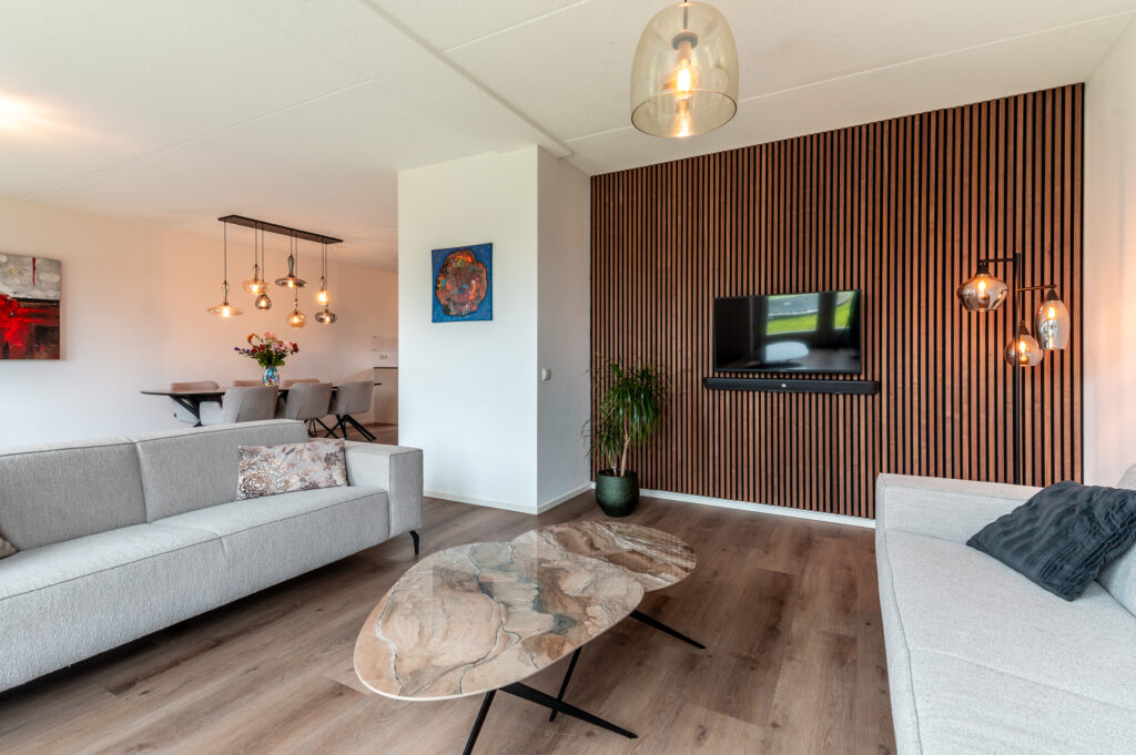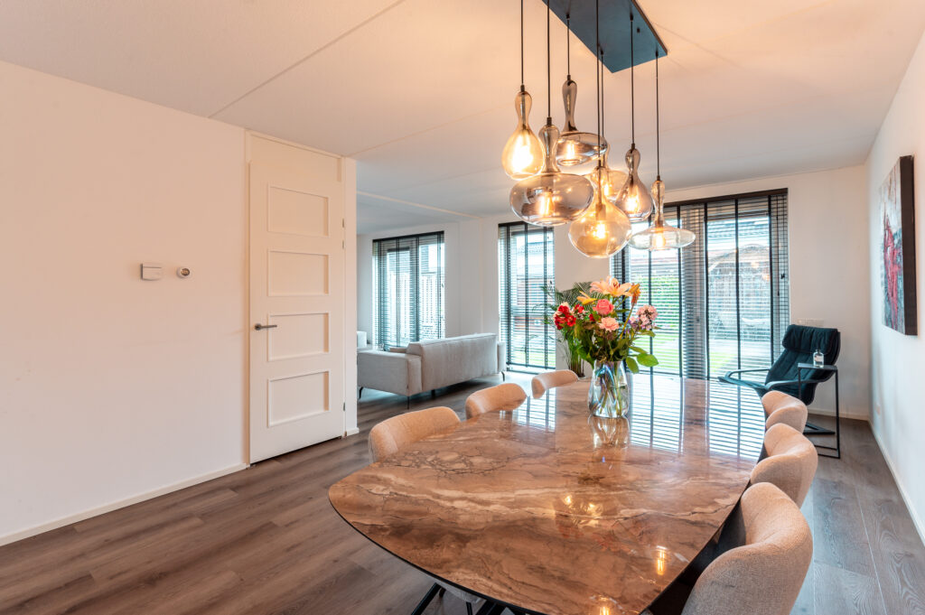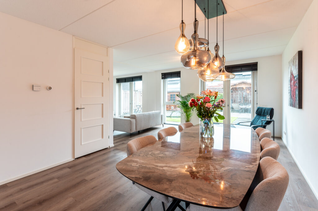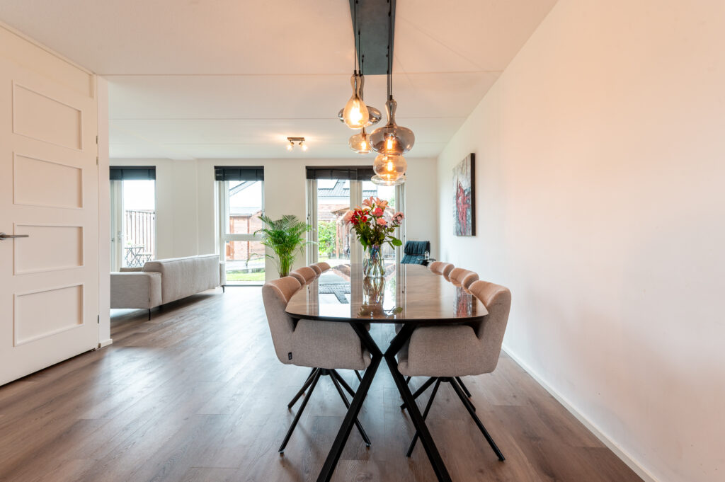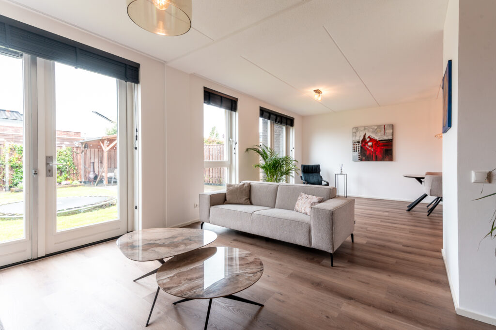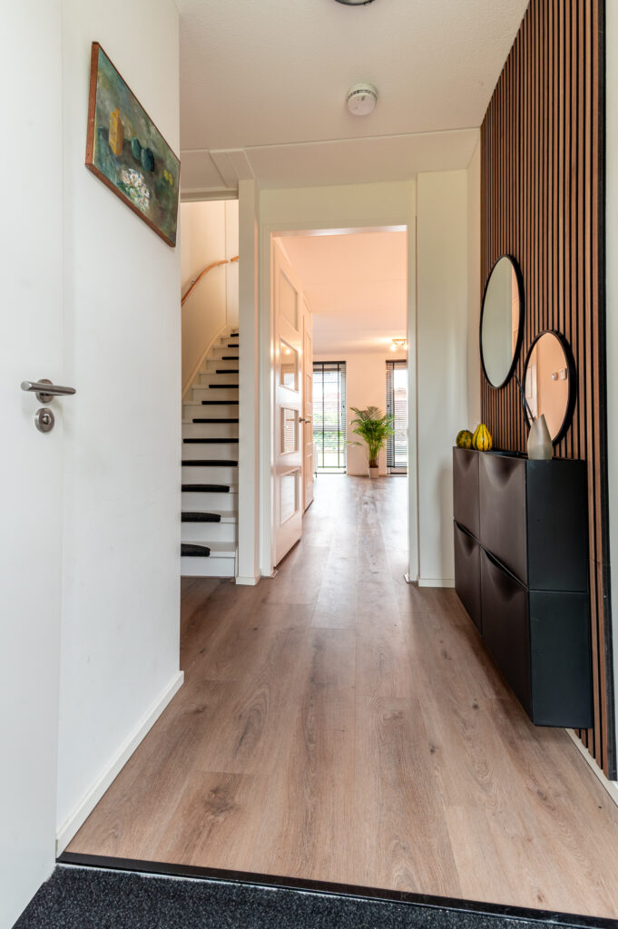 Entree/hal met de toiletruimte, meterkast, garderobe, trapopgang naar de verdieping en toegang tot de woonkamer en de multifunctionele ruimte (ca. 13 m2) met eigen entree. Deze extra kamer op de begane grond is erg handig en kan worden gebruikt als kantoorruimte, slaapkamer of een speelkamer voor de kinderen. Een riante tuingerichte woonkamer van maar liefst 8,17 meter breed met grote raampartijen (veel lichtinval), sfeervolle wandpanelen, een praktische bergkast, een airco (warmte/koelen) en middels 2 dubbele openslaande deuren (met schuifhorren) toegang naar de tuin. Aan de voorzijde bevindt zich de luxe Bruynzeel keuken, welke voorzien is van de volgende (Siemens) inbouwapparatuur; koelkast, vriezer, vaatwasser, combi-oven, Quooker, 5-pits inductiekookplaat en een afzuigkap. Ruime opstelmogelijkheden voor een grote eettafel, waar u heerlijk met vrienden en familie kunt dineren. De begane grond is voorzien van strakke wandafwerking en een fraaie PVC-vloer (2023) met vloerverwarming.