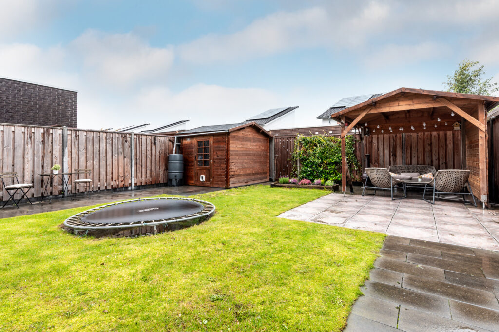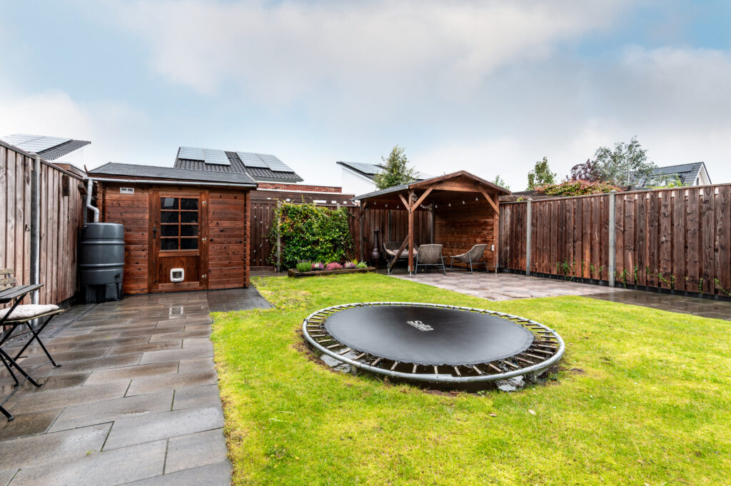 De verzorgd aangelegde tuin is gelegen op het noorden en voorzien van meerdere terrassen met bestrating, een border met beplanting, gazon met een trampoline, een gezellige veranda, een vrijstaande houten berging en een praktische achterom. De tuin is een heerlijke plek om te genieten van ontspanning, wordt omheind middels hout/beton schuttingen en geeft veel privacy!
