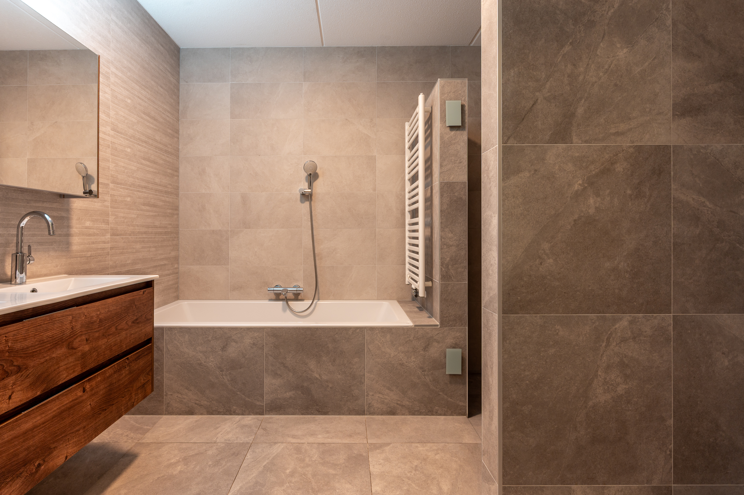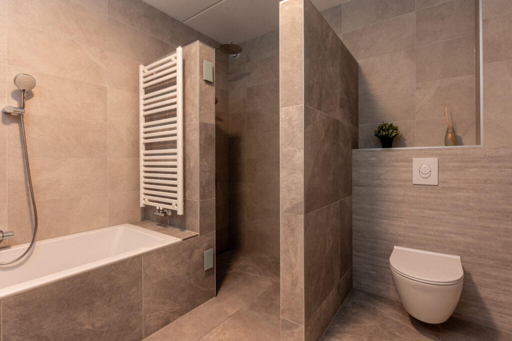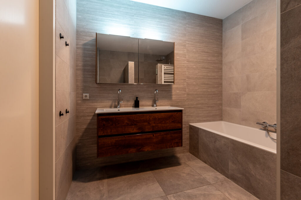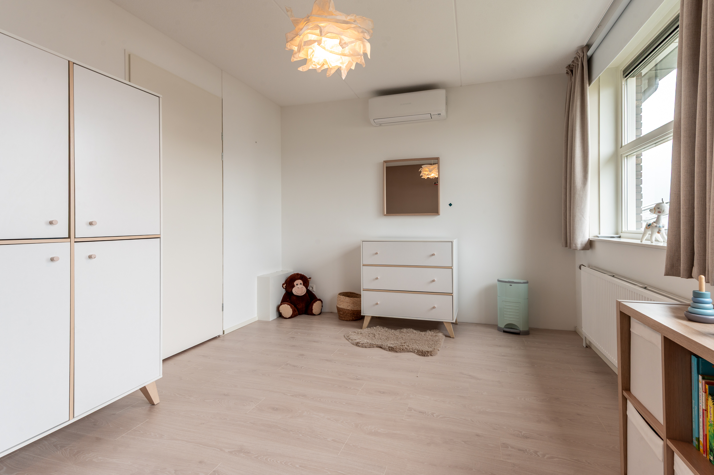 Overloop met toegang tot 2 ruime slaapkamers (ca. 17 en 16 m2), beide over de volle breedte van de woning en voorzien van horren en een airco (warmte/koelen). Moderne badkamer met een ligbad, (inloop)douche met Sunshower, wastafelmeubel met dubbele wastafel, 2e toilet en een designradiator. De verdieping is voorzien van strakke wandafwerking en een mooie laminaatvloer.