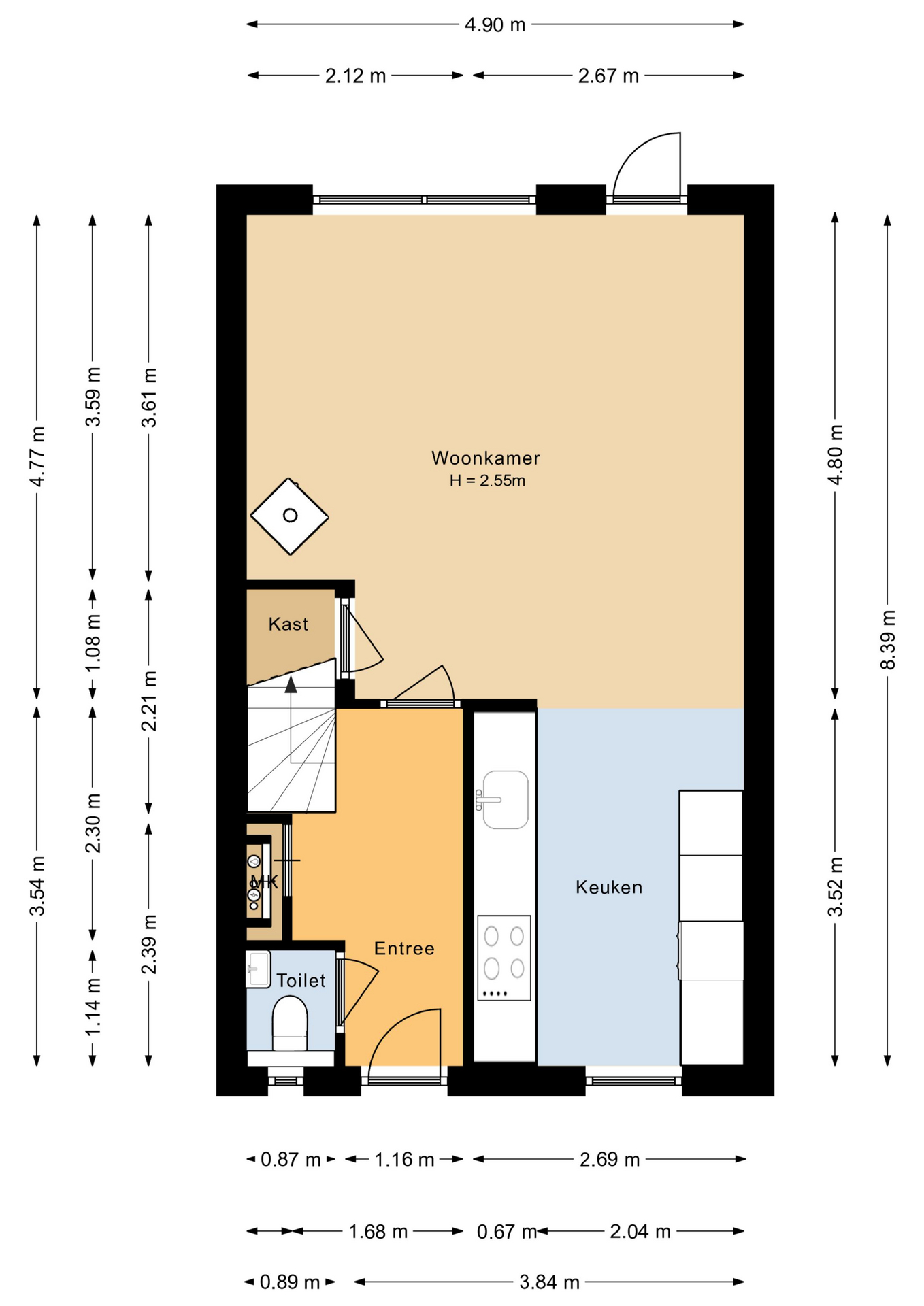 Entree/hal met de moderne toiletruimte (2023), meterkast (2023), trapopgang naar de verdieping en toegang tot de woonkamer. Een heerlijke lichte woonkamer met grote raampartijen, een sfeervolle houtkachel, praktische trapkast, airco (warmte/koelen 2023) en een deur naar de tuin. Aan de voorzijde bevindt zich de luxe inbouwkeuken (2023) in dubbele opstelling, welke voorzien is van de volgende apparatuur; koelkast, vriezer, vaatwasser, stoomoven, magnetron, 4-pits inductiekookplaat en een afzuigkap. De begane grond is voorzien van een fraaie PVC-vloer (2023) in visgraatmotief.