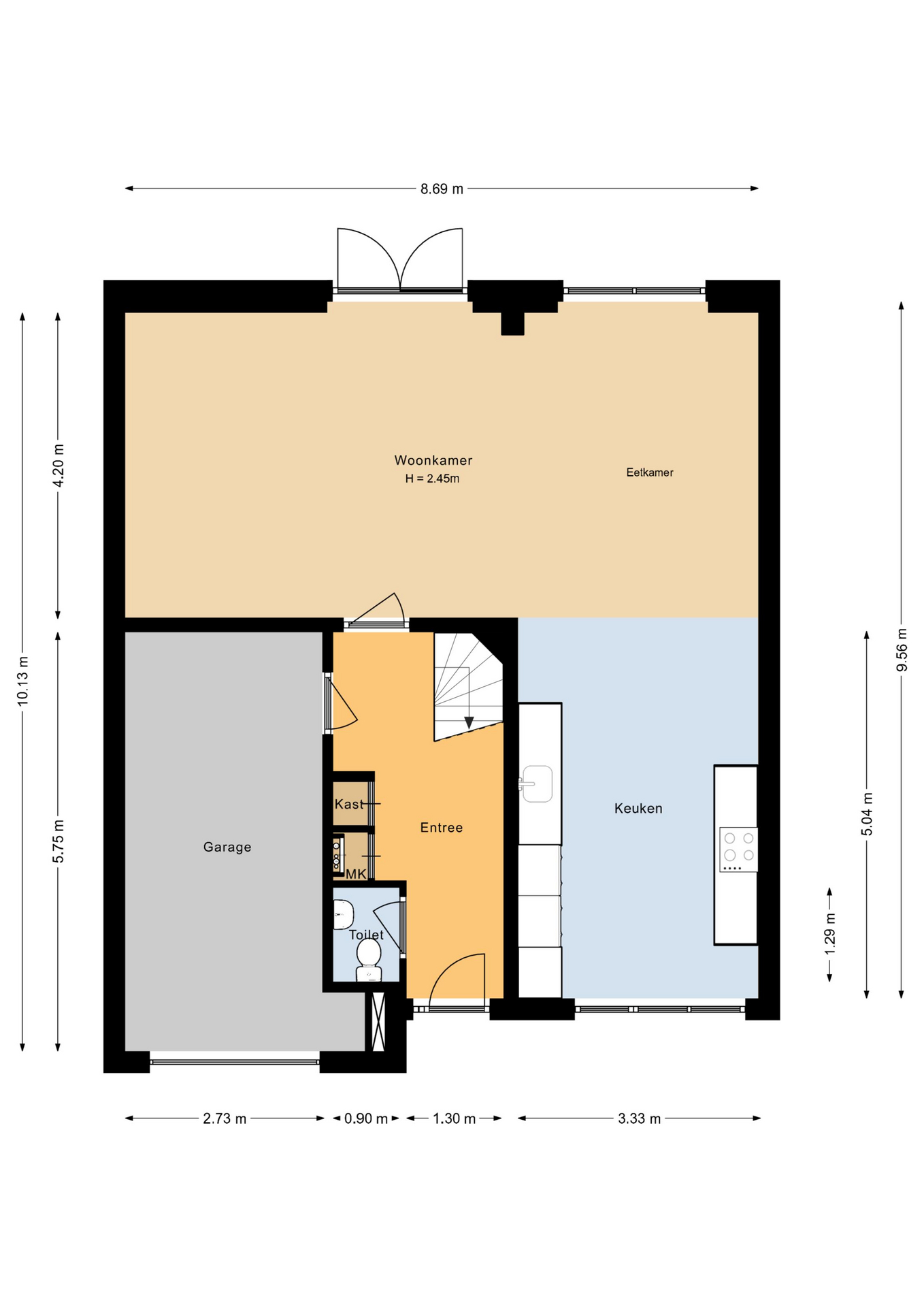 Ruime entree, vaste kast, modern toilet met fonteintje, toegang tot de inpandige garage (ca. 15 m²), zeer ruime en lichte woonkamer (ca. 36 m²) met openslaande deuren naar de tuin, moderne open keuken (straatgericht) voorzien van diverse inbouwapparatuur.