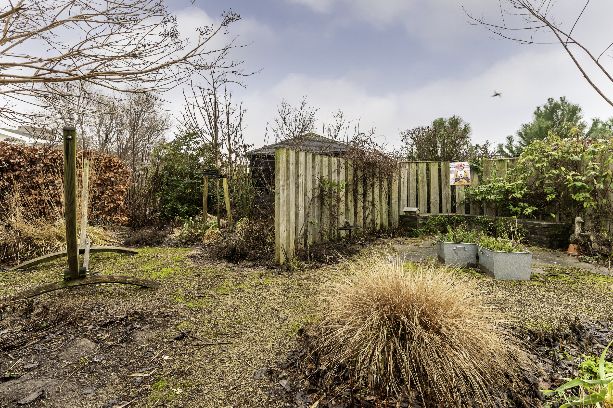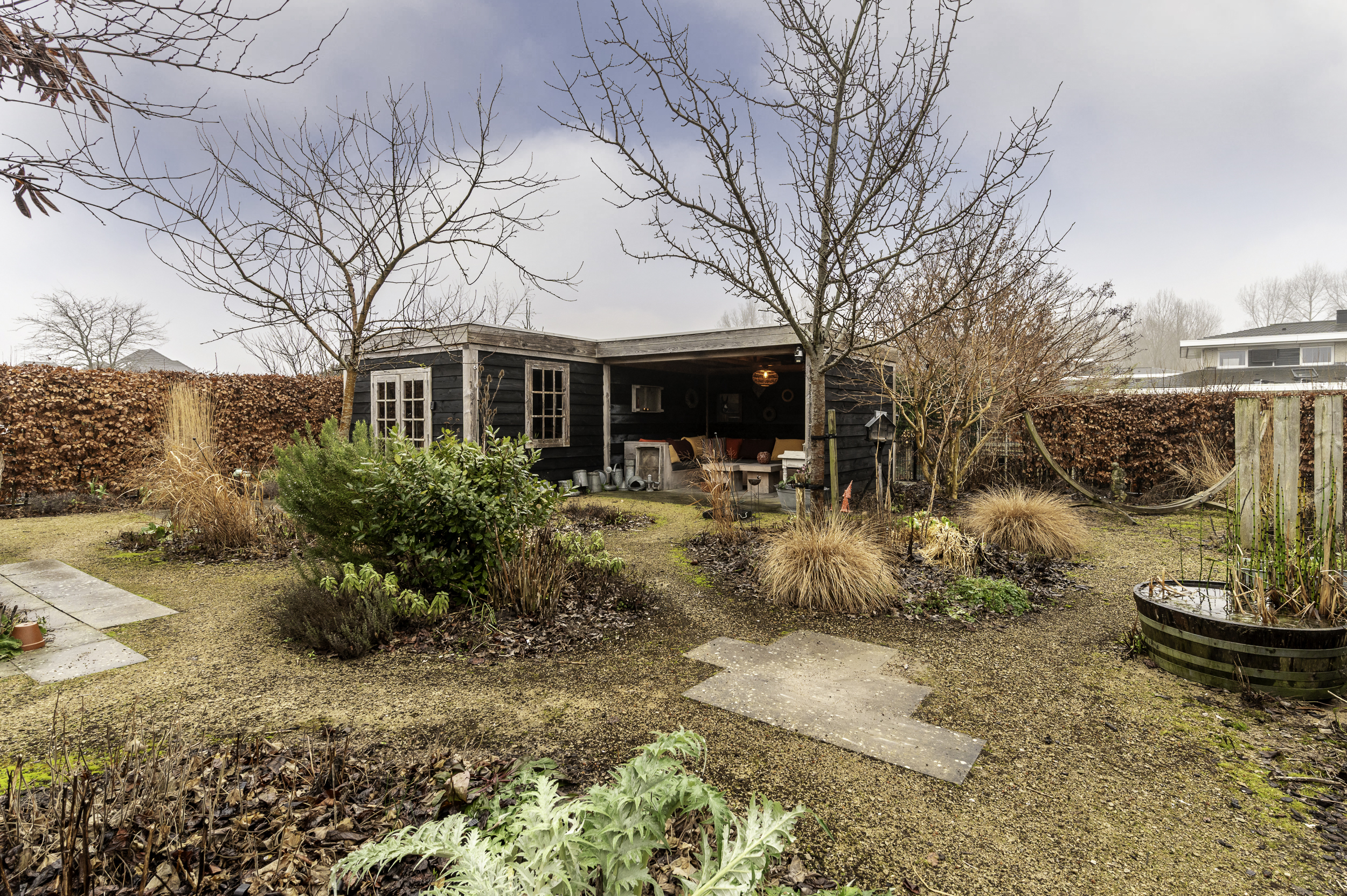 Rondom de woning ligt een onder architectuur aangelegde, ecologische tuin met een totale oppervlakte van circa 612 m². Deze tuin is ontworpen met oog voor biodiversiteit en toekomstbestendig aangelegd, waardoor u hier optimaal geniet van rust, privacy en natuur. Achter op het perceel bevindt zich een vrijstaande houten berging met overkapping. Parkeren kan comfortabel op eigen terrein met meerdere auto’s.