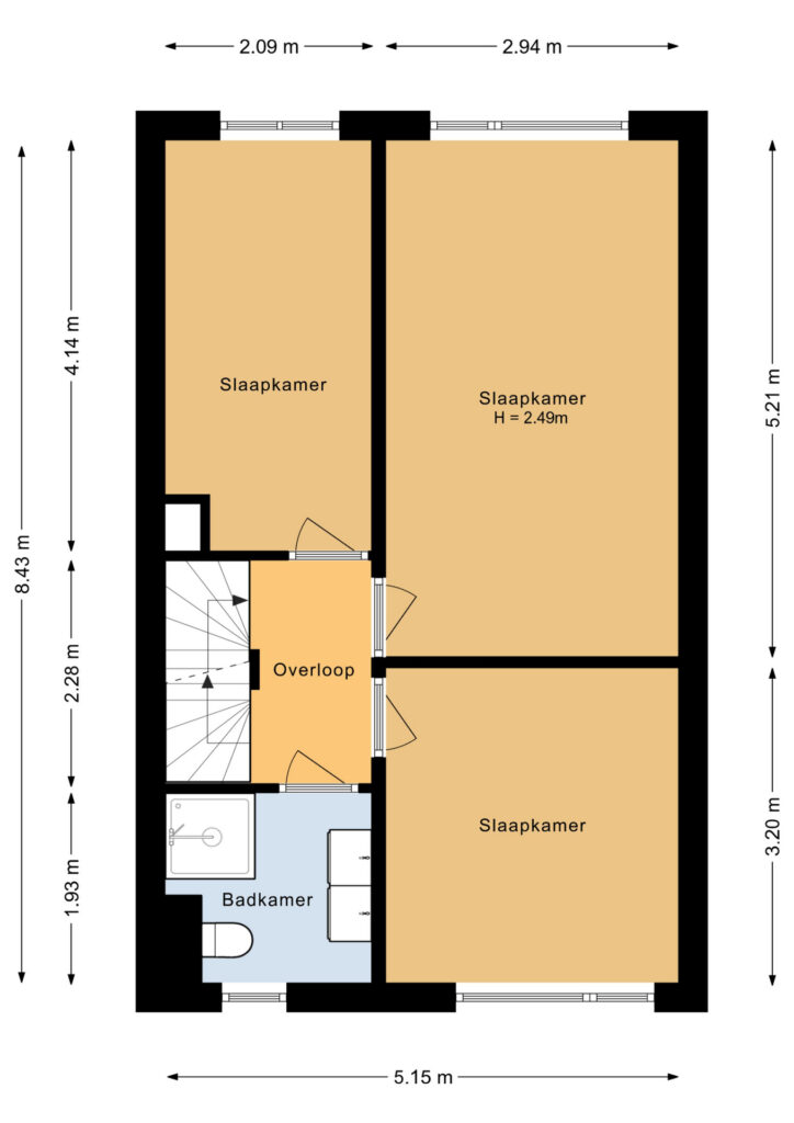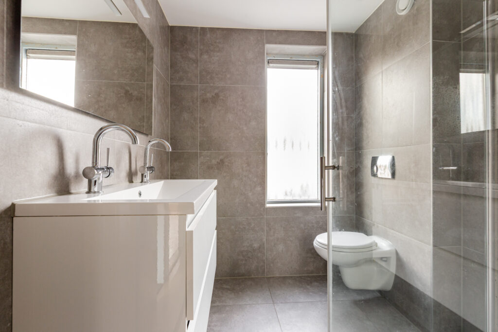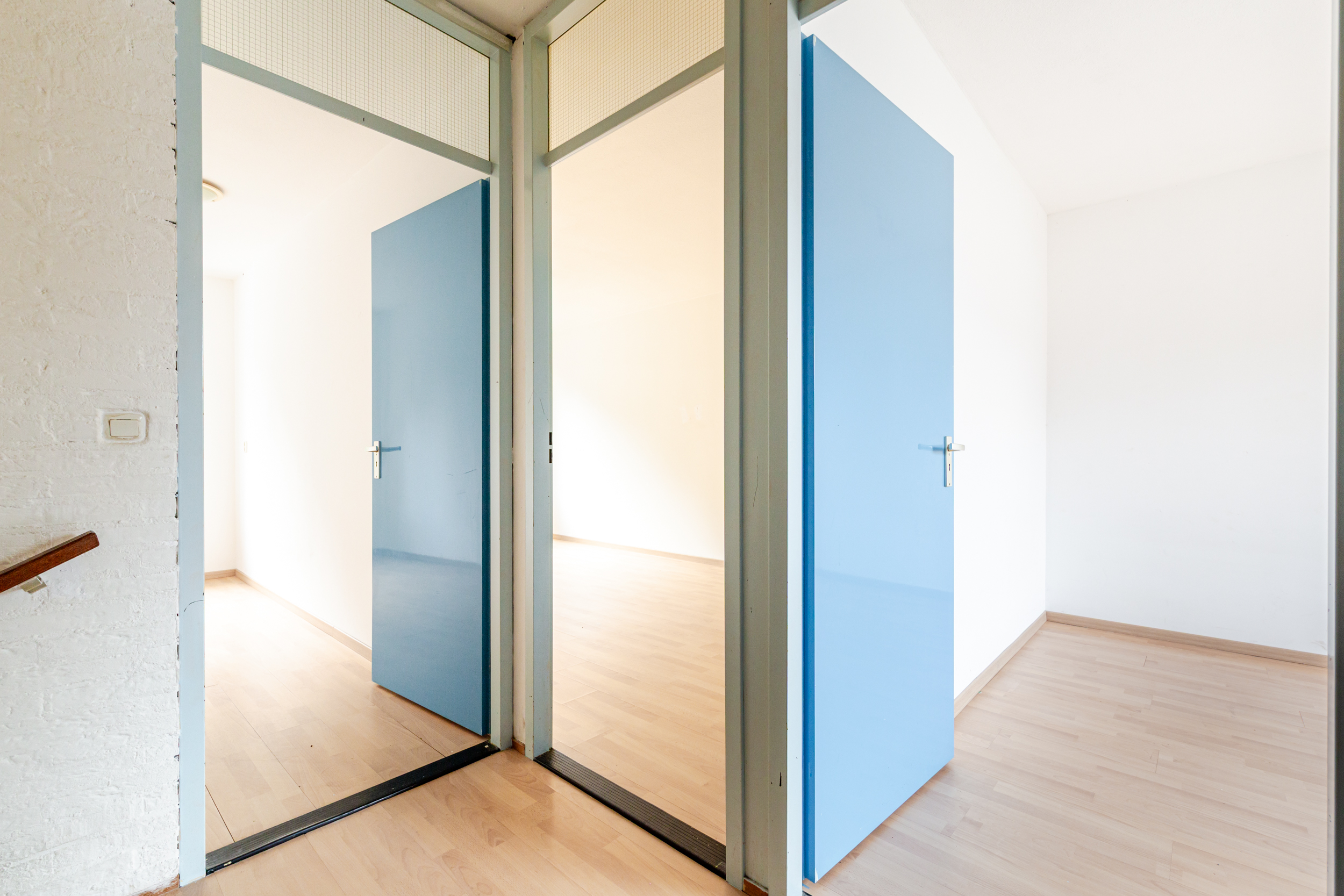 Overloop met toegang tot 3 ruime slaapkamers (ca. 15 / 9 / 9 m2). Moderne badkamer (2020) met een (inloop)douchte, wastafelmeubel met dubbele kraan, 2e toilet en een raam voor de natuurlijke lichtinval. De verdieping is voorzien van een laminaatvloer.