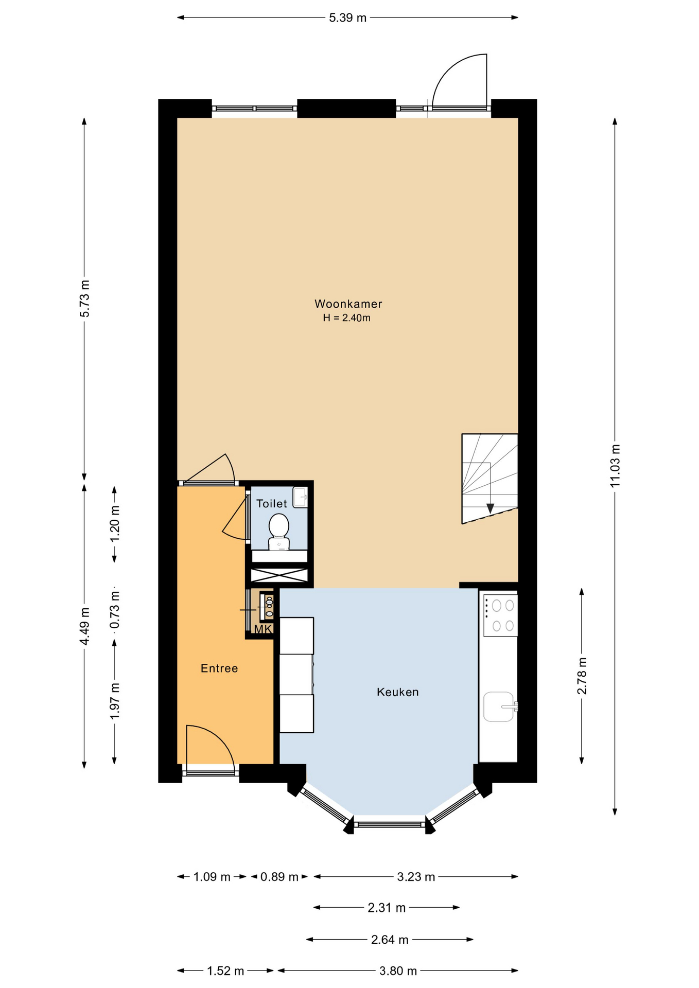 Entree, hal, modern toilet met fonteintje, zeer ruime en lichte woonkamer (ca. 31 m²), deur naar tuin, trap naar eerste verdieping, moderne open keuken (2020) voorzien van diverse inbouwapparatuur en erker.