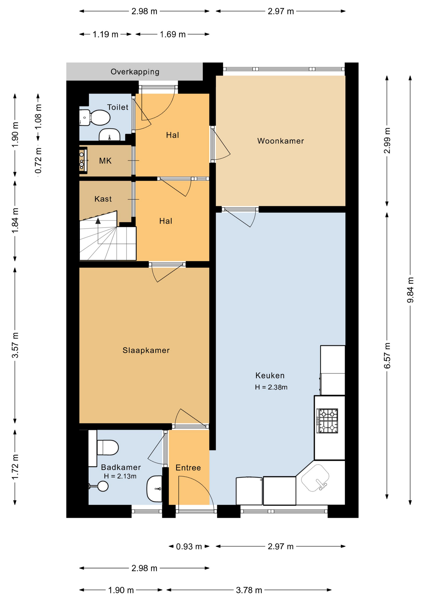 * De begane grond is met ca. 1.70 m. uitgebouwd en grotendeels voorzien van kunststof kozijnen