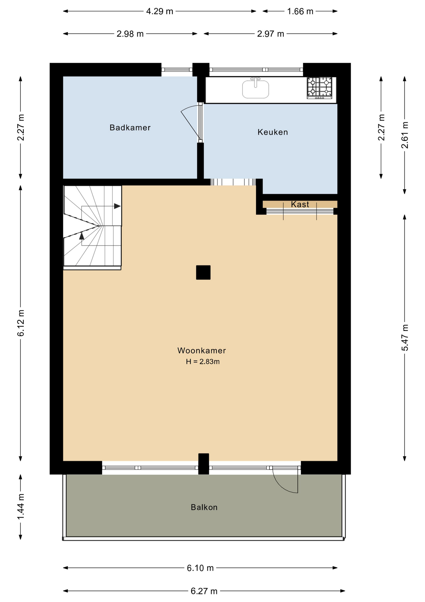 Een riante woonkamer van maar liefst 6.10 m. breed met grote raampartijen, een ingebouwde kastenwand, en een deur naar het balkon met ligging op het zuiden! Aan de voorzijde bevindt zich de inbouwkeuken in rechte opstelling, voorzien van een 4-pits gaskookplaat, een spoelbak en een afzuigkap. Aangrenzend treft u de praktische bijkeuken. De verdieping is voorzien van een laminaatvloer.