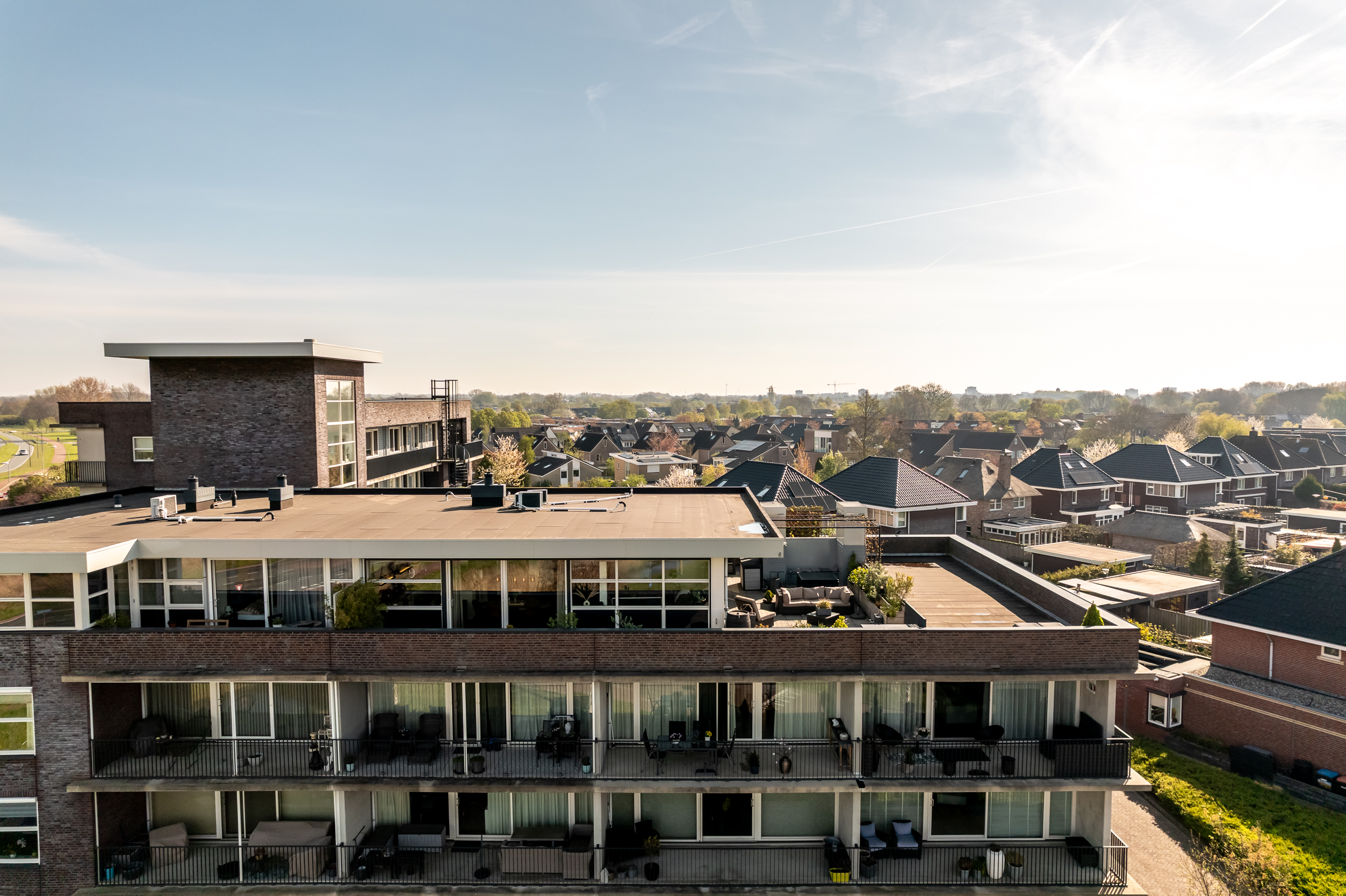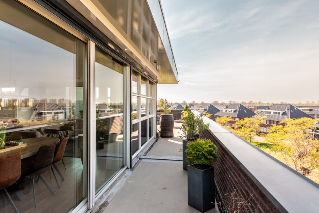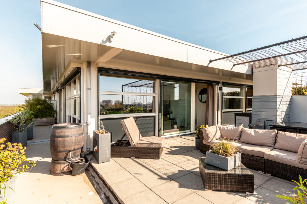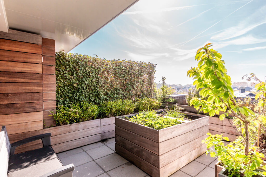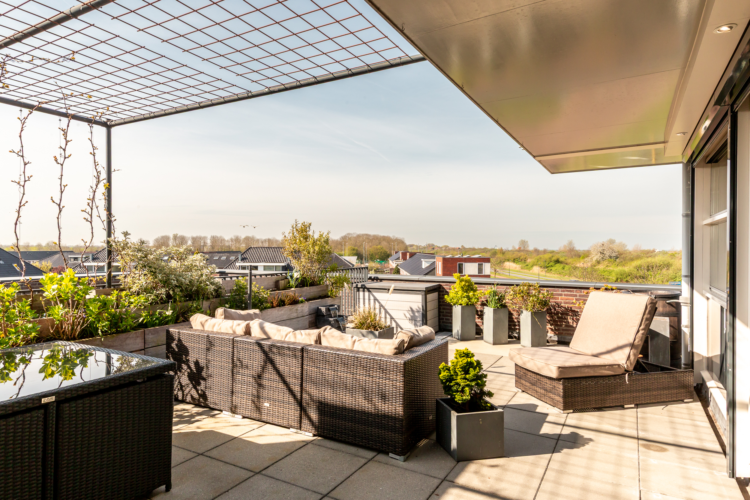 Een schitterend aangelegd dakterras met een ligging op het zuiden en rondom voorzien van screens en de planten worden via een irrigatiesysteem automatisch voorzien van water.