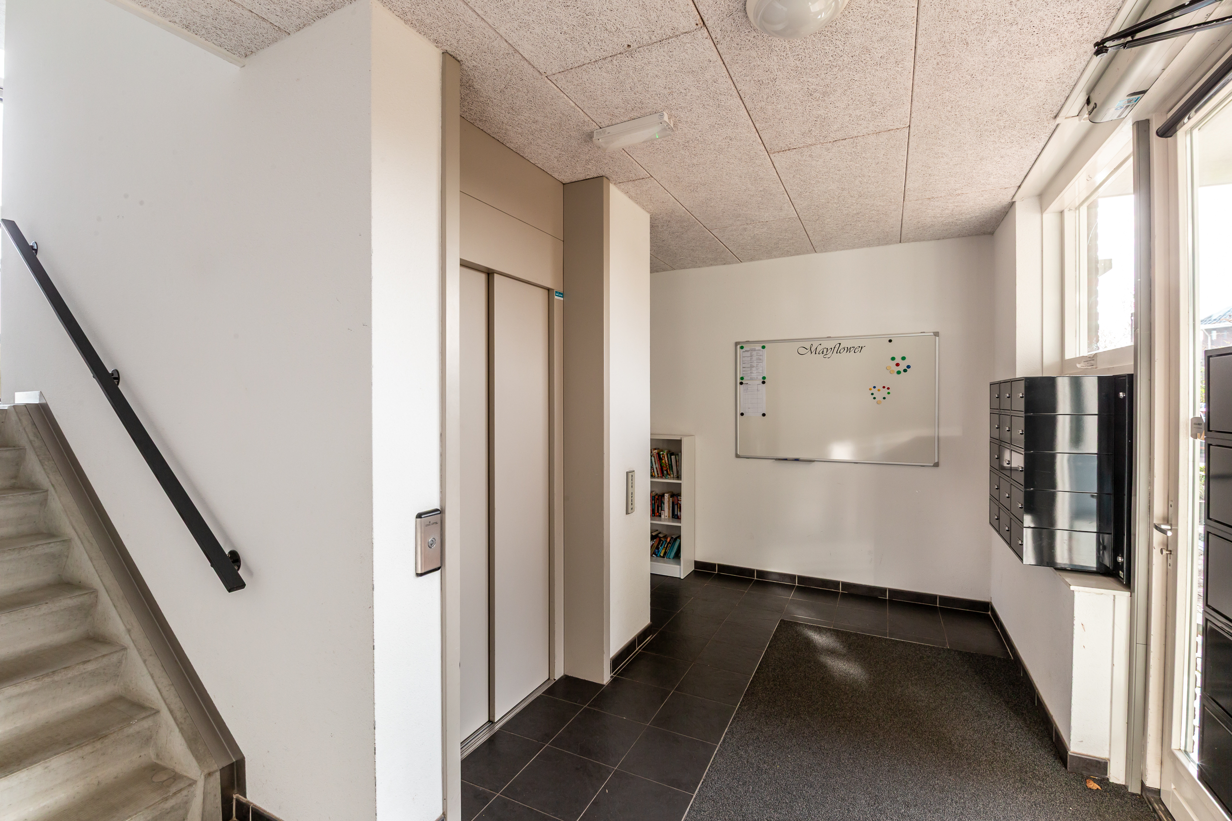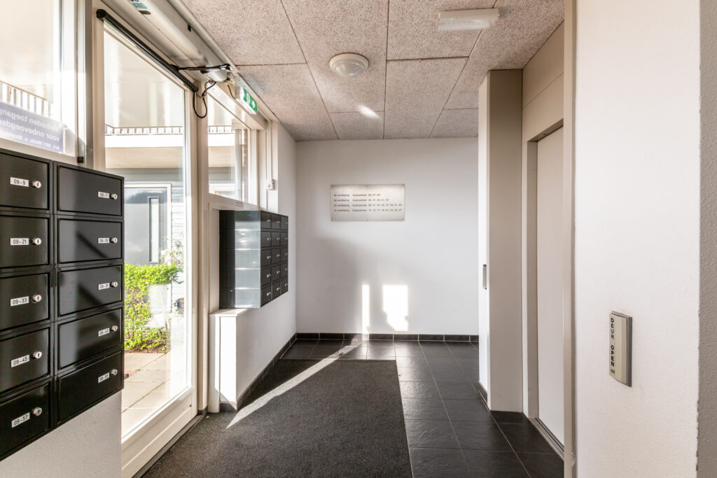 Entree met brievenbussen, audiofooninstallatie, trappenhuis en de lift naar de woonverdieping.
