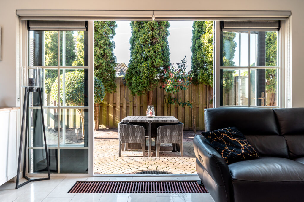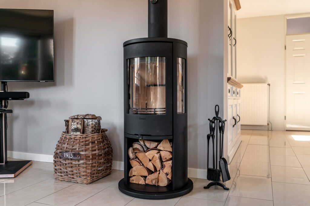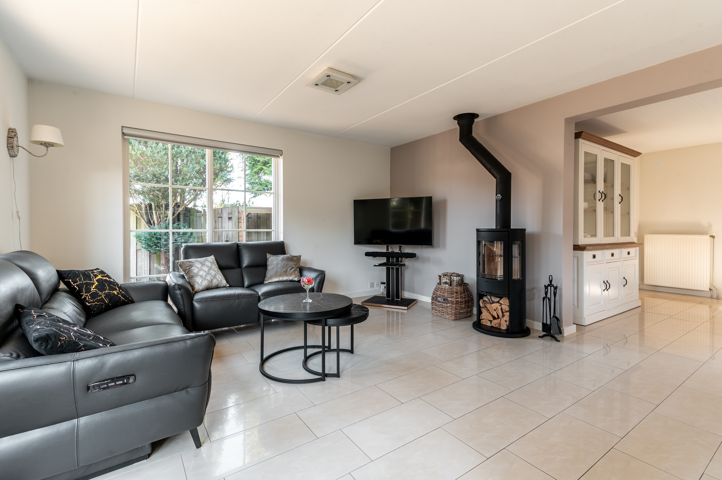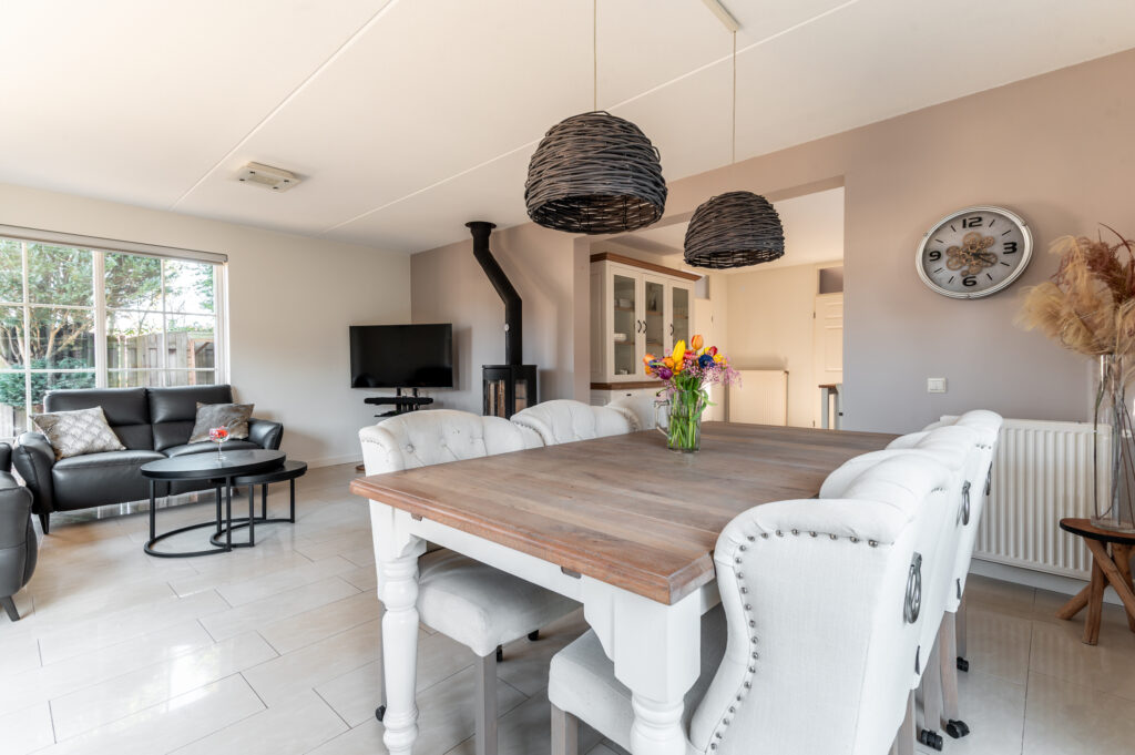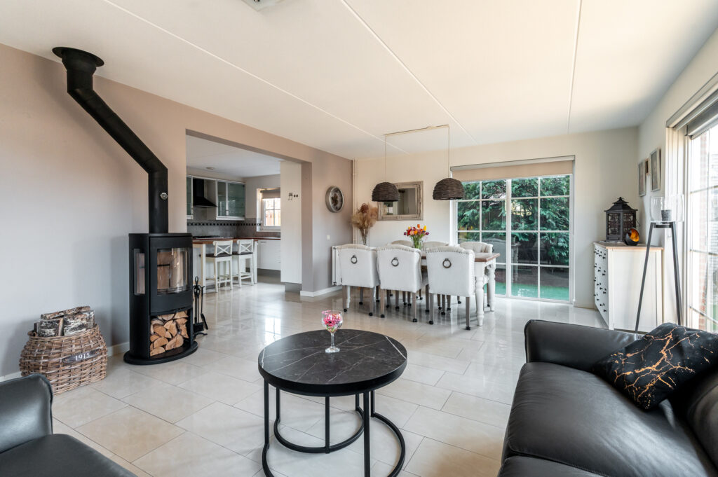 * Tuingerichte woonkamer met sfeervolle houtkachel (2024), openslaande deuren en veel lichtinval;