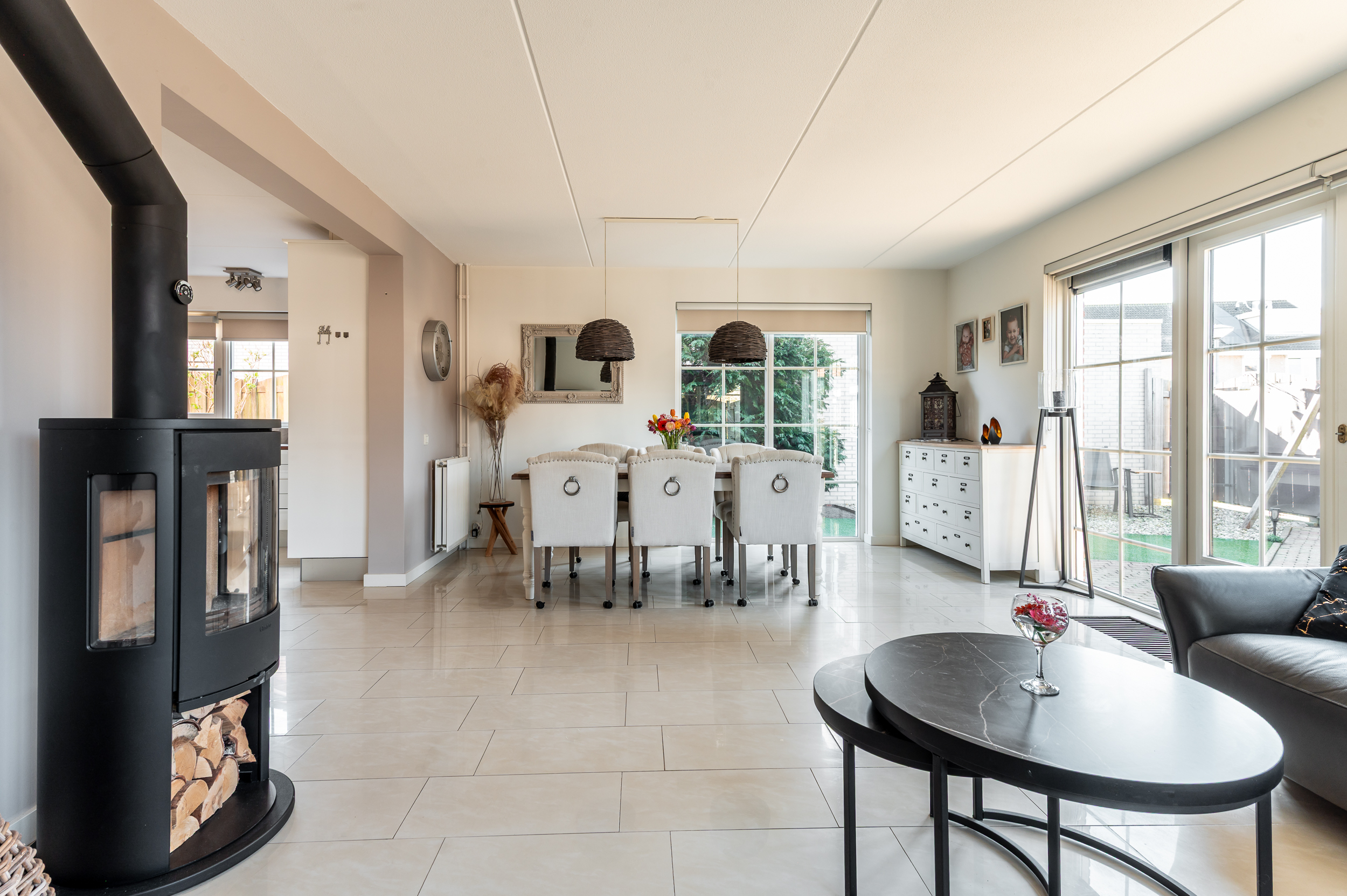 Aansluitend treft u de ruime, tuingerichte woonkamer met openslaande deuren naar de tuin. Dankzij de grote raampartijen tot aan de vloer geniet u hier van veel lichtinval! Zowel in de woonkamer als in de woonkeuken is voldoende ruimte voor een grote eettafel, ideaal voor lange avonden tafelen. De recent geplaatste sfeervolle houtkachel (2024) vormt een echte eyecatcher en zorgt voor extra warmte en gezelligheid in de woonkamer. De begane grond is afgewerkt met een luxe tegelvloer en voorzien van comfortabele vloerverwarming.