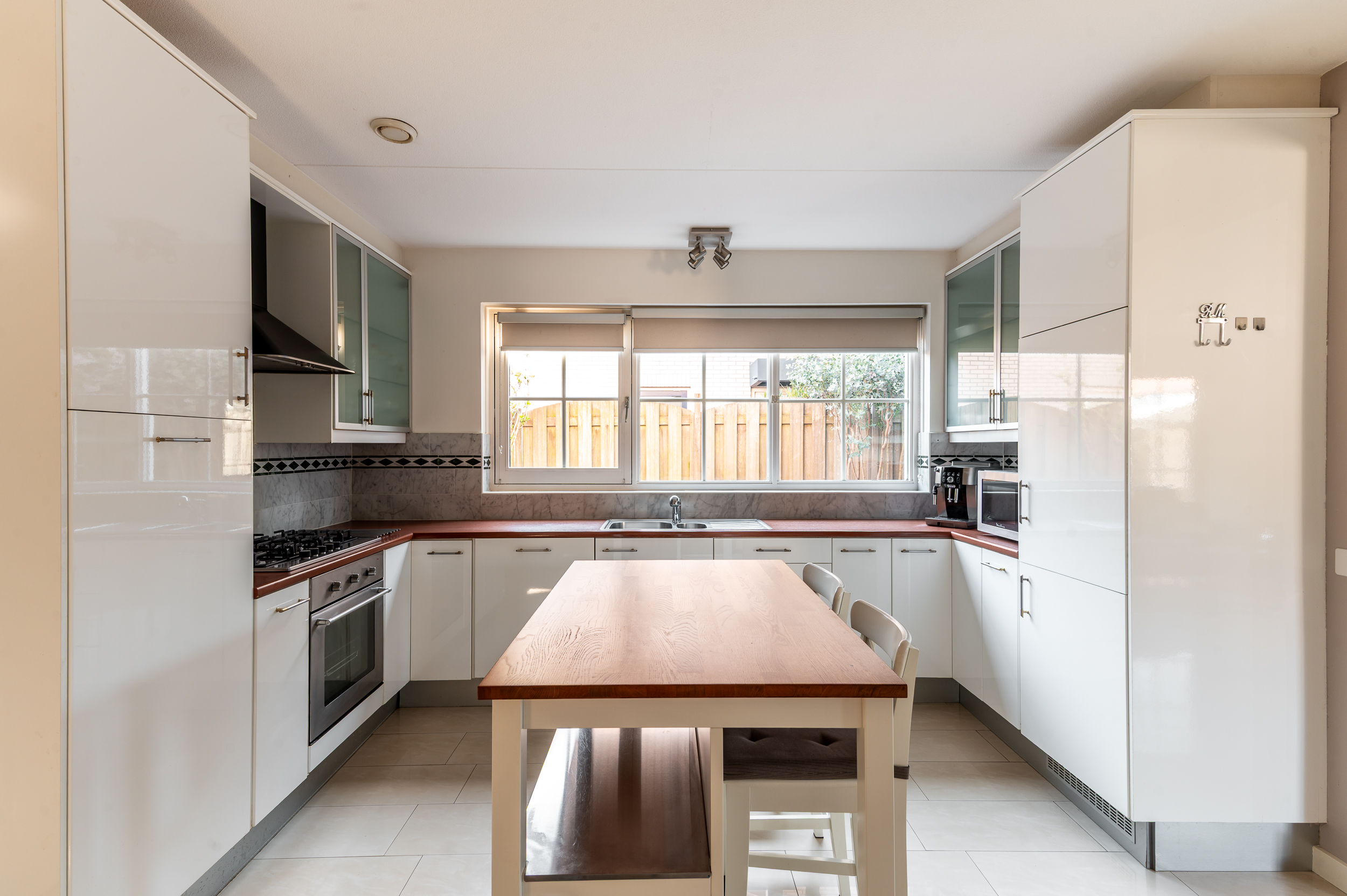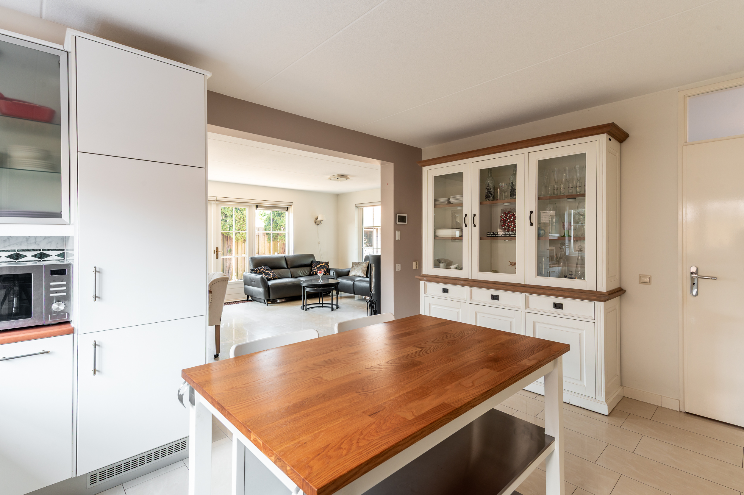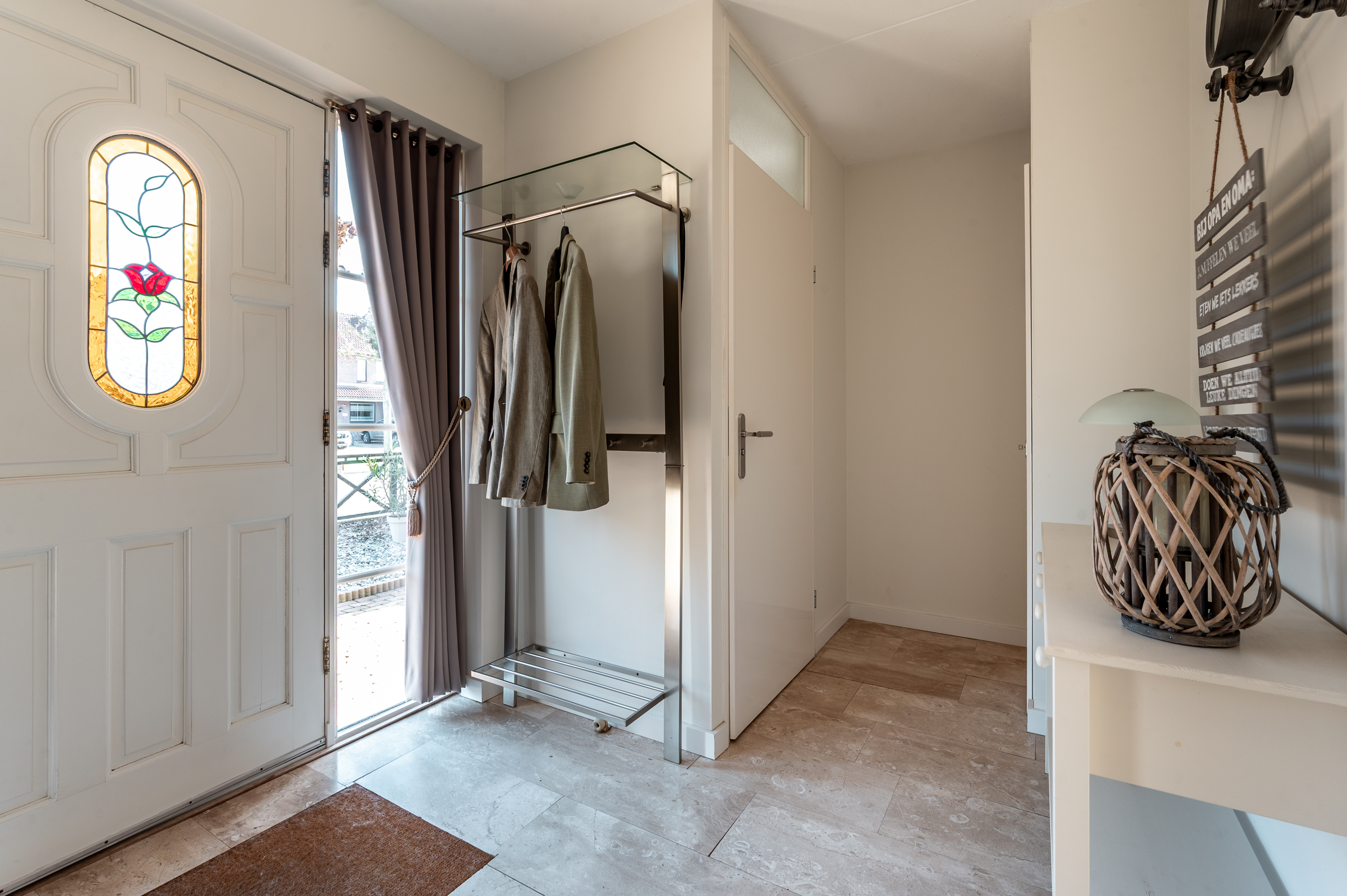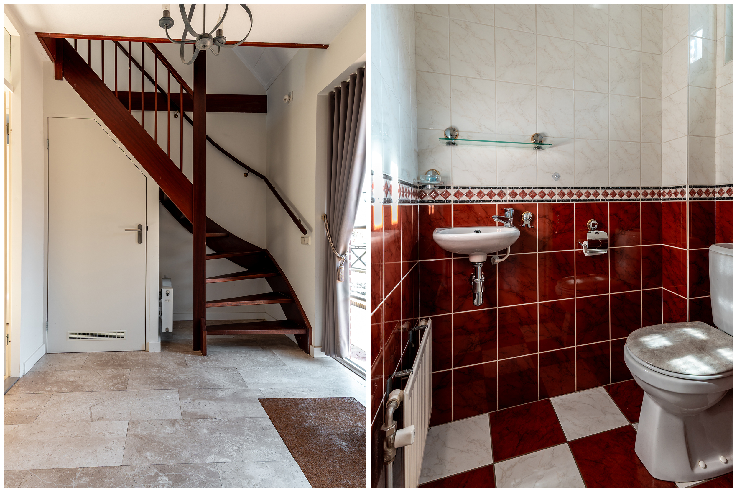 Entree, ruime hal met trapopgang, toilet met fonteintje en de meterkast. Daarnaast bevindt zich hier een praktische, op maat gemaakte trapkast met aansluiting voor de wasmachine. Vanuit de hal bereikt u de royale woonkeuken, een heerlijke plek voor de kookliefhebber. De keuken is voorzien van veel werk- en bergruimte en uitgerust met onder andere een koelkast, 5-pits gaskookplaat met afzuigkap en een vaatwasser.