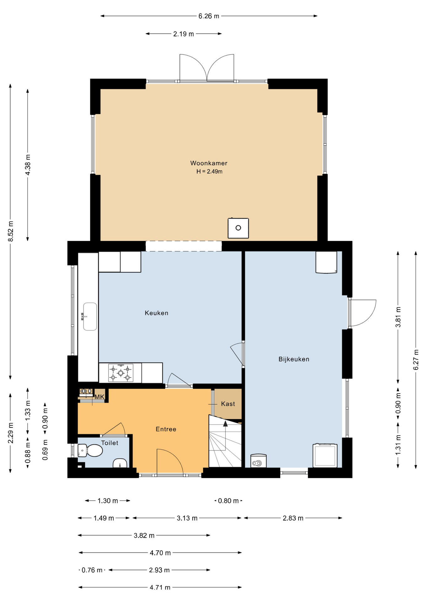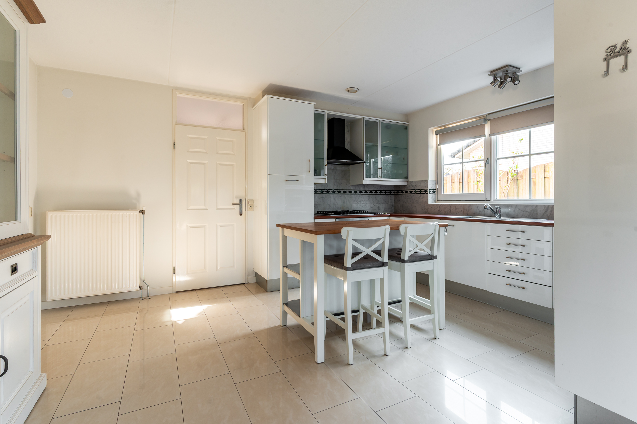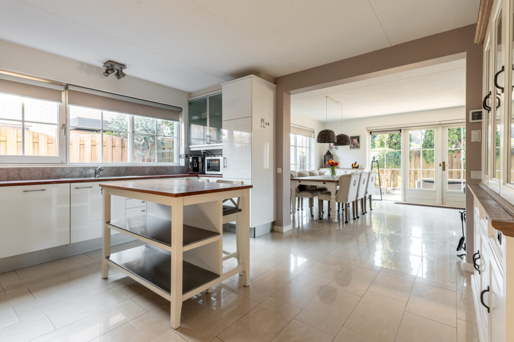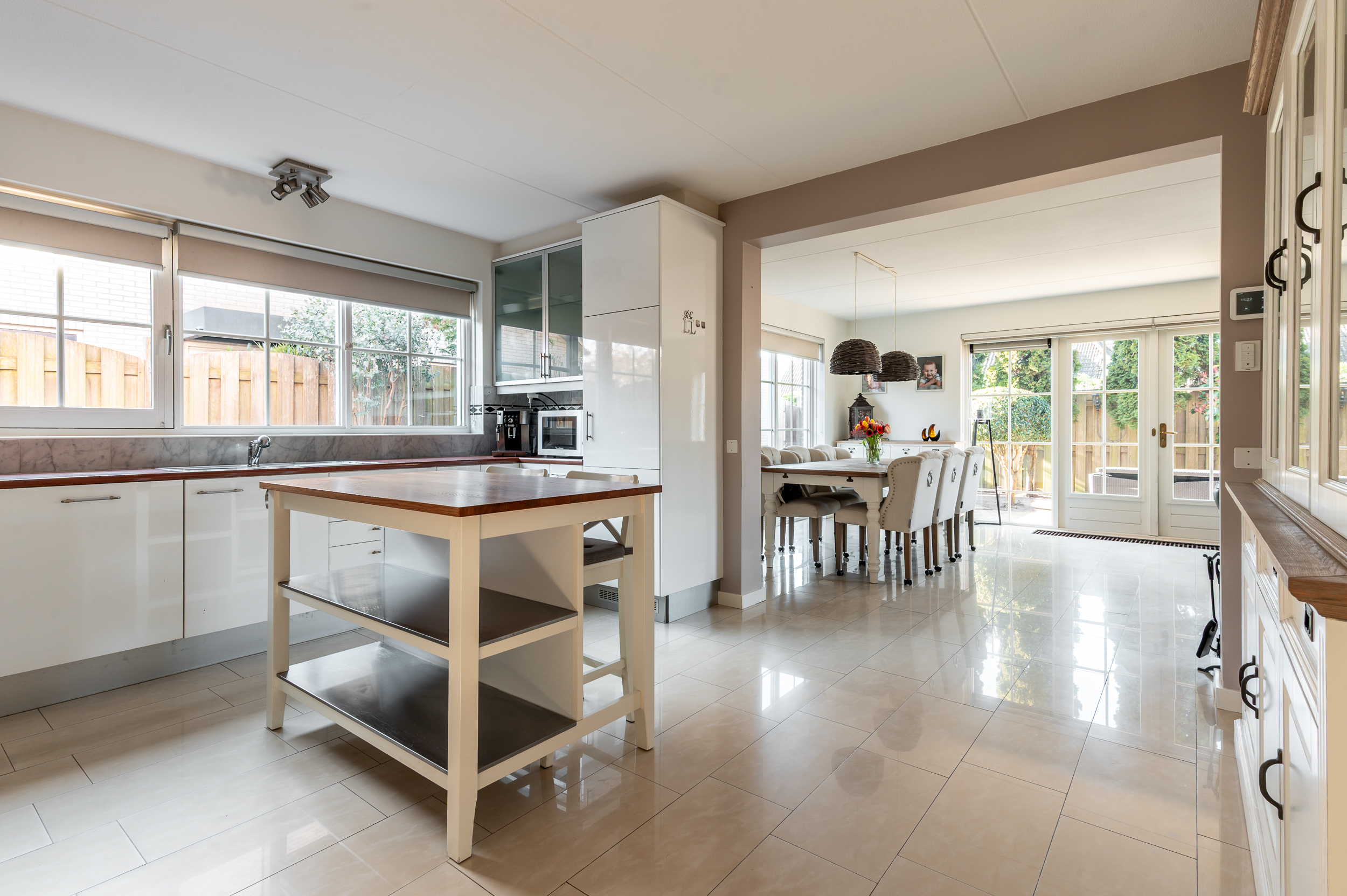 Entree, ruime hal met trapopgang, toilet met fonteintje en de meterkast. Daarnaast bevindt zich hier een praktische, op maat gemaakte trapkast met aansluiting voor de wasmachine. Vanuit de hal bereikt u de royale woonkeuken, een heerlijke plek voor de kookliefhebber. De keuken is voorzien van veel werk- en bergruimte en uitgerust met onder andere een koelkast, 5-pits gaskookplaat met afzuigkap en een vaatwasser.