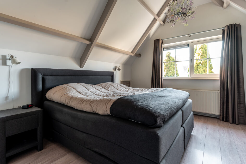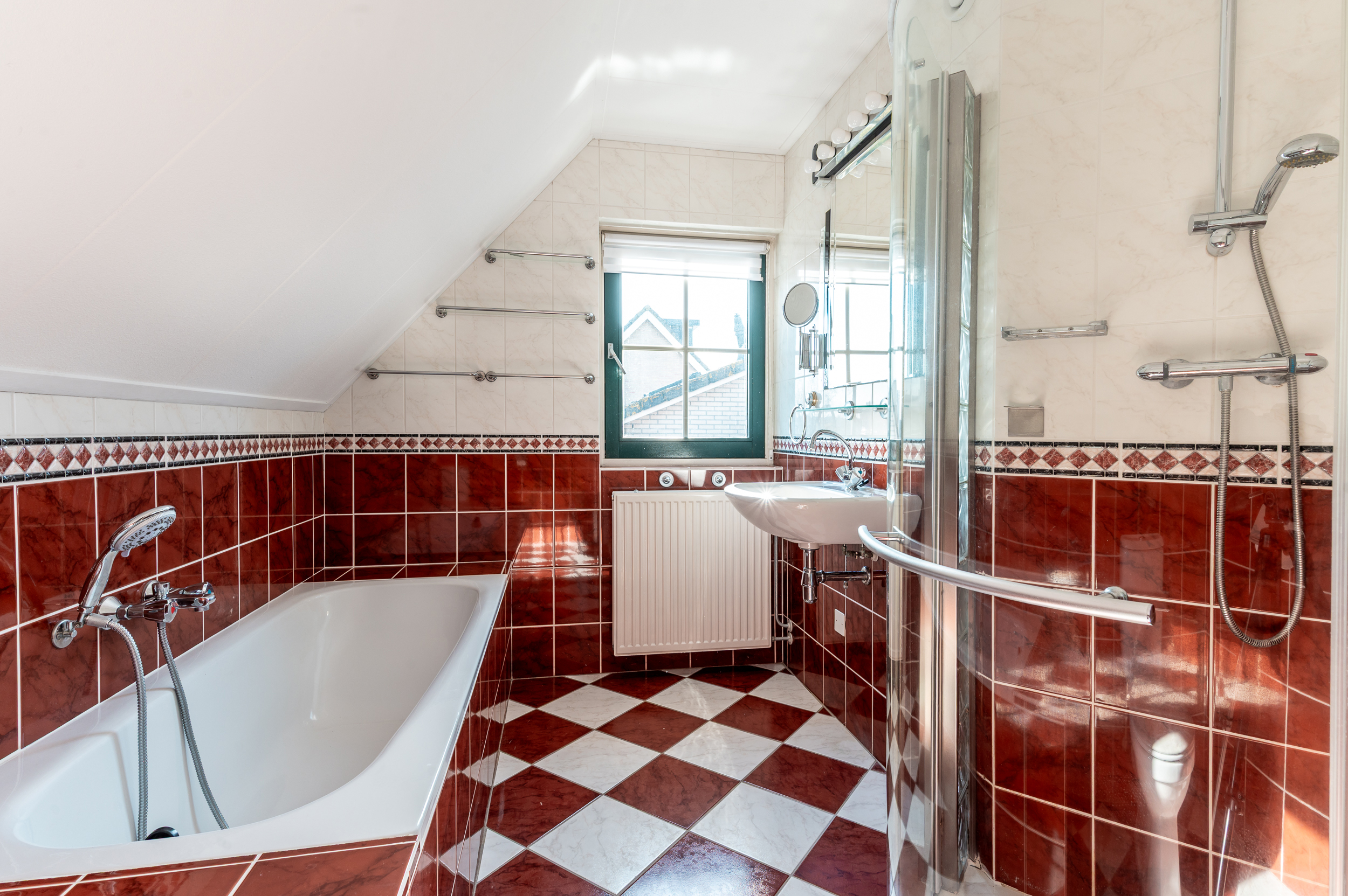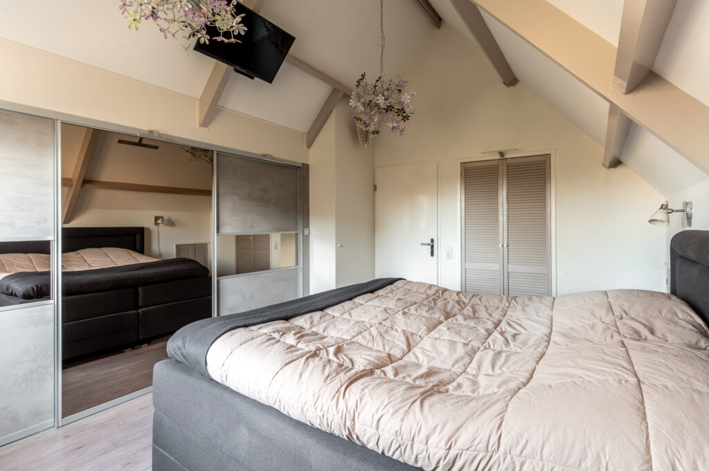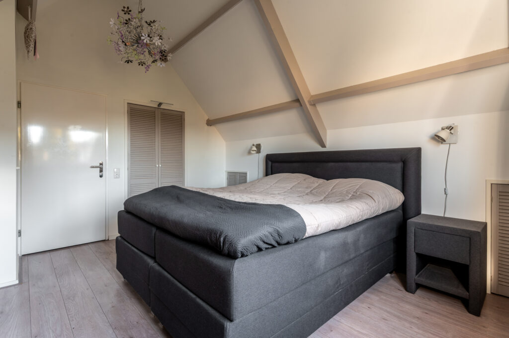 Zeer ruime overloop, welke toegang geeft aan de 3 slaapkamers van goed formaat (ca. 12 / 11 / 8 m²). De ouderslaapkamer heeft plafond welke helemaal tot in de nok toeloopt. Dit geeft het gevoel van grandeur, maar ook de riante en luxe op maat gemaakte kledingkasten met schuifdeuren dragen hier aan bij. De timmerman heeft de ruimte achter het bed perfect ingedeeld. Achter de knieschotten is een zee aan ruimte, welke toegankelijk is via twee ingangen. Zeer nette, geheel betegelde badkamer met wastafel, toilet, heerlijk ligbad en ruime inloopdouche.