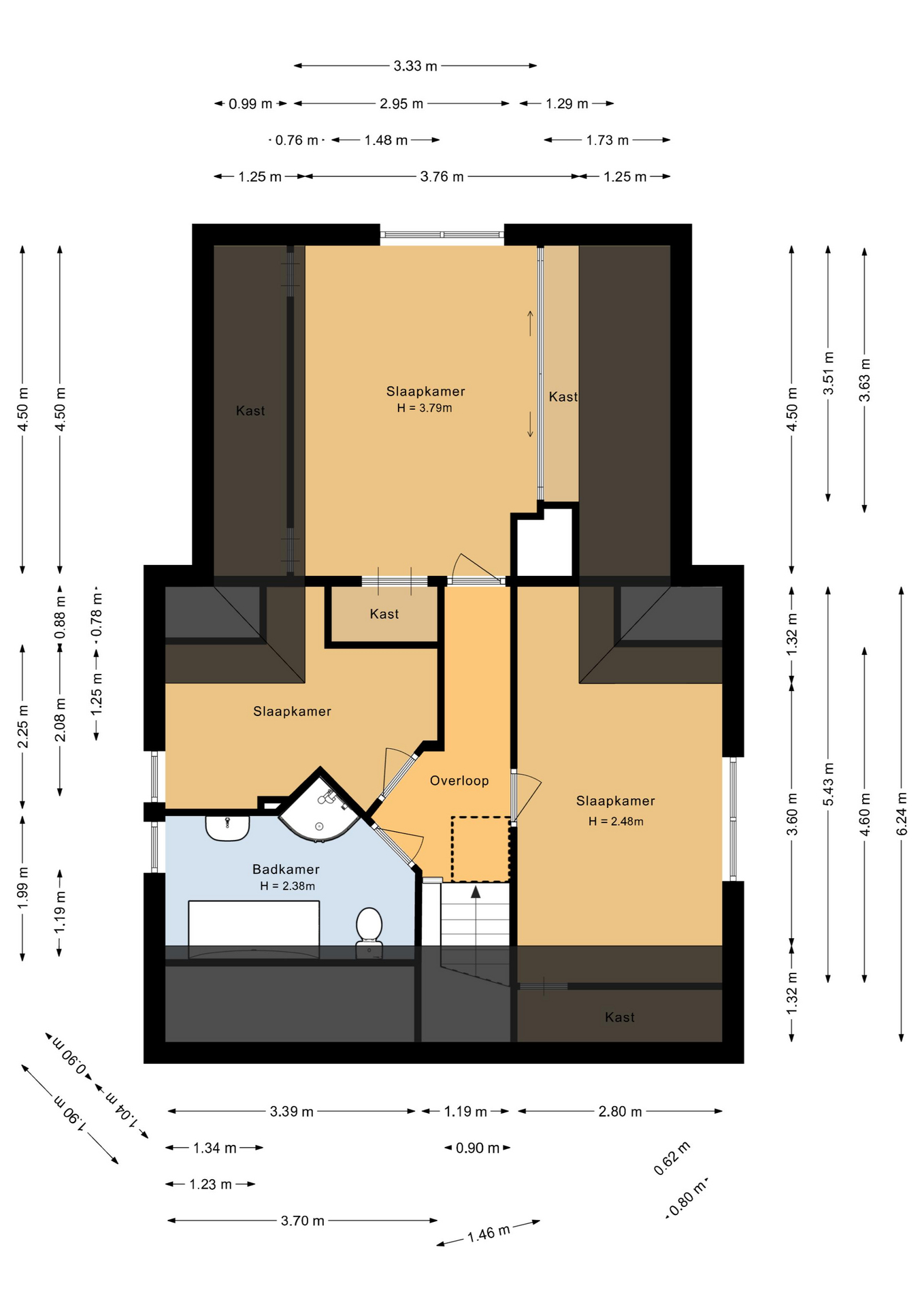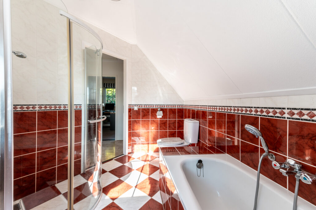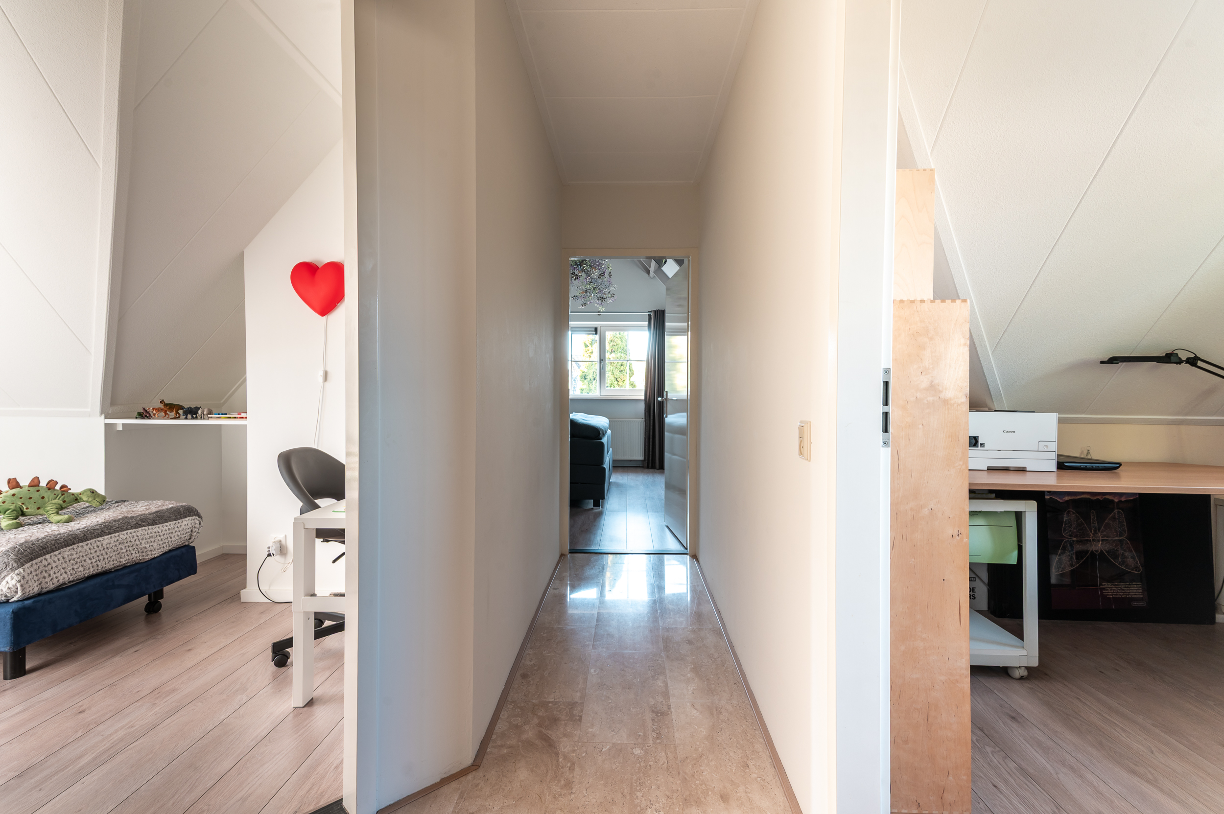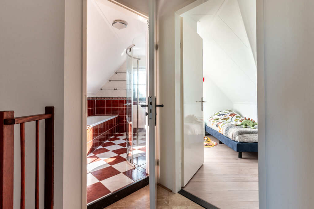Zeer ruime overloop, welke toegang geeft aan de 3 slaapkamers van goed formaat (ca. 12 / 11 / 8 m²). De ouderslaapkamer heeft plafond welke helemaal tot in de nok toeloopt. Dit geeft het gevoel van grandeur, maar ook de riante en luxe op maat gemaakte kledingkasten met schuifdeuren dragen hier aan bij. De timmerman heeft de ruimte achter het bed perfect ingedeeld. Achter de knieschotten is een zee aan ruimte, welke toegankelijk is via twee ingangen. Zeer nette, geheel betegelde badkamer met wastafel, toilet, heerlijk ligbad en ruime inloopdouche.