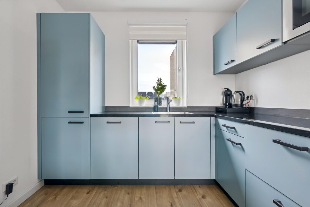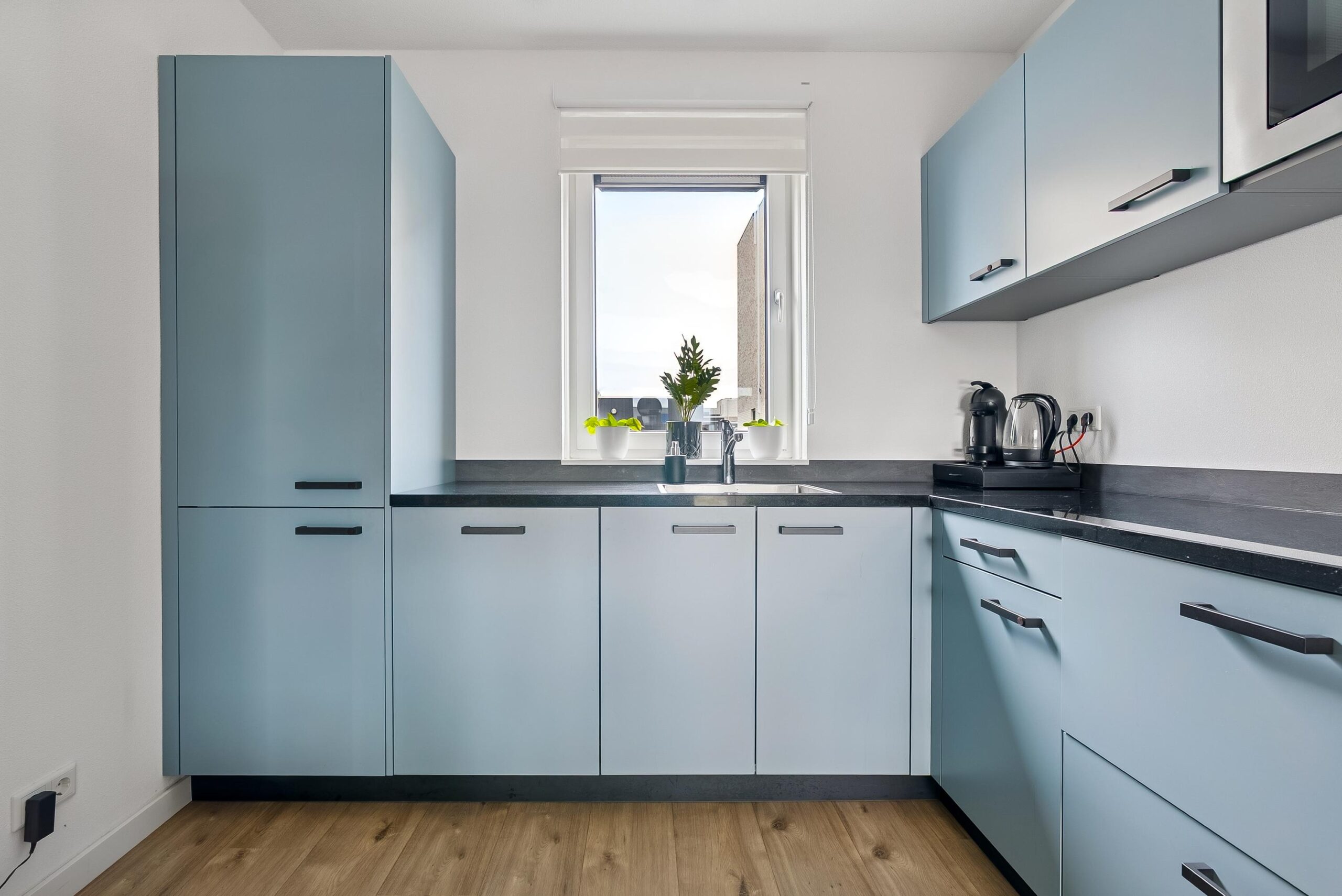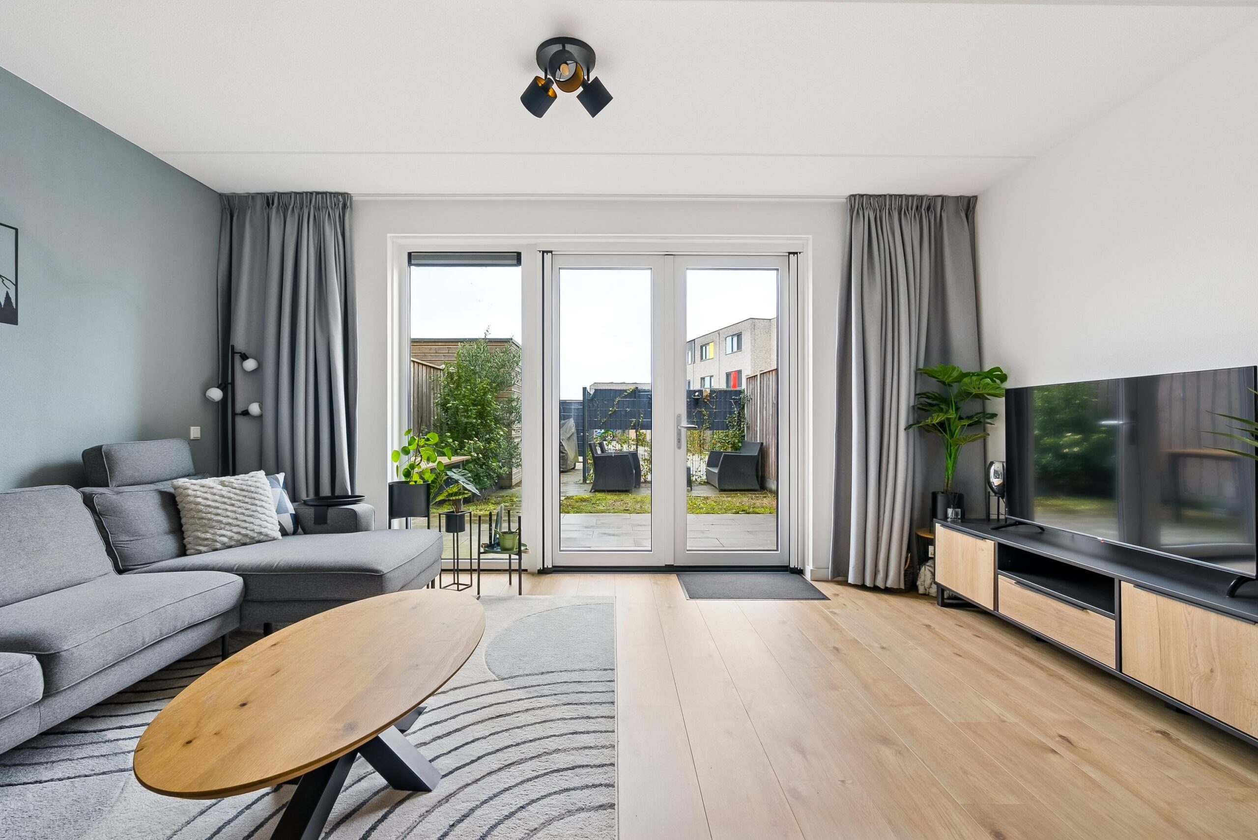 De begane grond beschikt over een ruime en lichte woonkamer met een prettige indeling en grote raampartijen. De openslaande deuren naar de achtertuin zorgen voor een fijne verbinding tussen binnen en buiten en laten veel natuurlijk licht binnen. De moderne L-vormige keuken is uitgevoerd met een stijlvol composiet werkblad en voorzien van diverse inbouwapparatuur, waardoor koken hier zowel praktisch als plezierig is. De open opzet maakt deze ruimte uitermate geschikt voor gezellige diners en lange avonden met familie of vrienden.