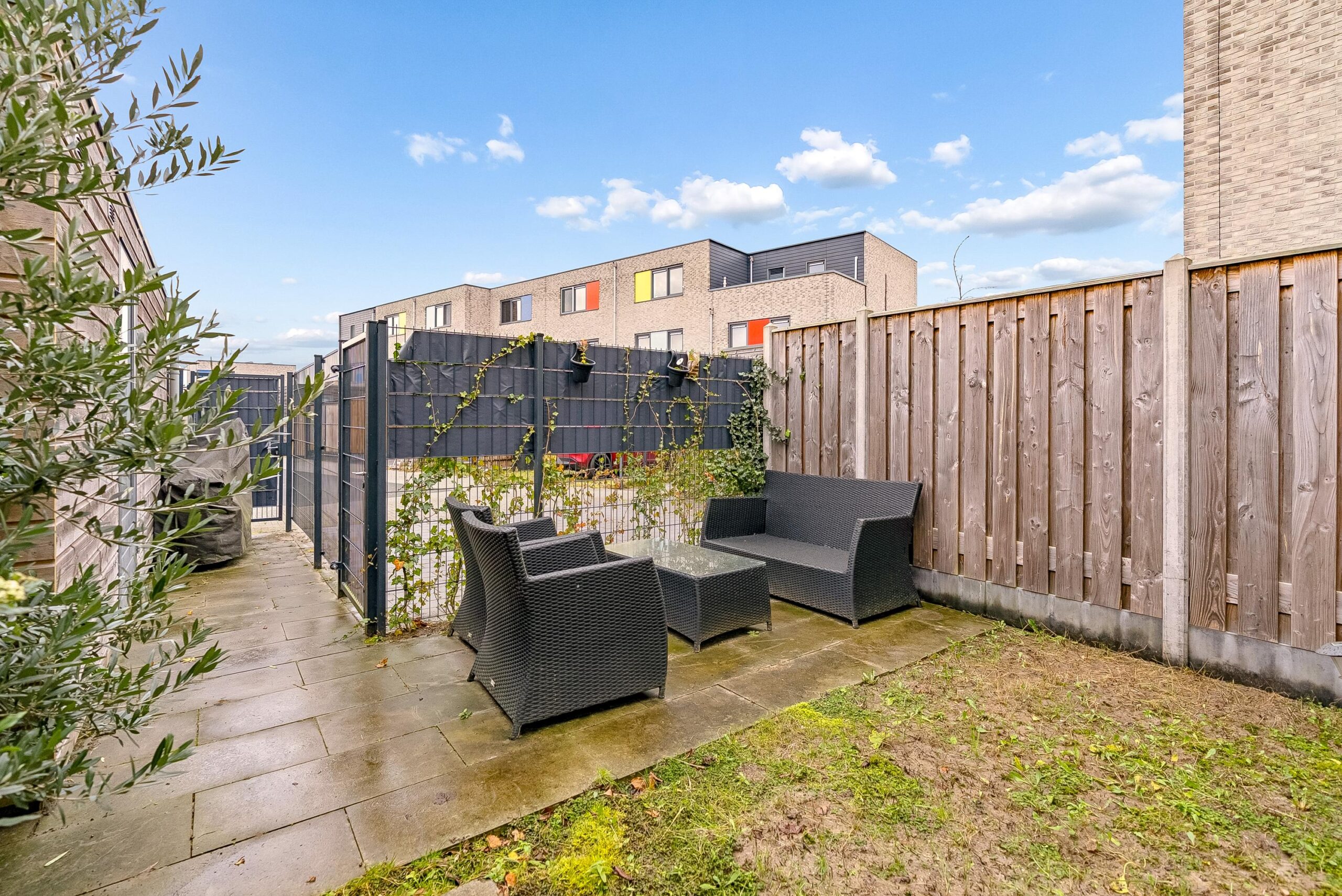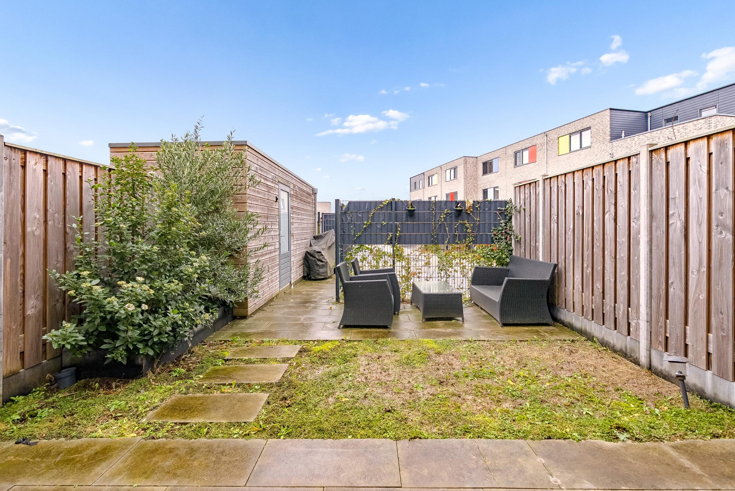De ruime achtertuin (12 x 5 meter) is gelegen op het noordwesten en is grotendeels betegeld. Hier kunt u heerlijk genieten van de middag/avondzon.