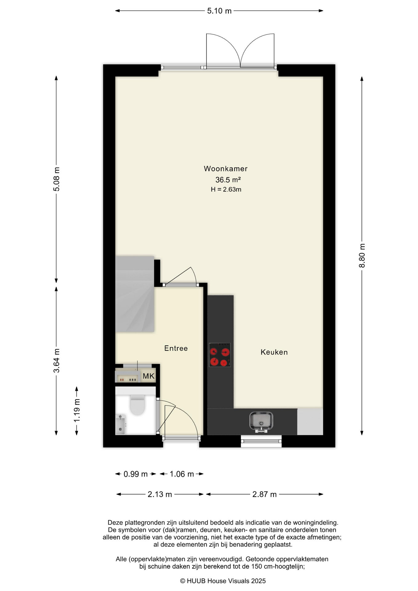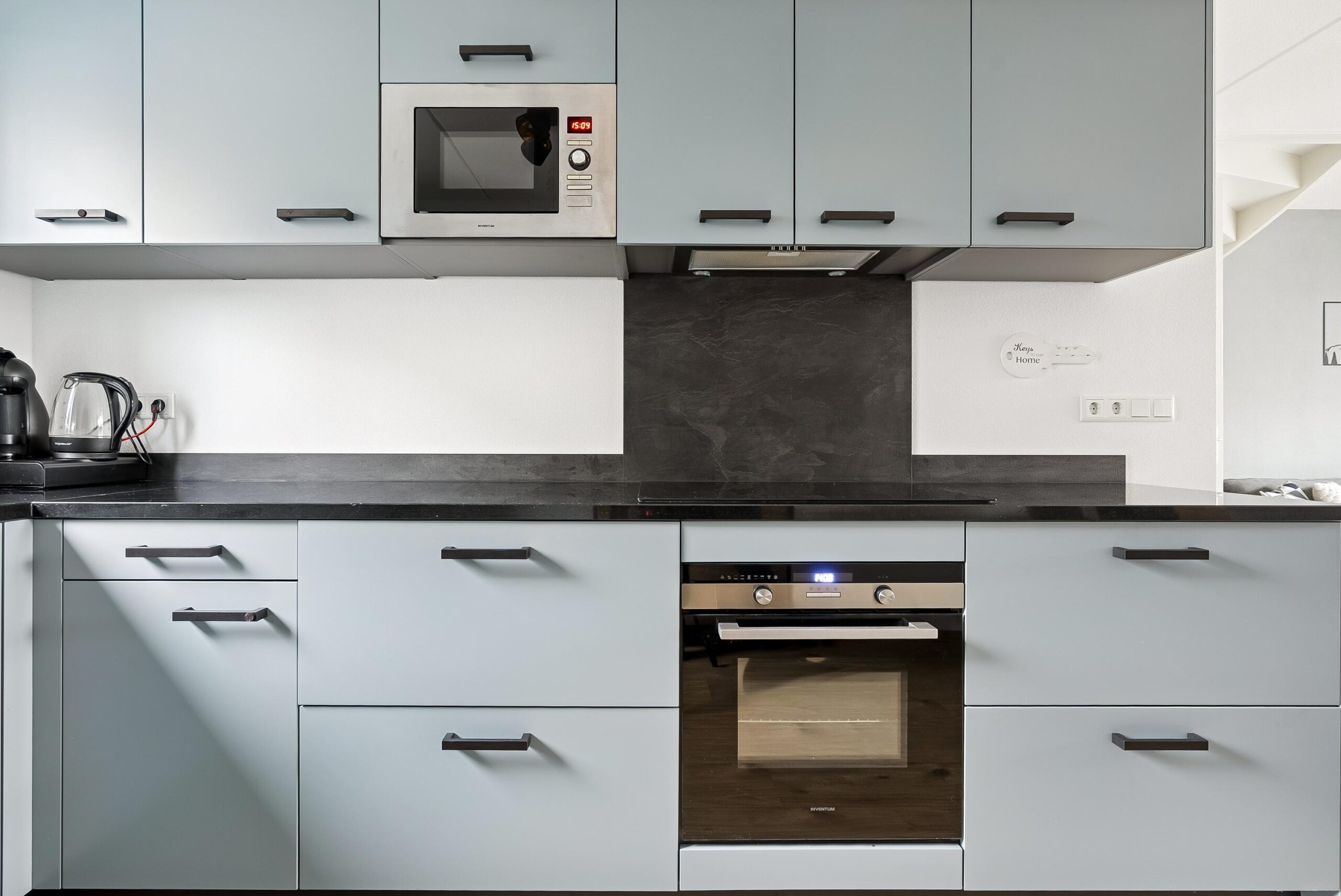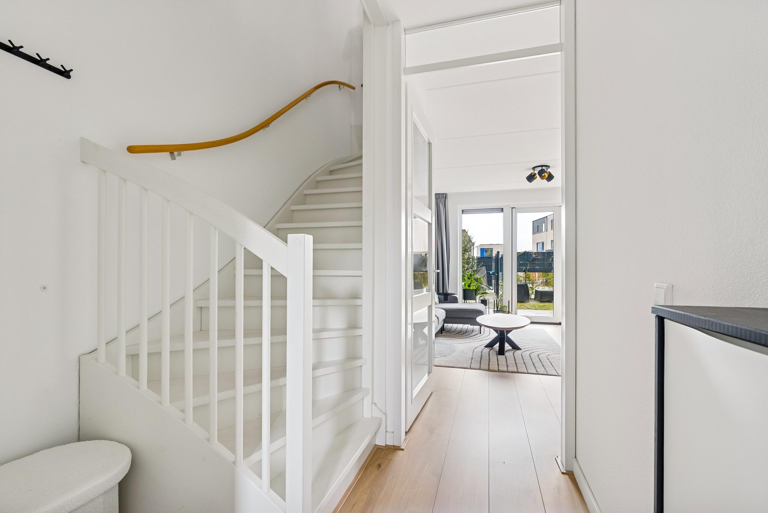De begane grond beschikt over een ruime en lichte woonkamer met een prettige indeling en grote raampartijen. De openslaande deuren naar de achtertuin zorgen voor een fijne verbinding tussen binnen en buiten en laten veel natuurlijk licht binnen. De moderne L-vormige keuken is uitgevoerd met een stijlvol composiet werkblad en voorzien van diverse inbouwapparatuur, waardoor koken hier zowel praktisch als plezierig is. De open opzet maakt deze ruimte uitermate geschikt voor gezellige diners en lange avonden met familie of vrienden.