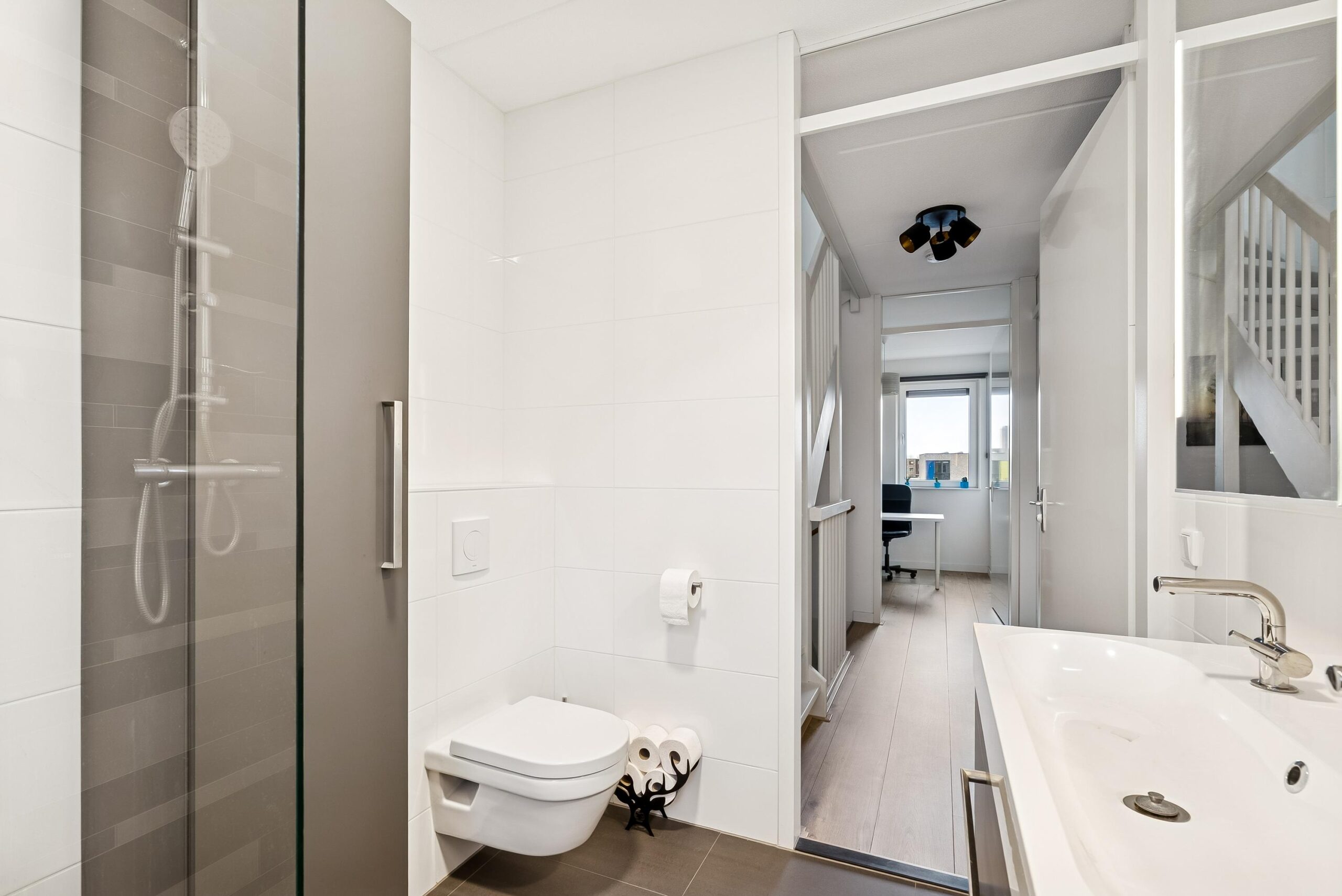 Op de eerste verdieping bevinden zich drie goed bemeten slaapkamers, allen comfortabel en licht. De moderne badkamer is eveneens op deze verdieping gesitueerd en is compleet uitgevoerd met een inloopdouche, dubbele wastafel met meubel, toilet en een designradiator. Zowel natuurlijke als mechanische ventilatie zorgen hier voor een prettig en gezond binnenklimaat.