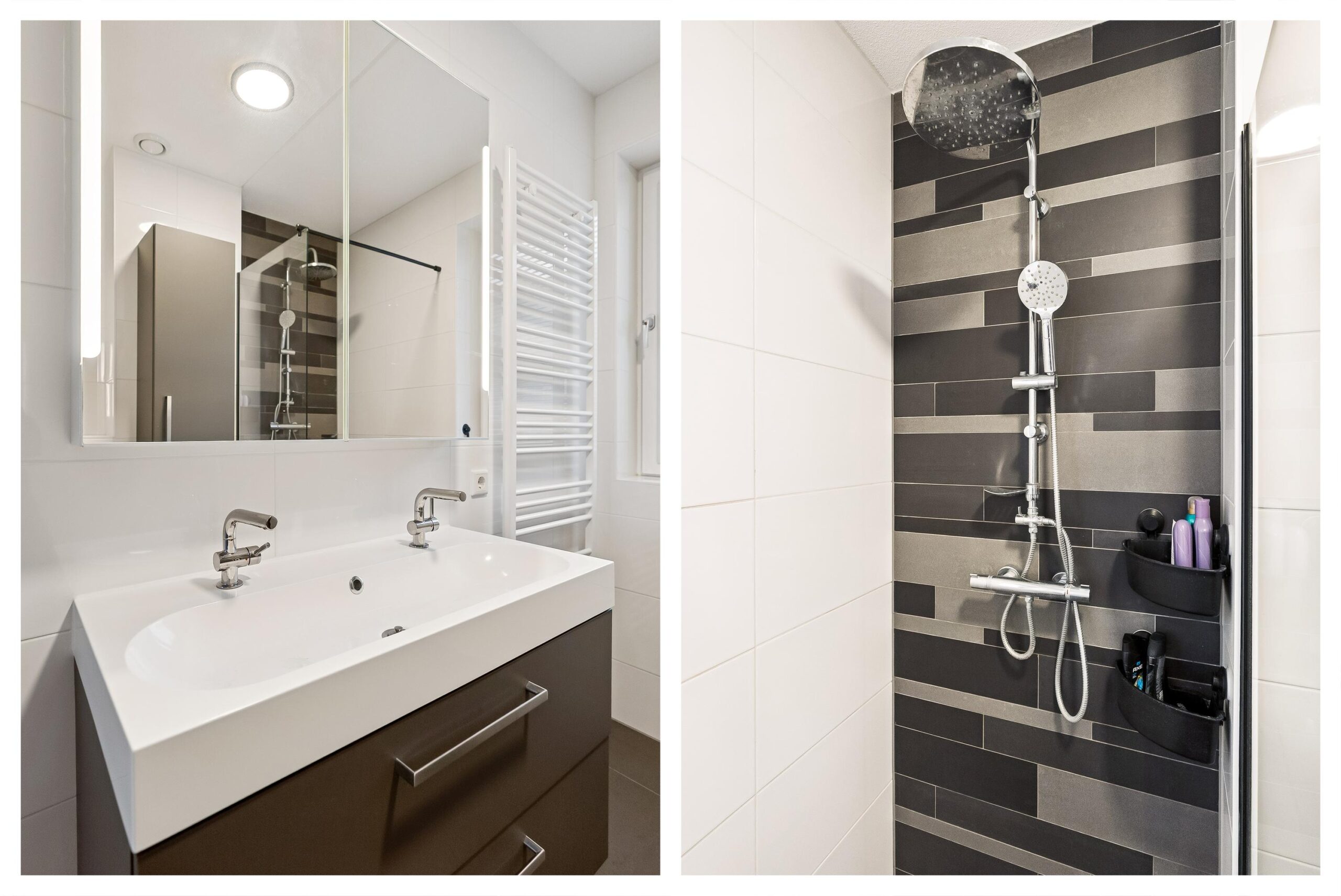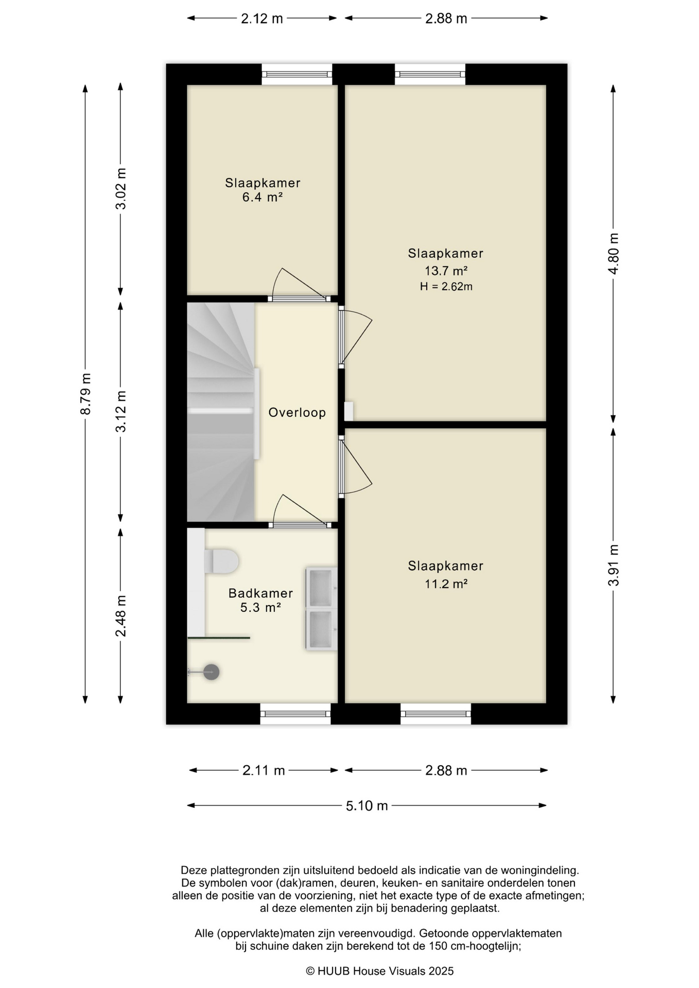 Overloop, slaapkamer 1 (ca. 14 m²), slaapkamer 2 (ca. 11 m²), slaapkamer 3 (ca. 6 m²), moderne badkamer voorzien van toilet, dubbele wastafel met meubel, inloopdouche, designradiator en natuurlijke/mechanische ventilatie.