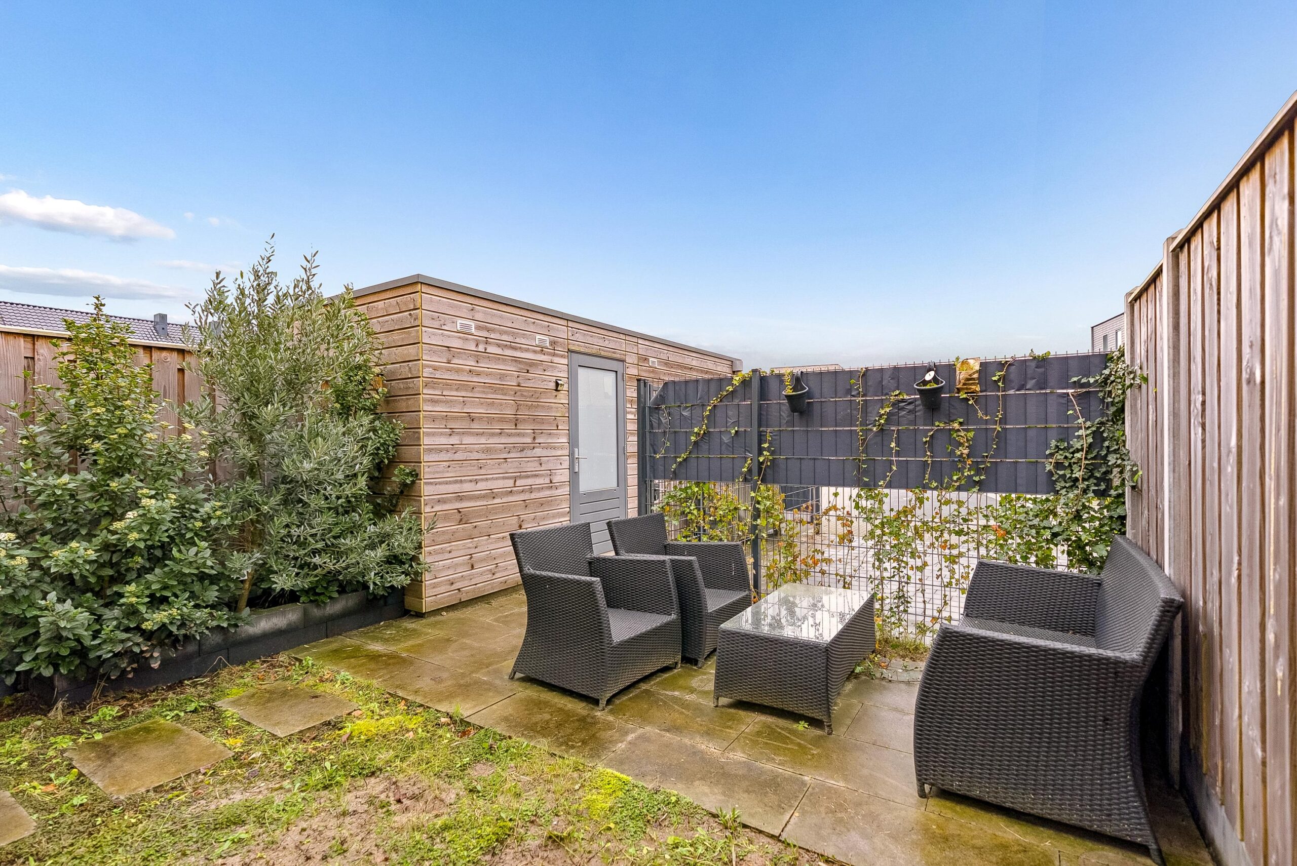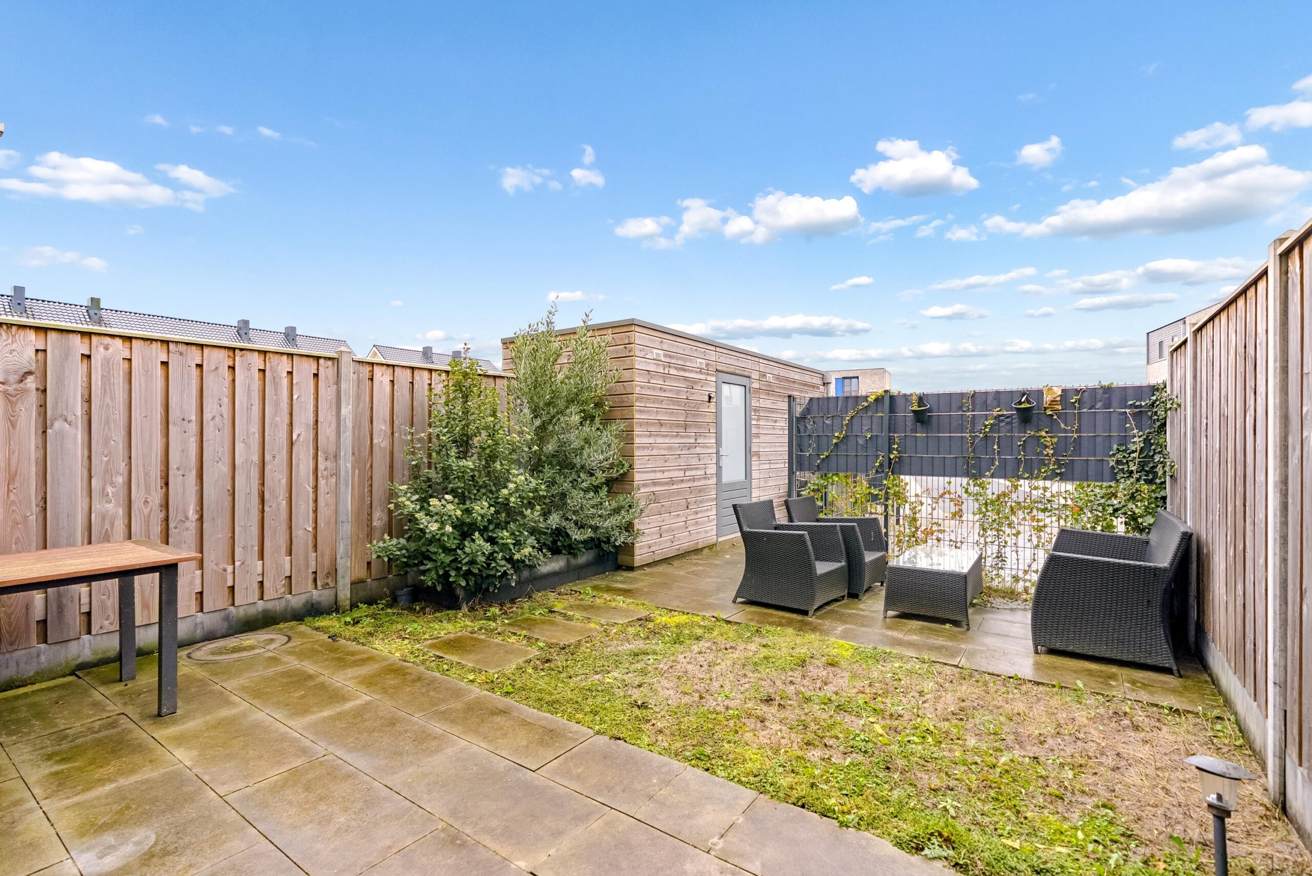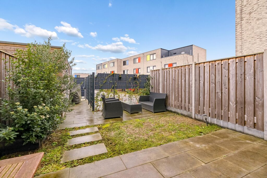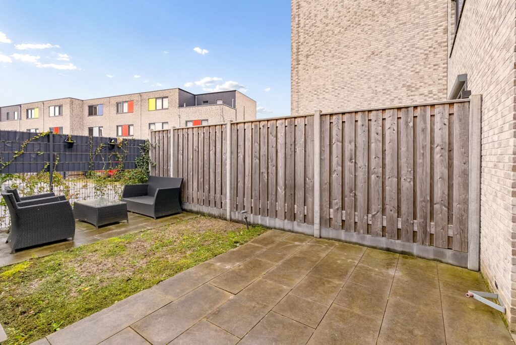 De ruime achtertuin (12 x 5 meter) is gelegen op het noordwesten en is grotendeels betegeld. Hier kunt u heerlijk genieten van de middag/avondzon.